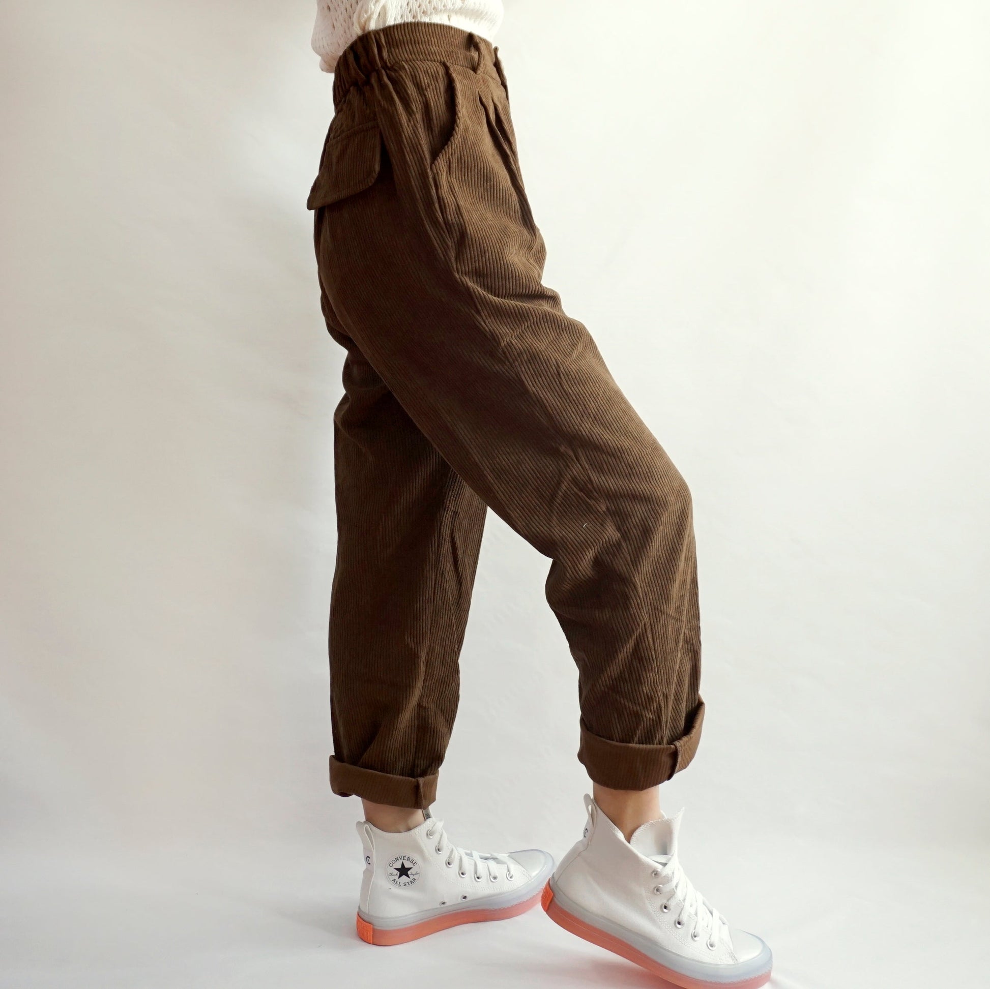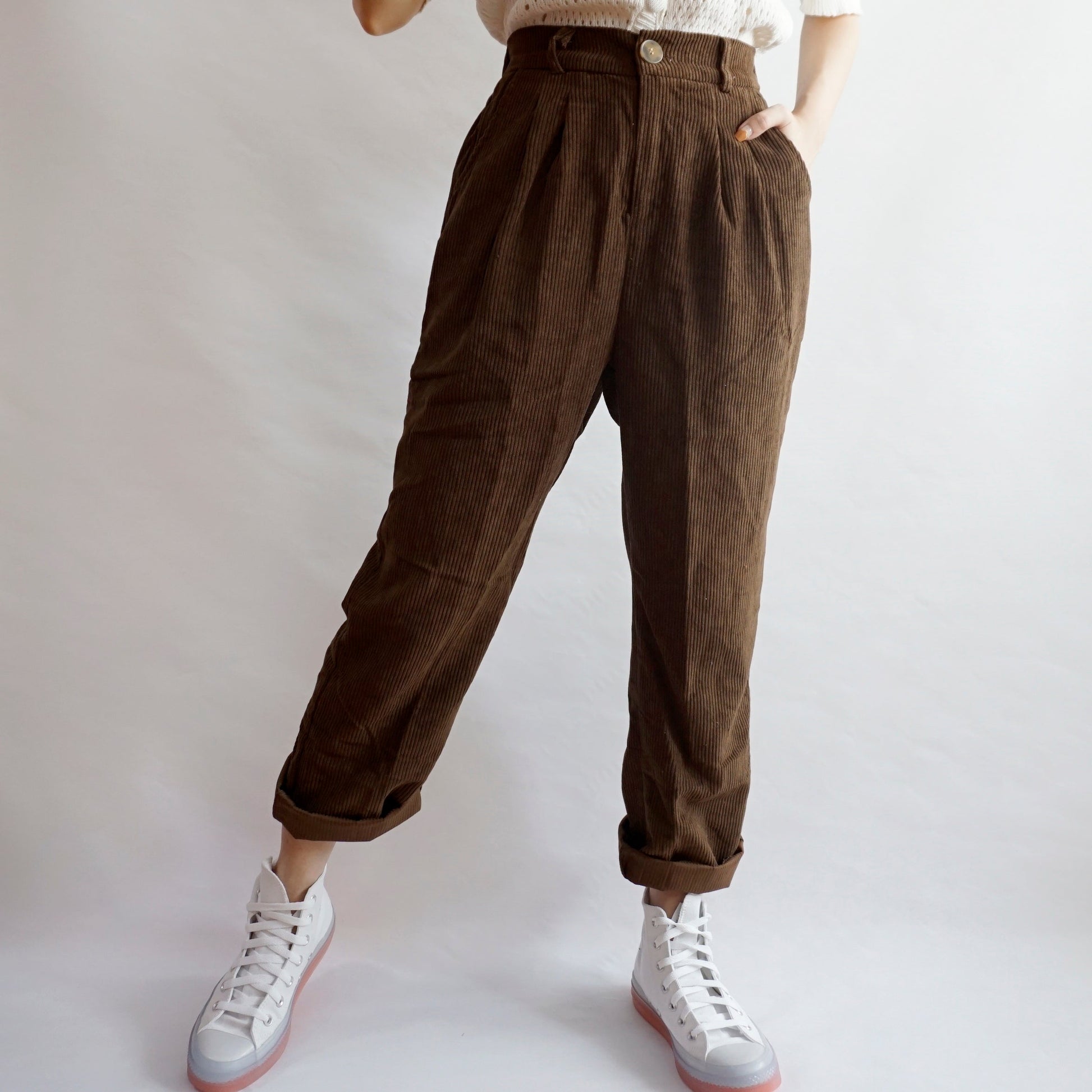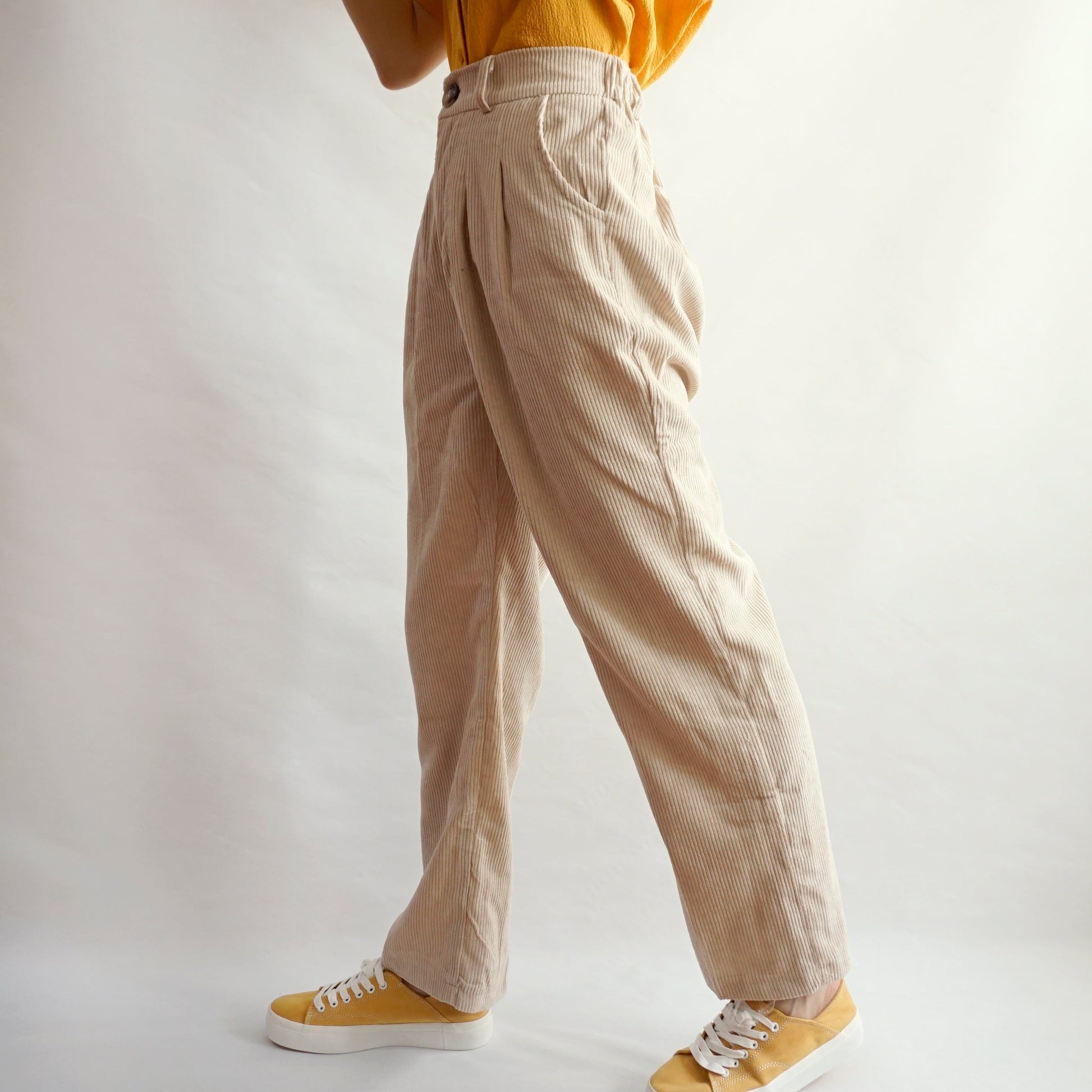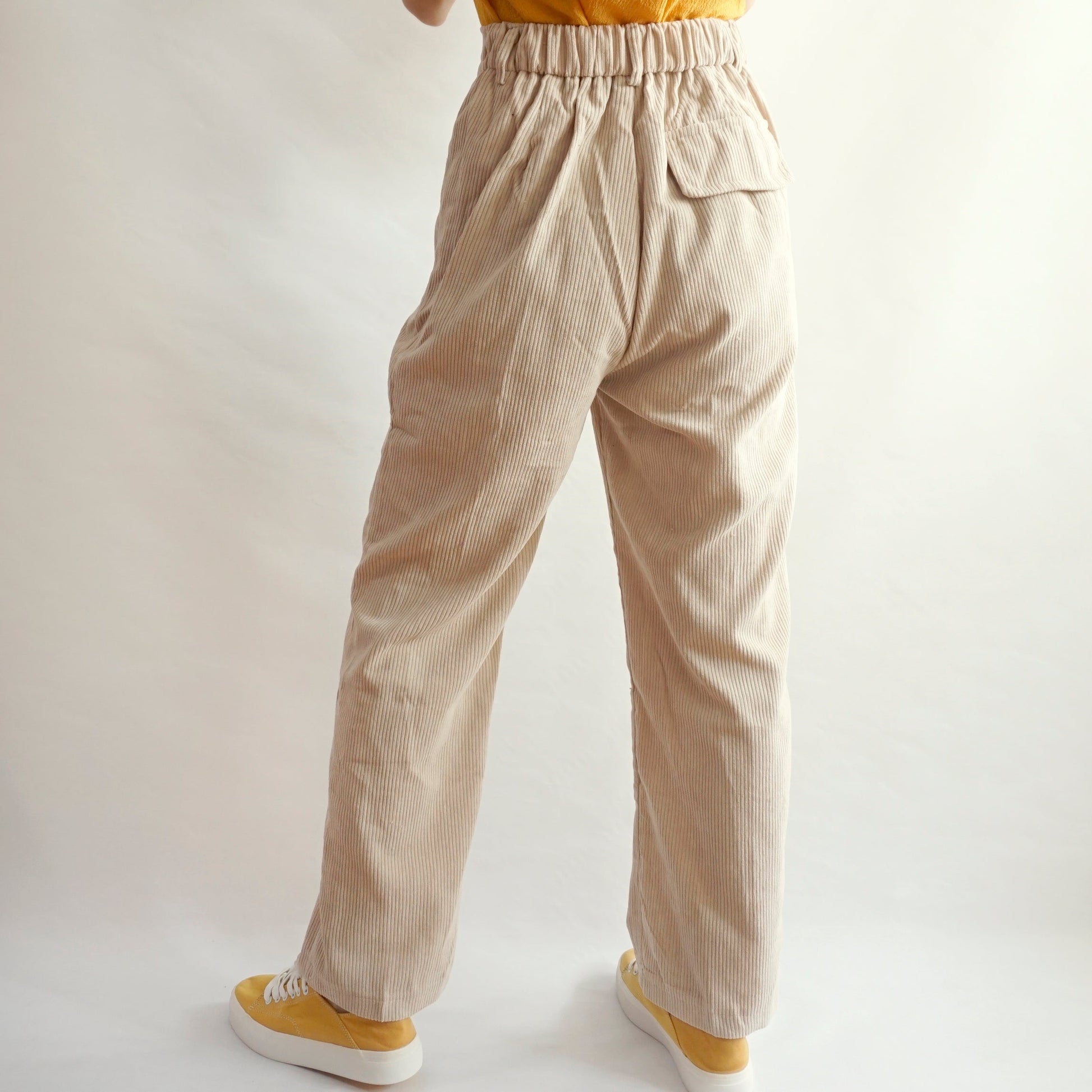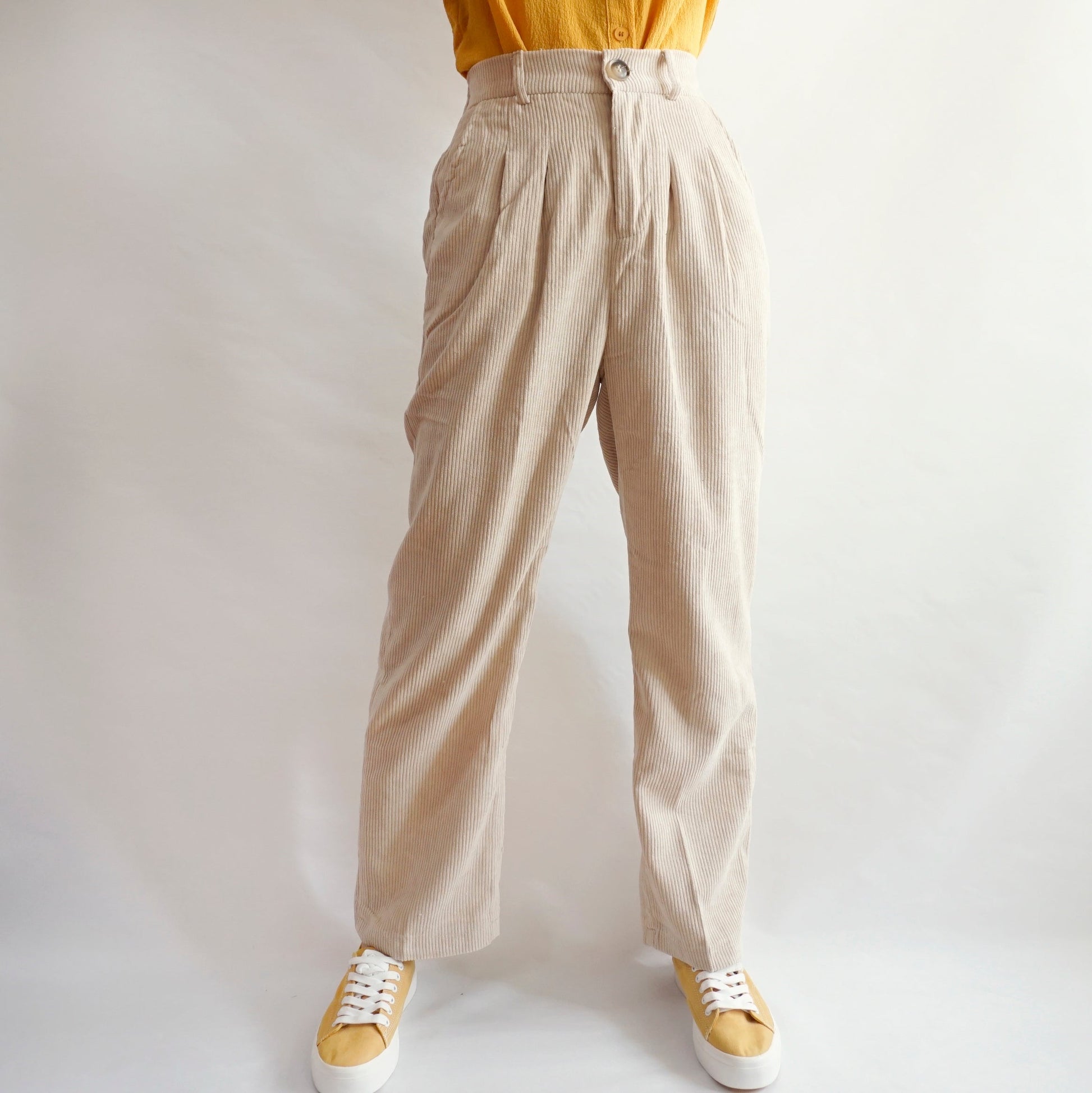 High waisted corduroy pants with a straight leg fit and pleated details. Button and zip front with belt loops, side pockets and an elastic back. Cut open button hole with scissors.