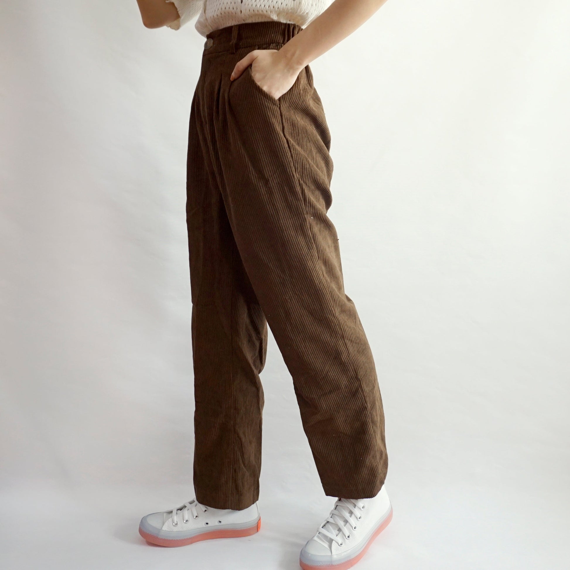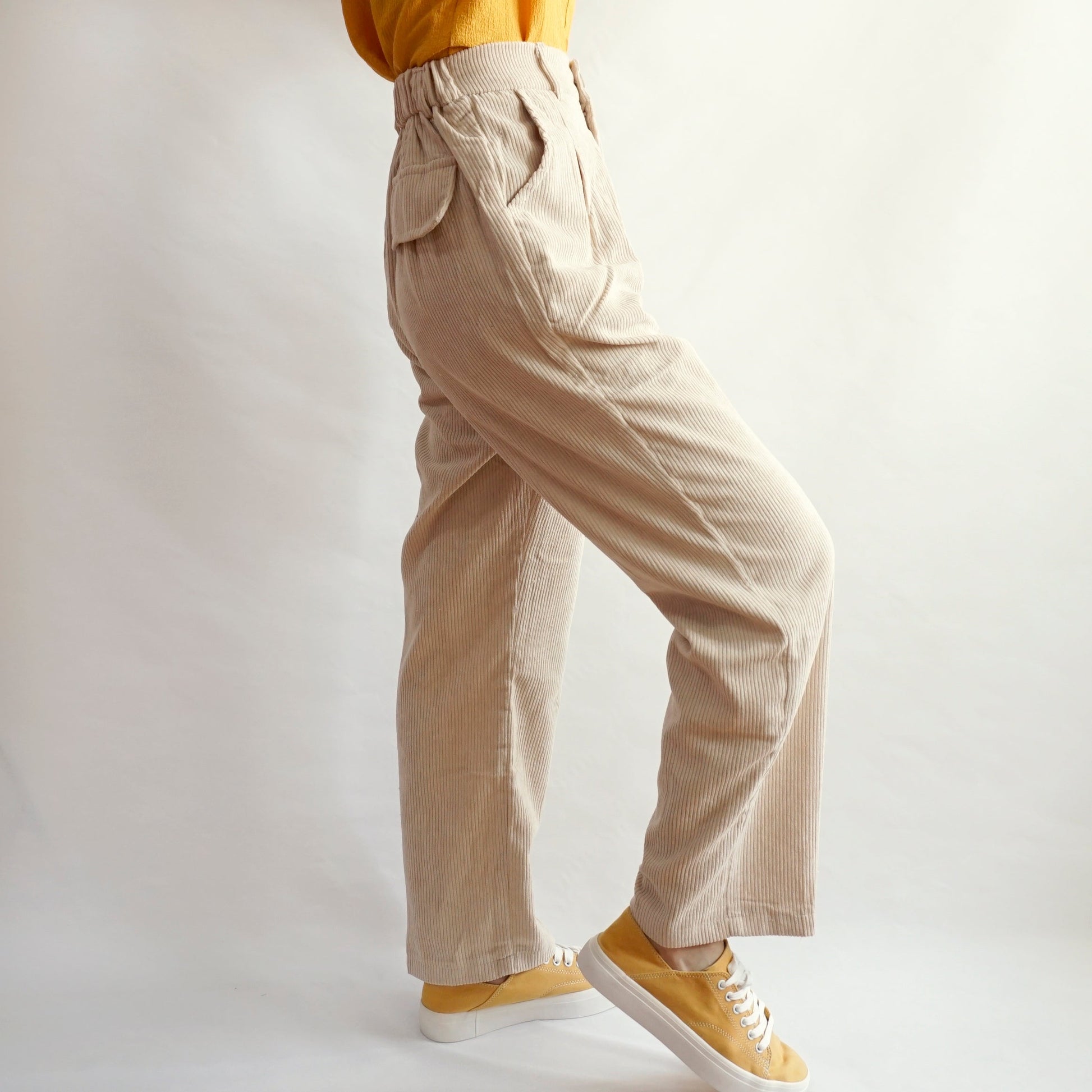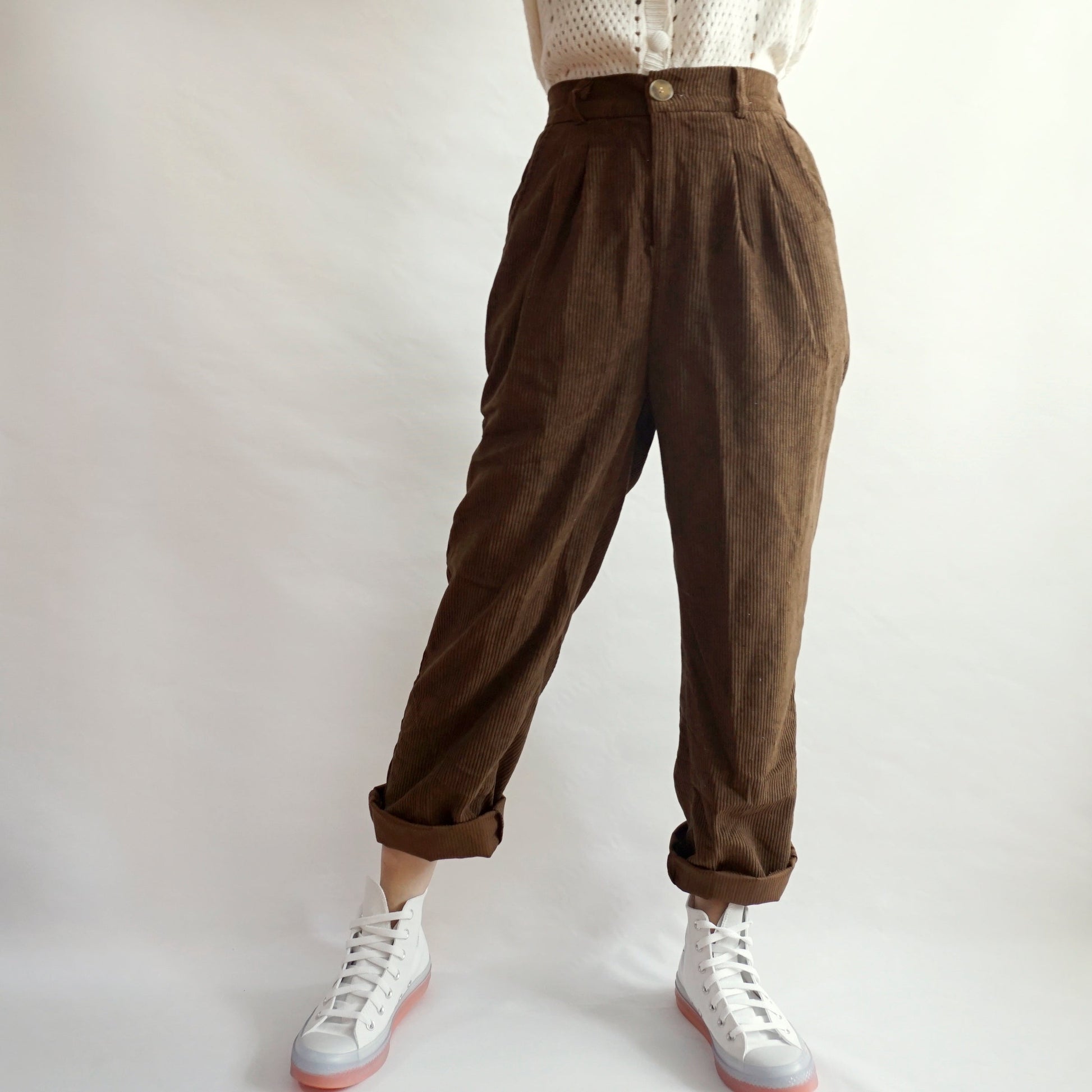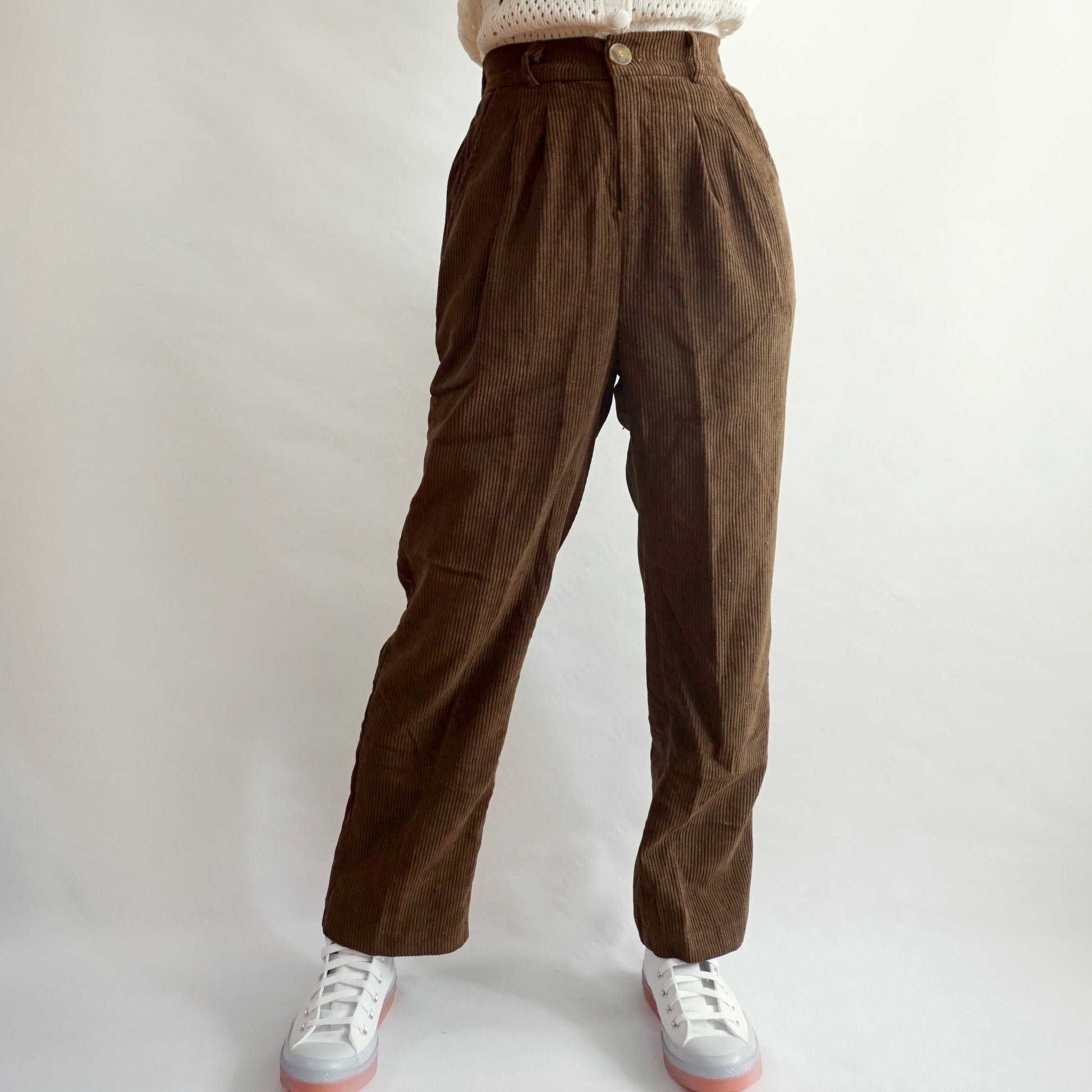 High waisted corduroy pants with a straight leg fit and pleated details. Button and zip front with belt loops, side pockets and an elastic back. Cut open button hole with scissors.