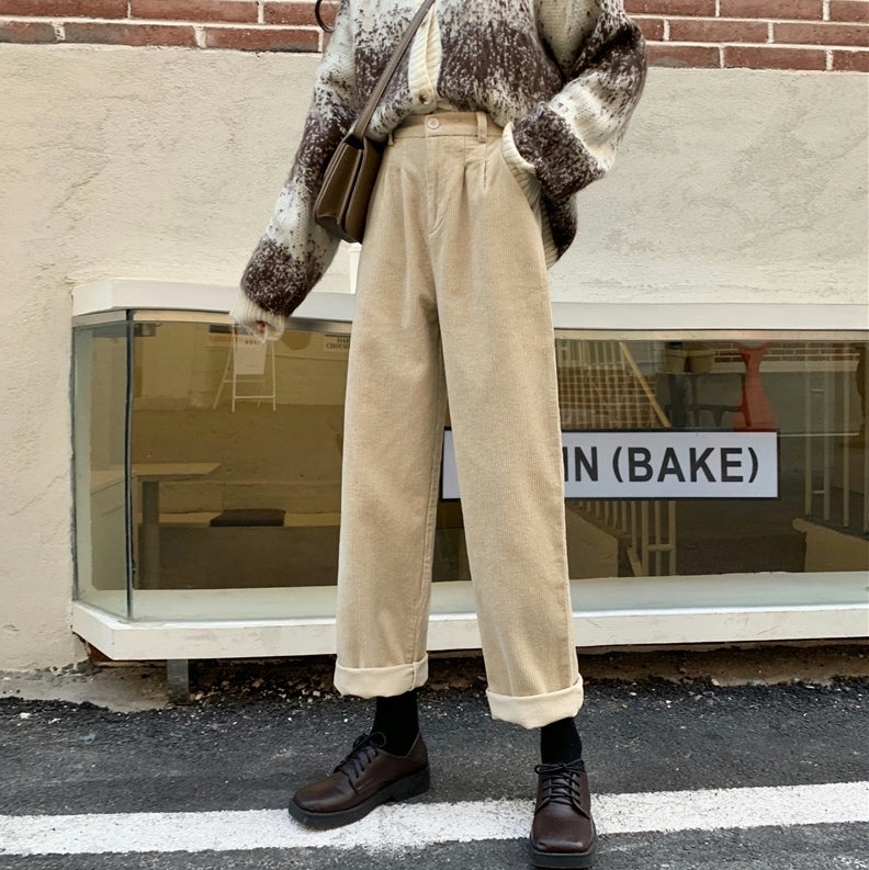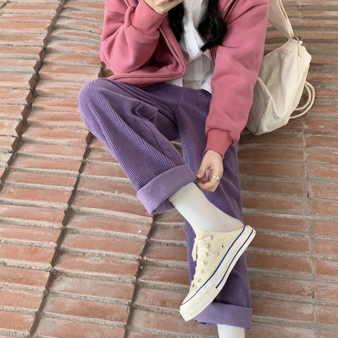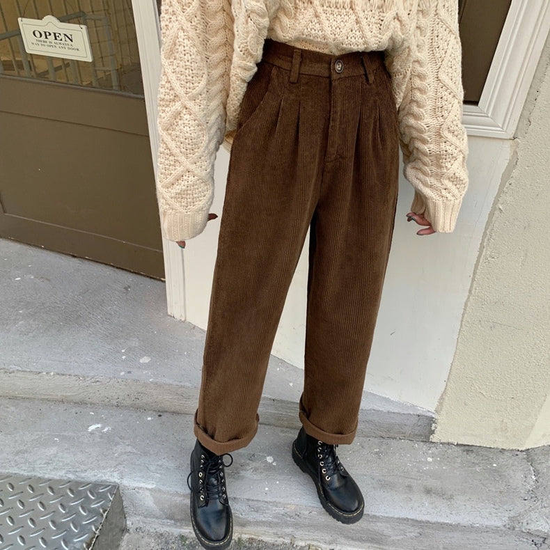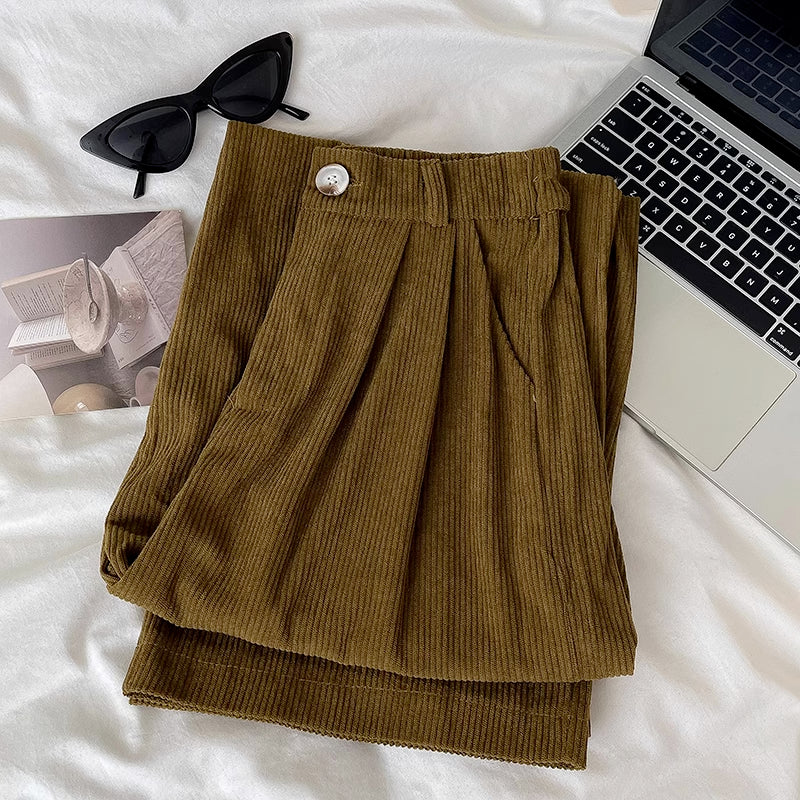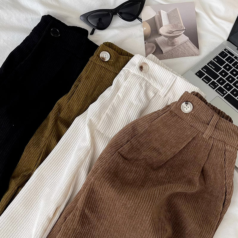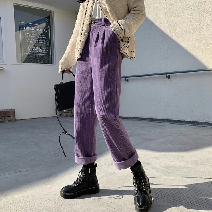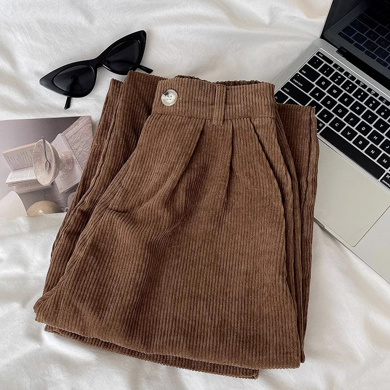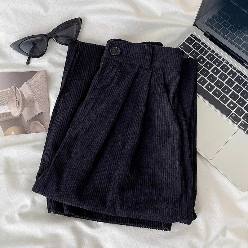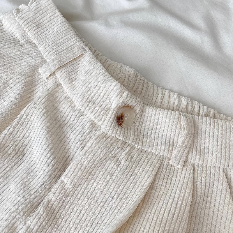 High waisted corduroy pants with a straight leg fit and pleated details. Button and zip front with belt loops, side pockets and an elastic back. Cut open button hole with scissors.