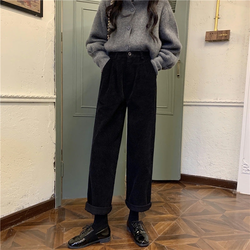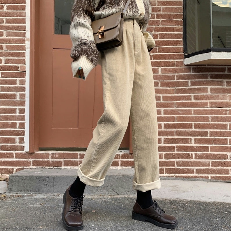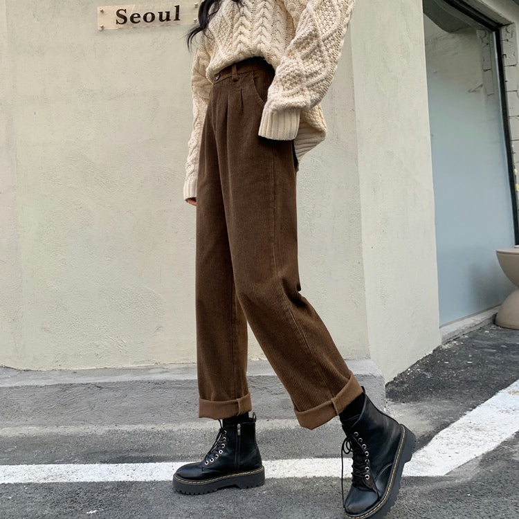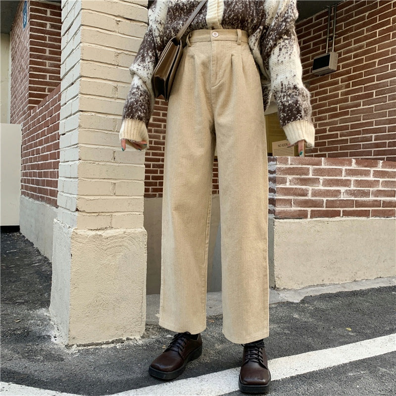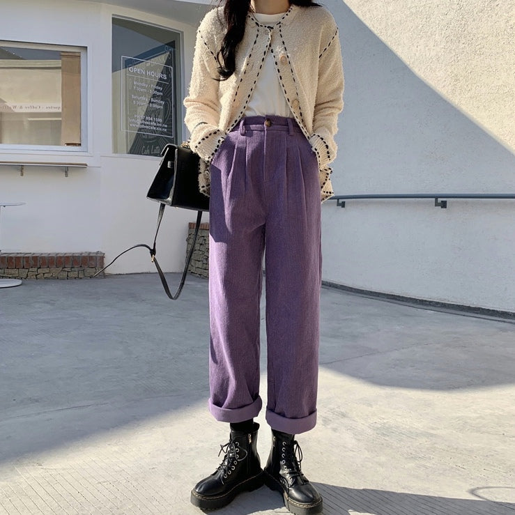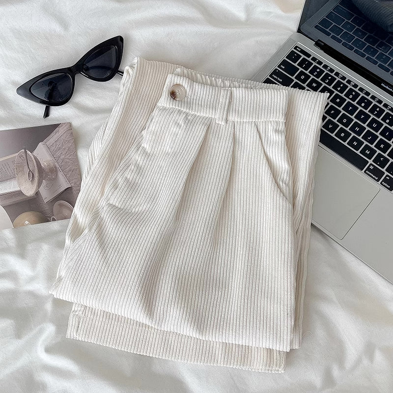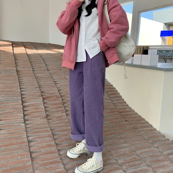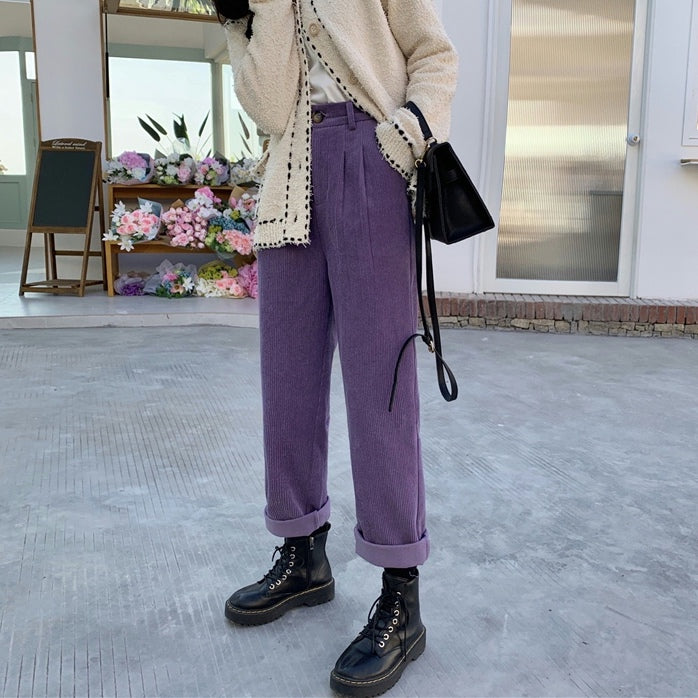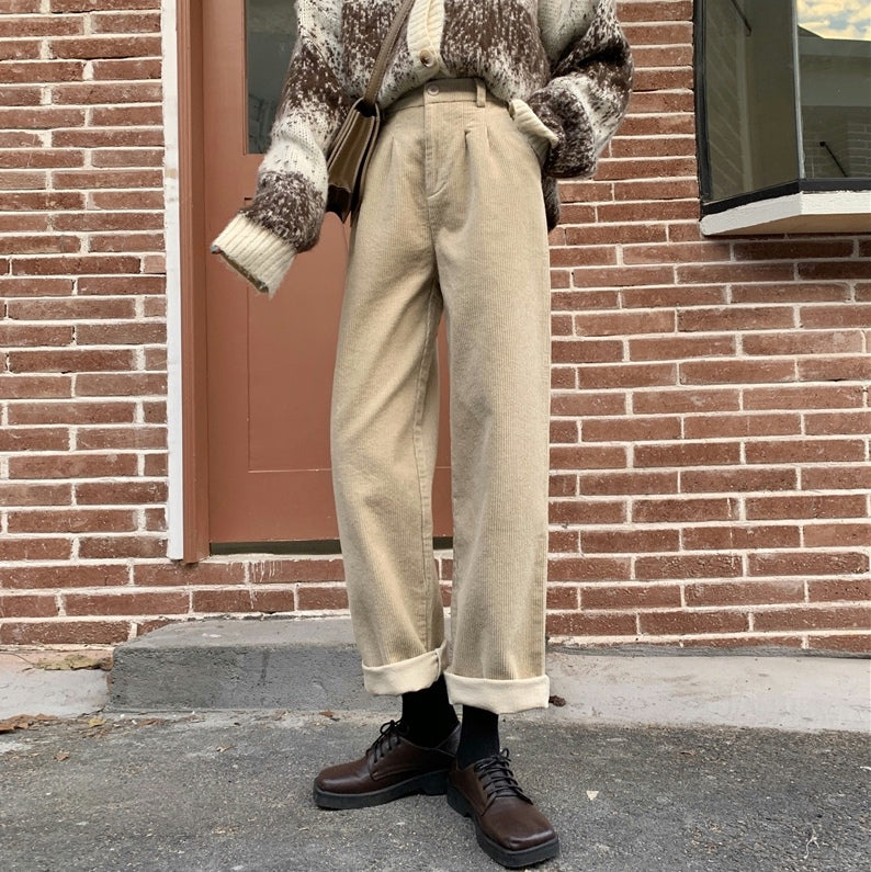 High waisted corduroy pants with a straight leg fit and pleated details. Button and zip front with belt loops, side pockets and an elastic back. Cut open button hole with scissors.
