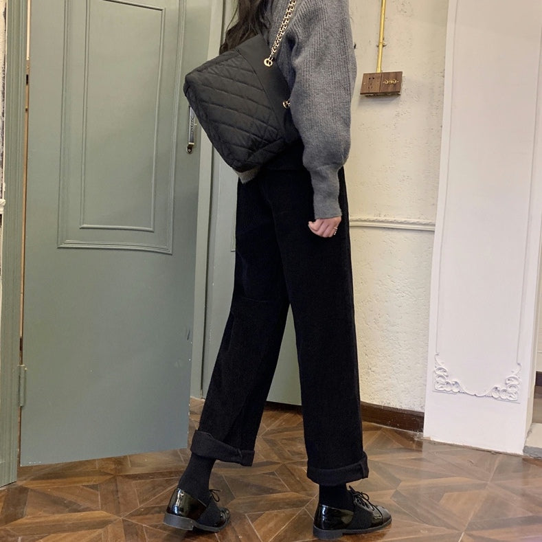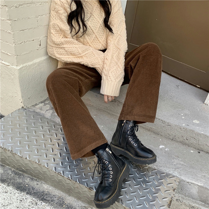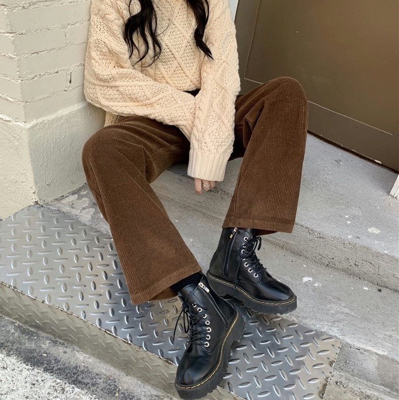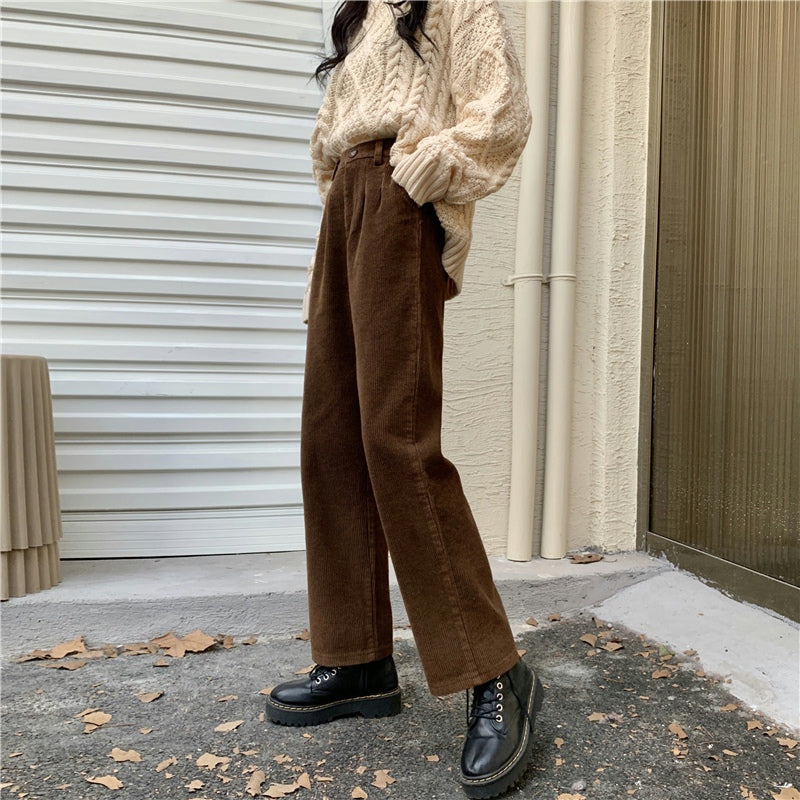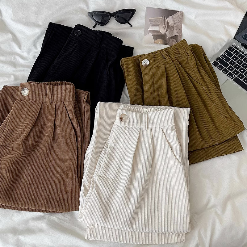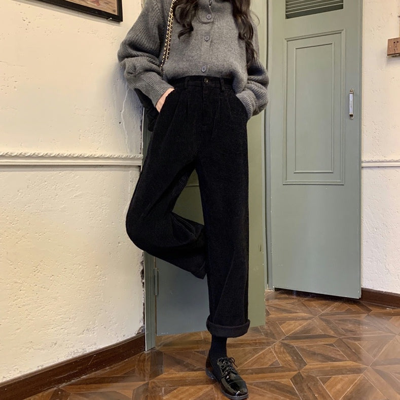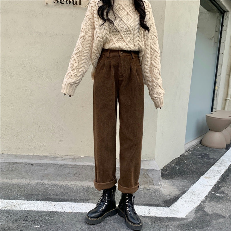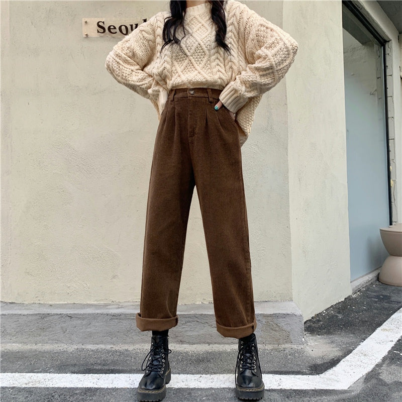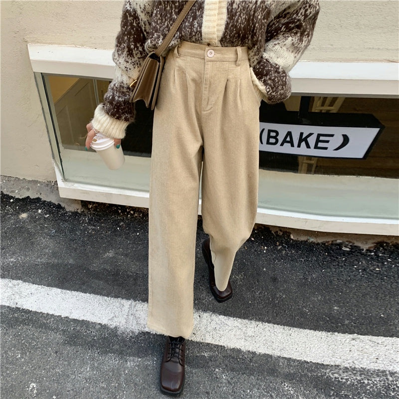 High waisted corduroy pants with a straight leg fit and pleated details. Button and zip front with belt loops, side pockets and an elastic back. Cut open button hole with scissors.