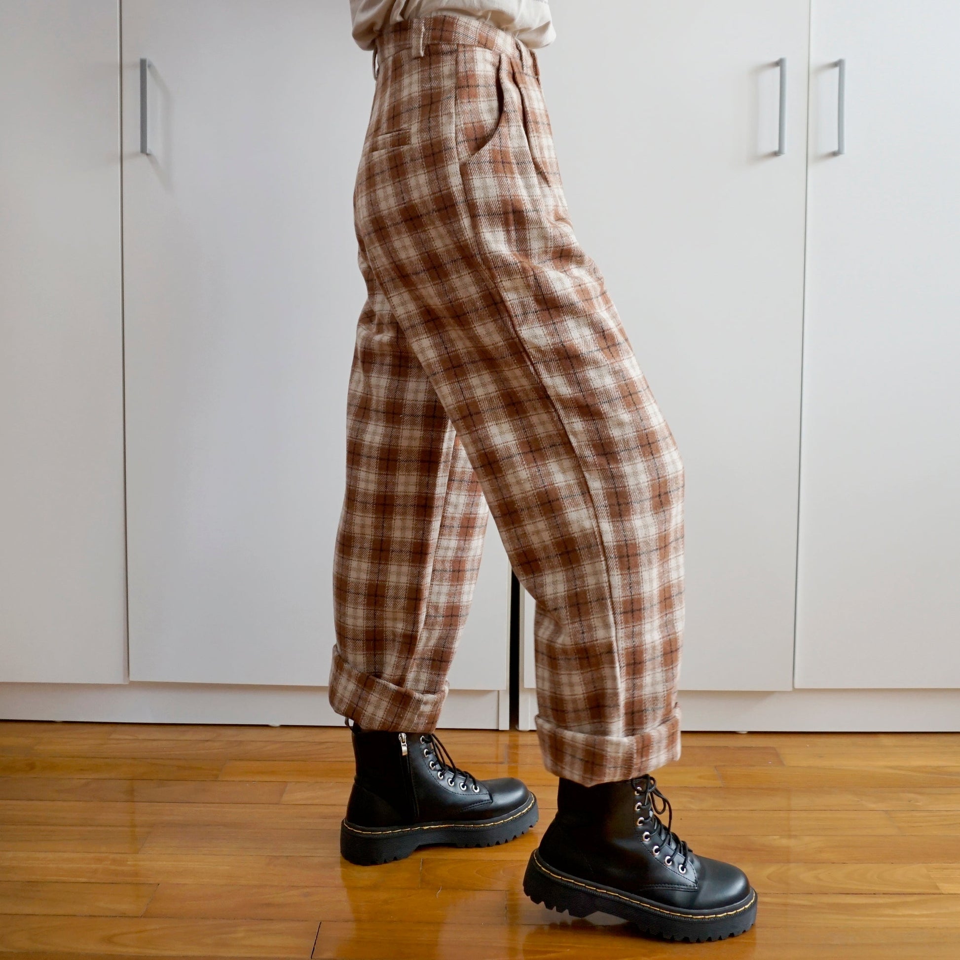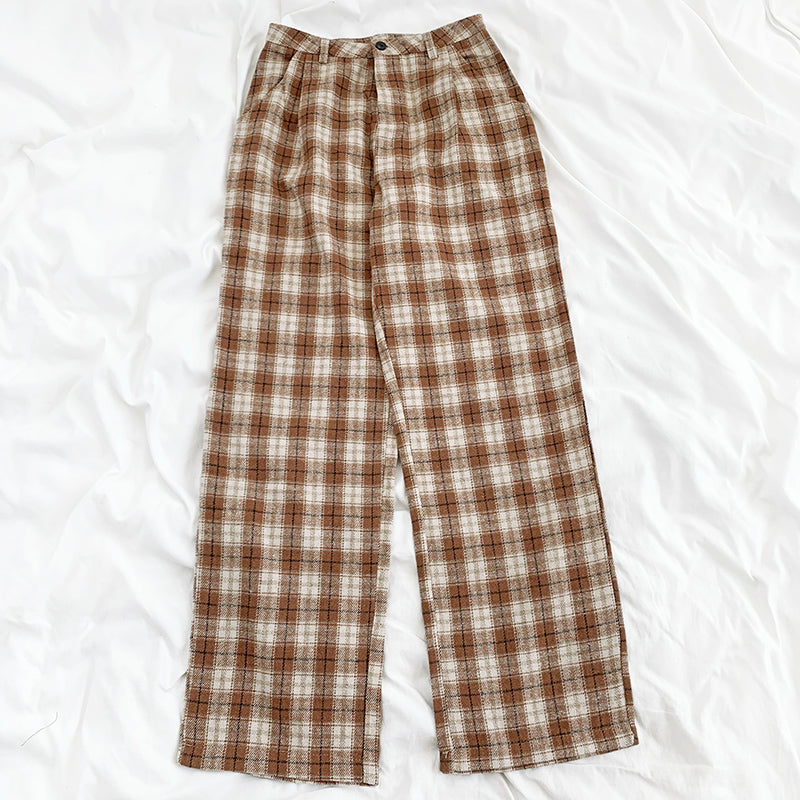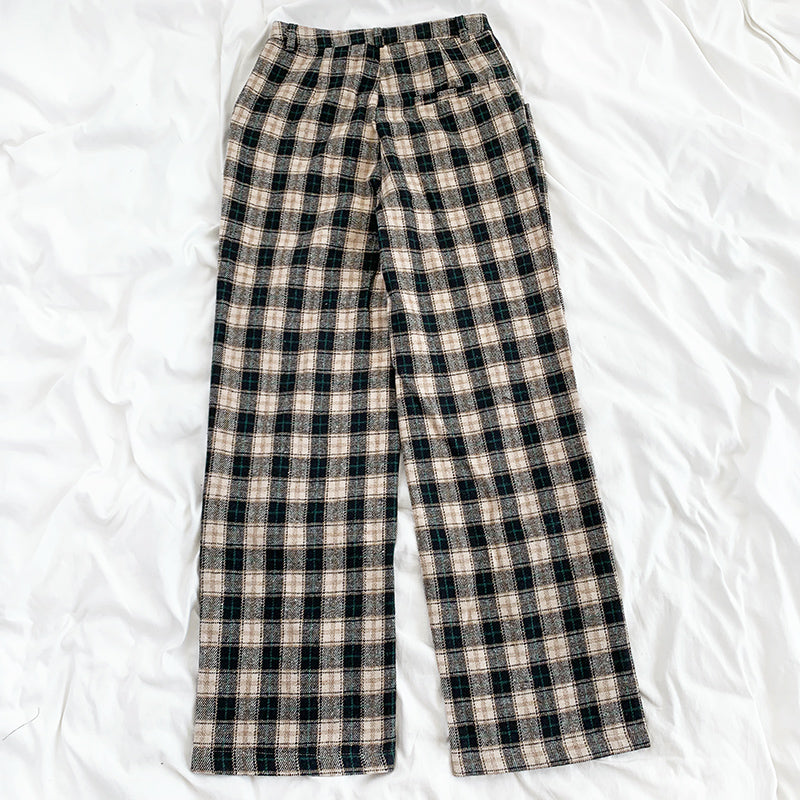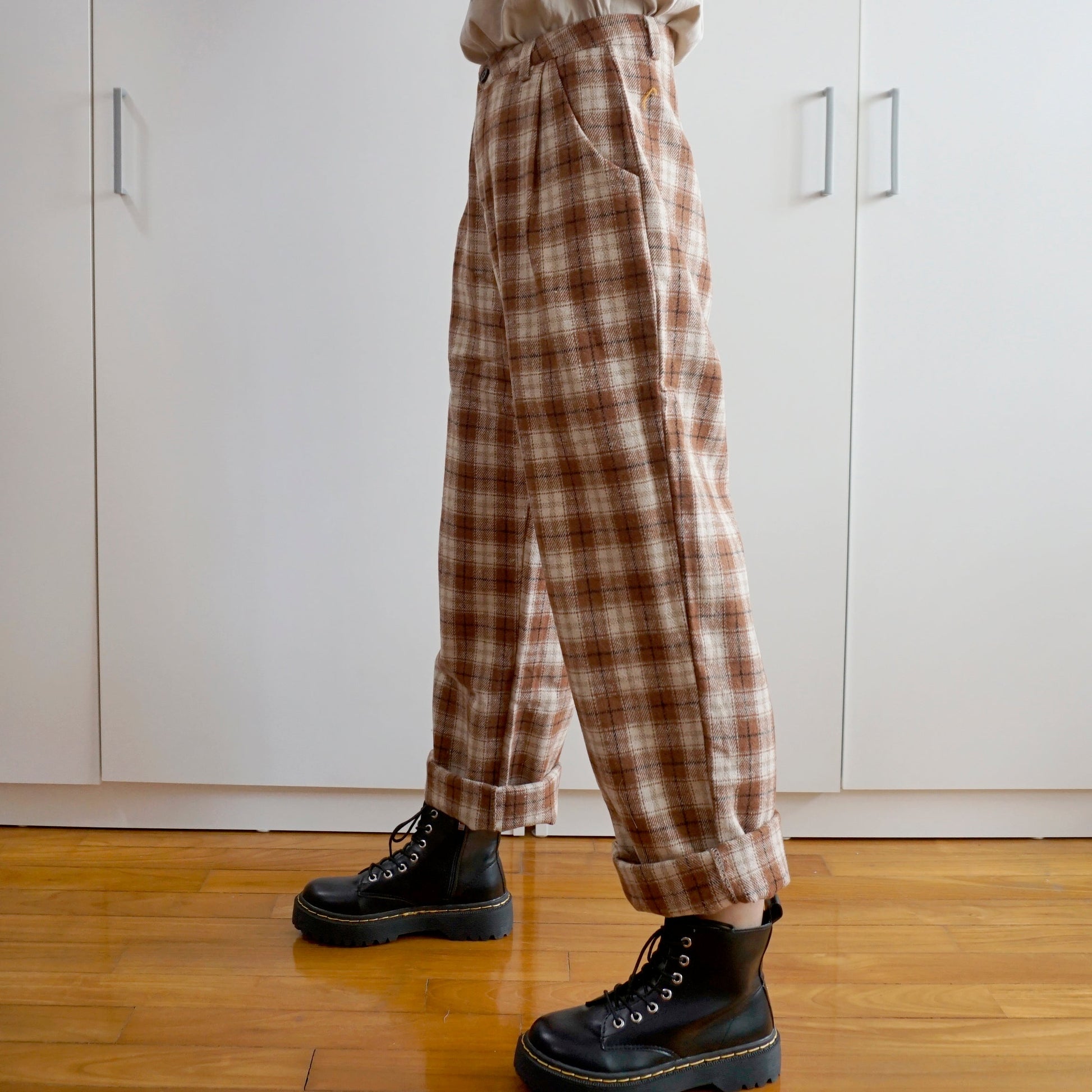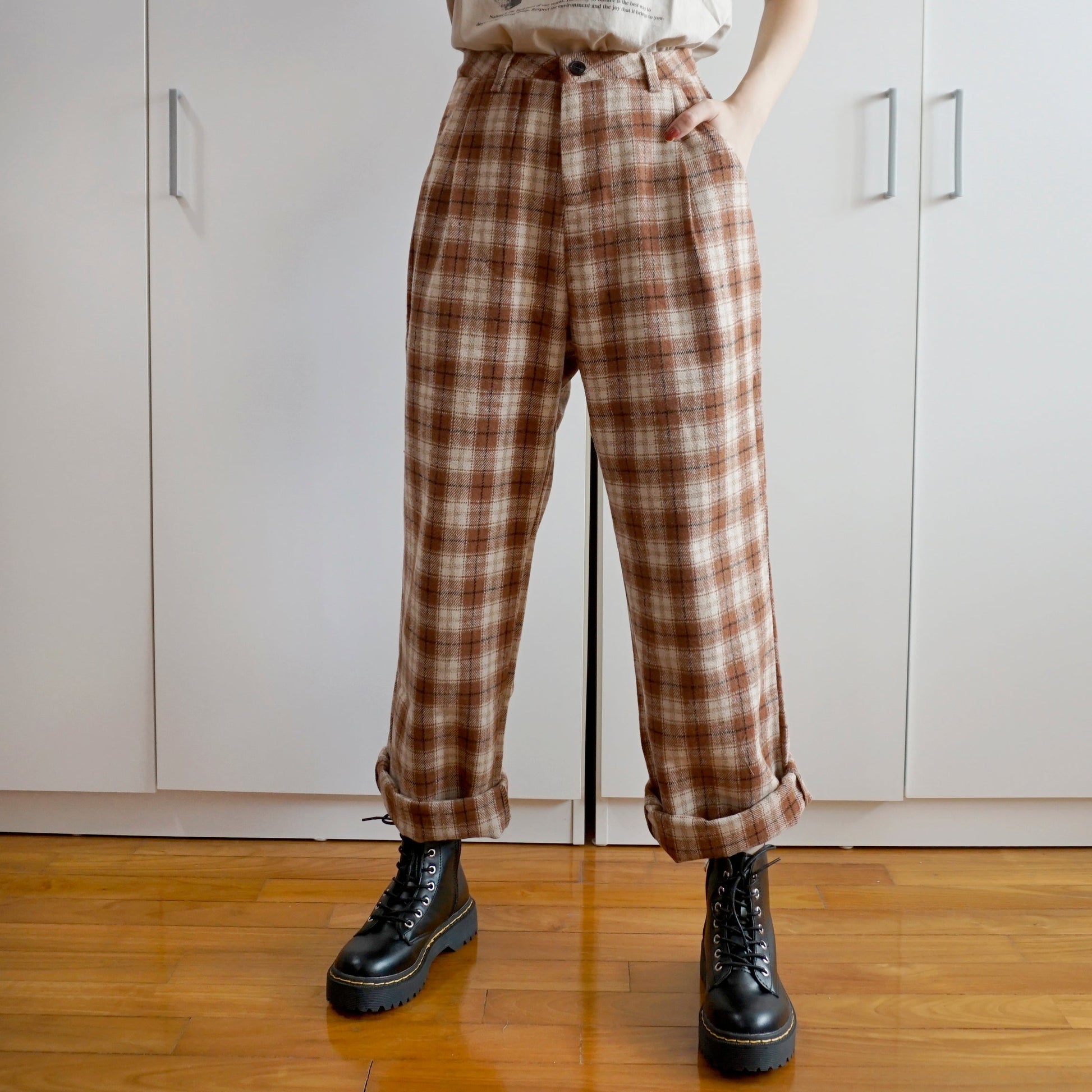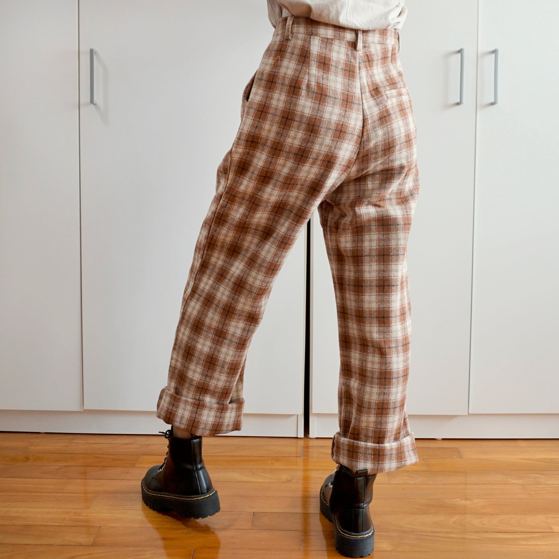 Knitted plaid pants with a high waist and straight leg fit. Button and zip closure with functional side pockets and five belt loops.