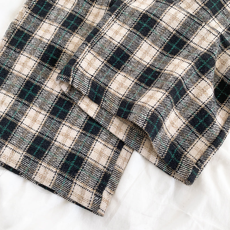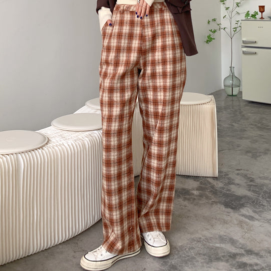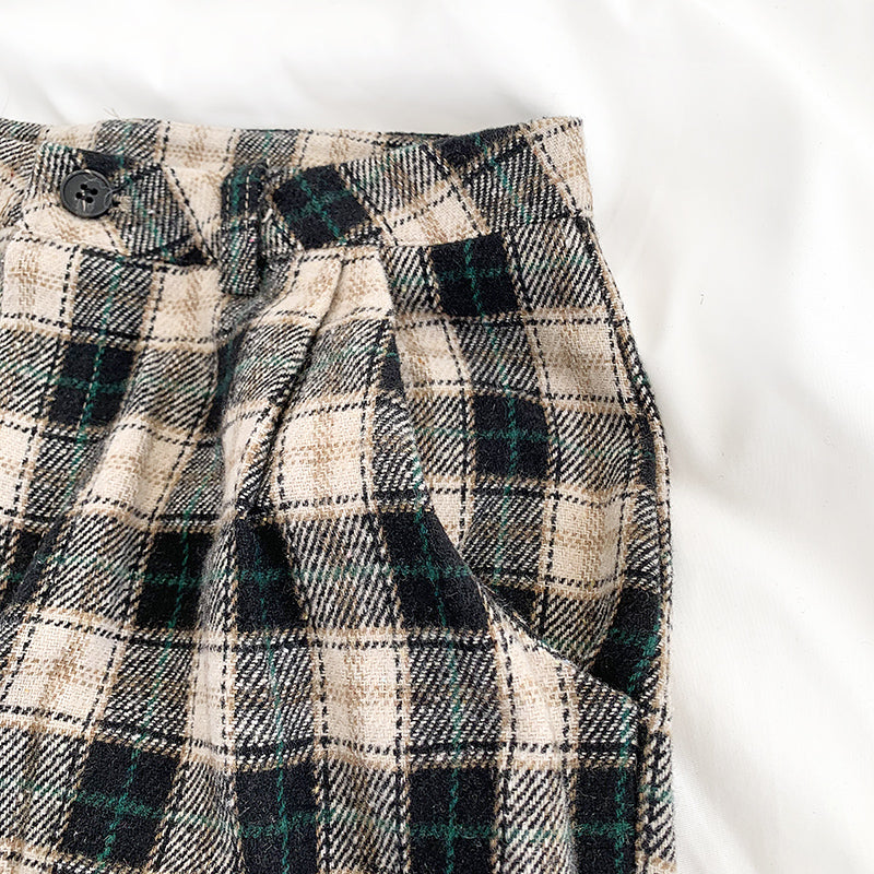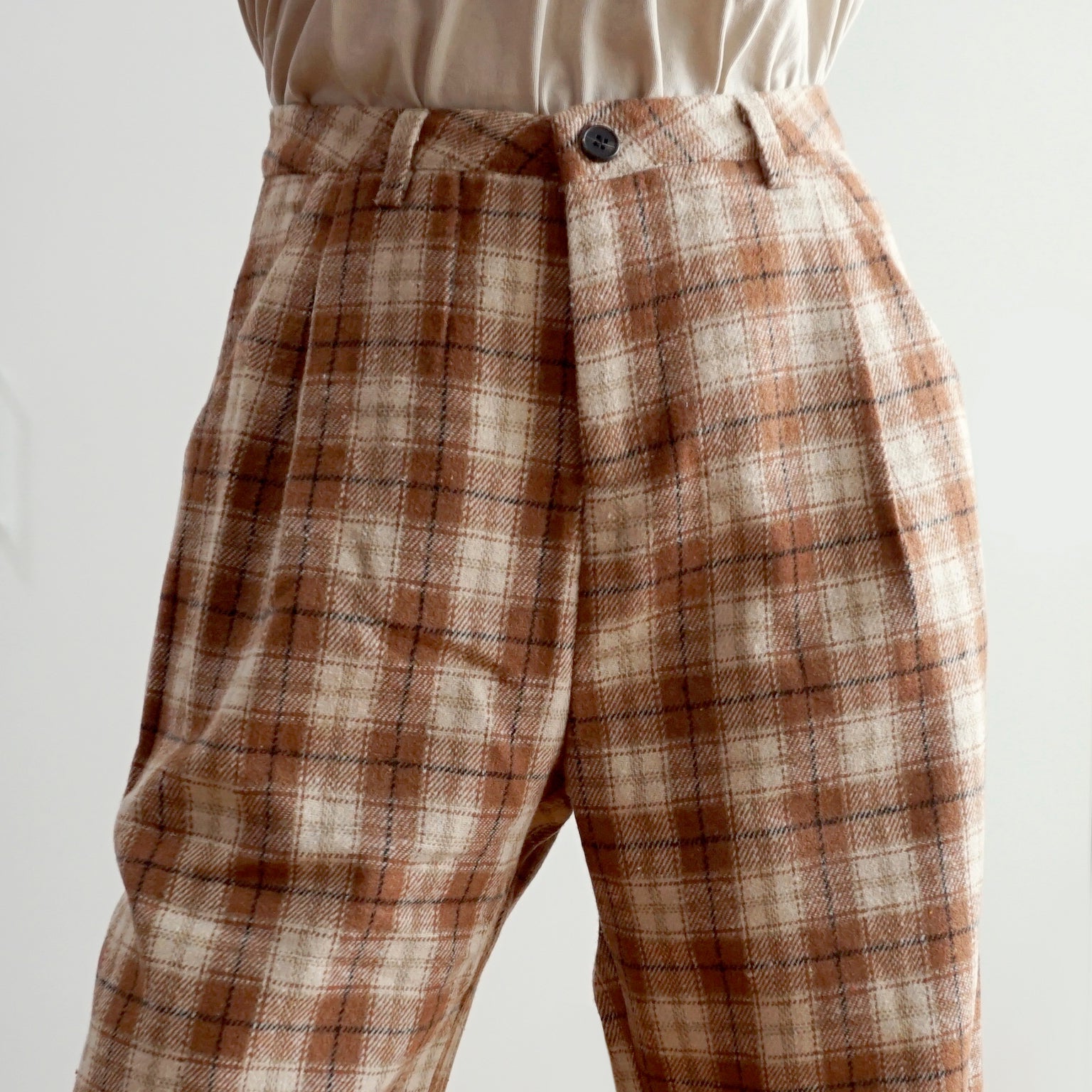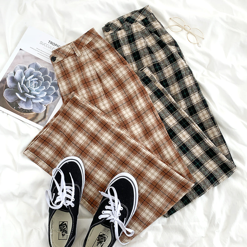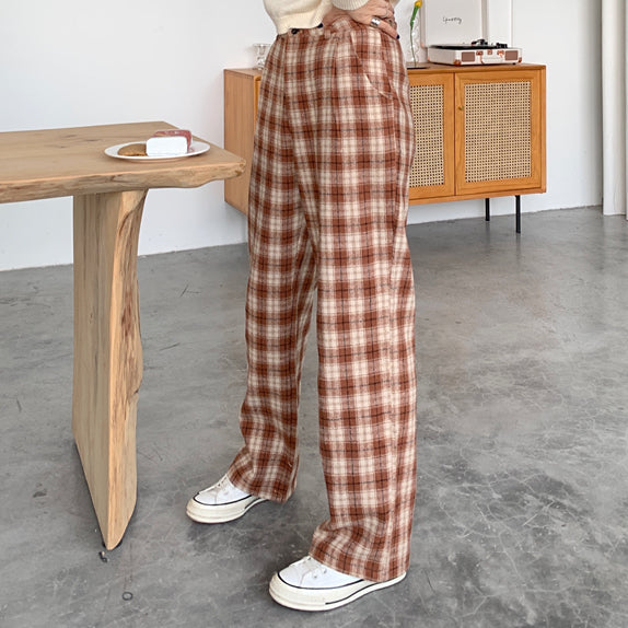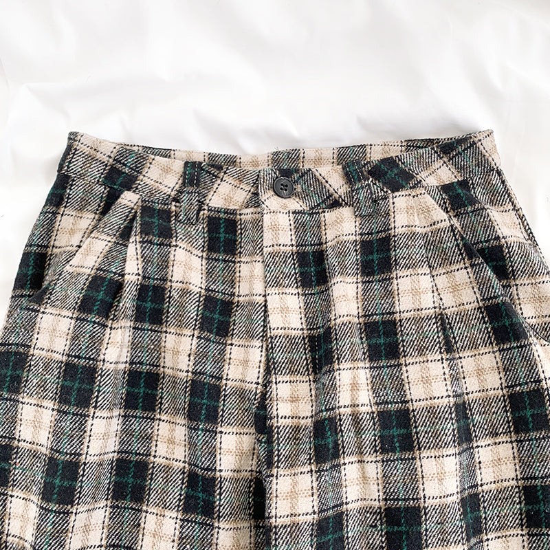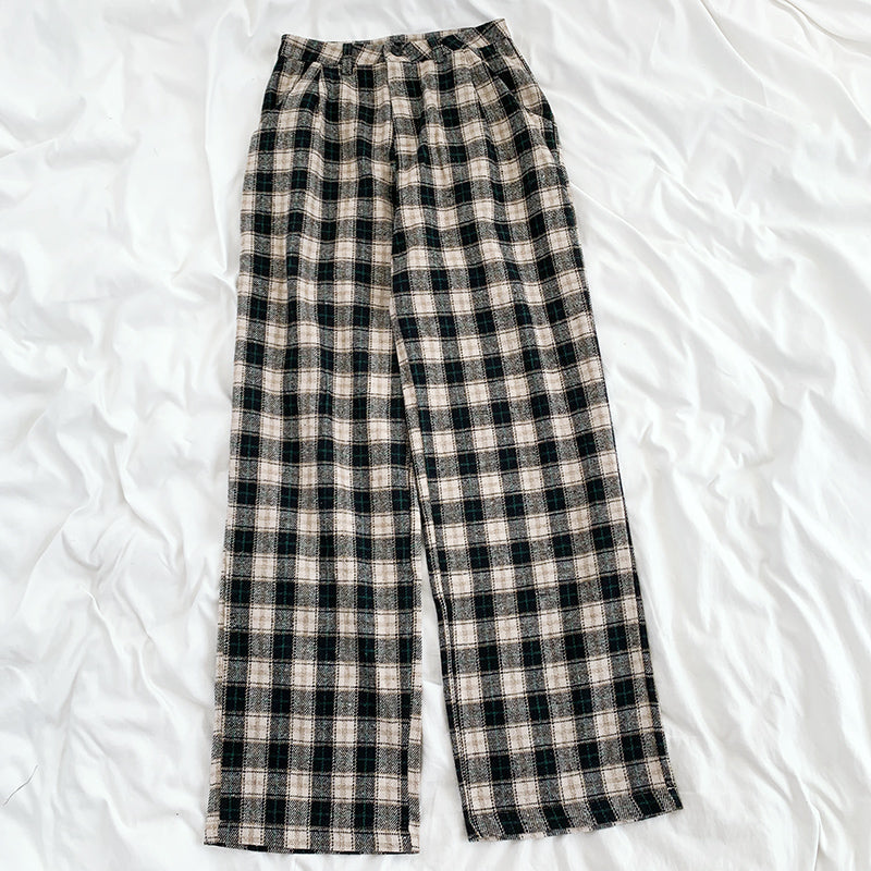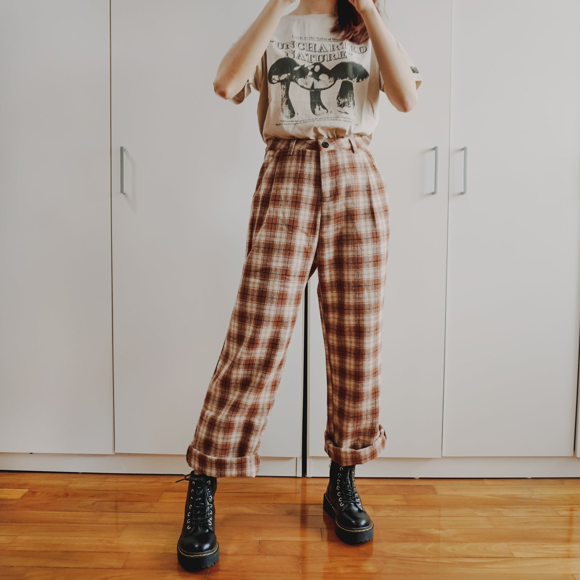 Knitted plaid pants with a high waist and straight leg fit. Button and zip closure with functional side pockets and five belt loops.