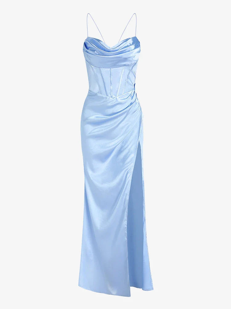 Red Satin Cowl Front Lace Up Corset Christmas Party Dress