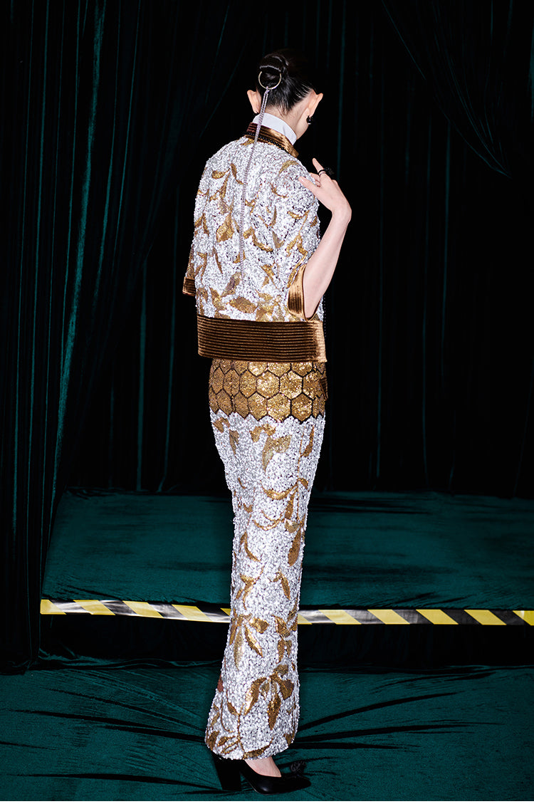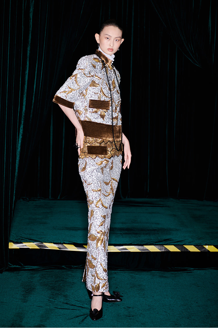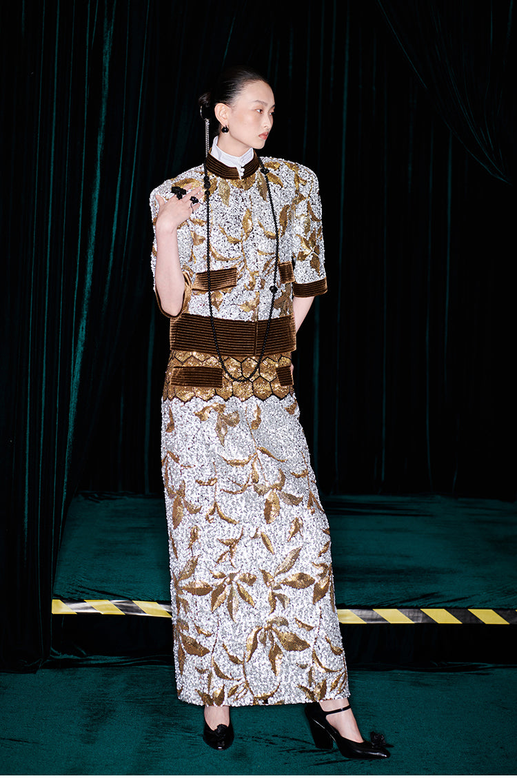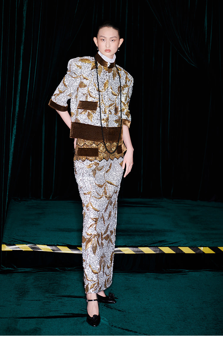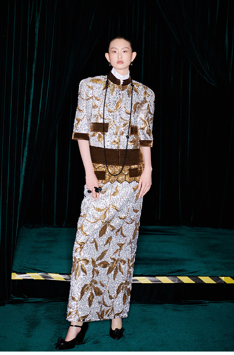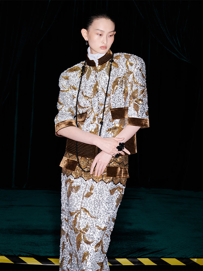 M essential Mackay luxury brown silver stand collar short seuins jacket top pencil skirt set - sans.