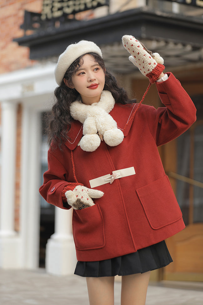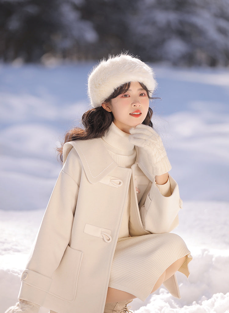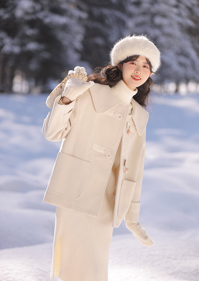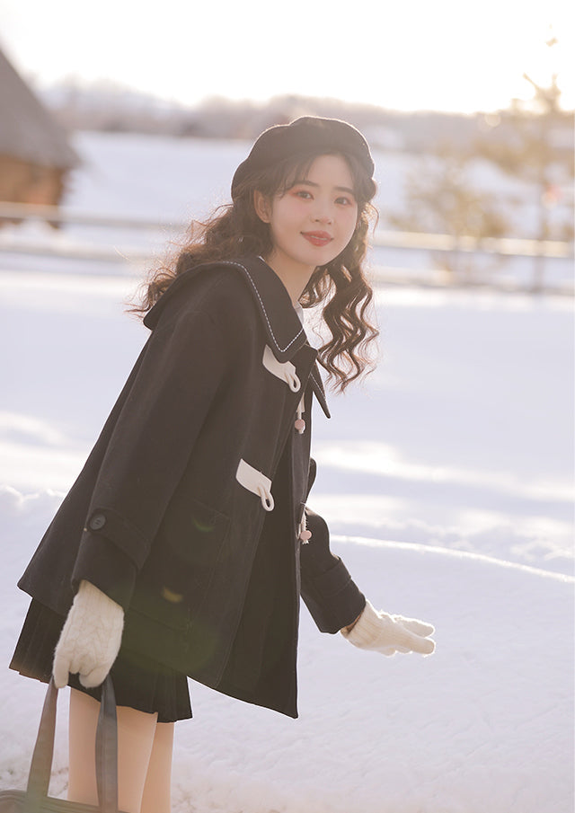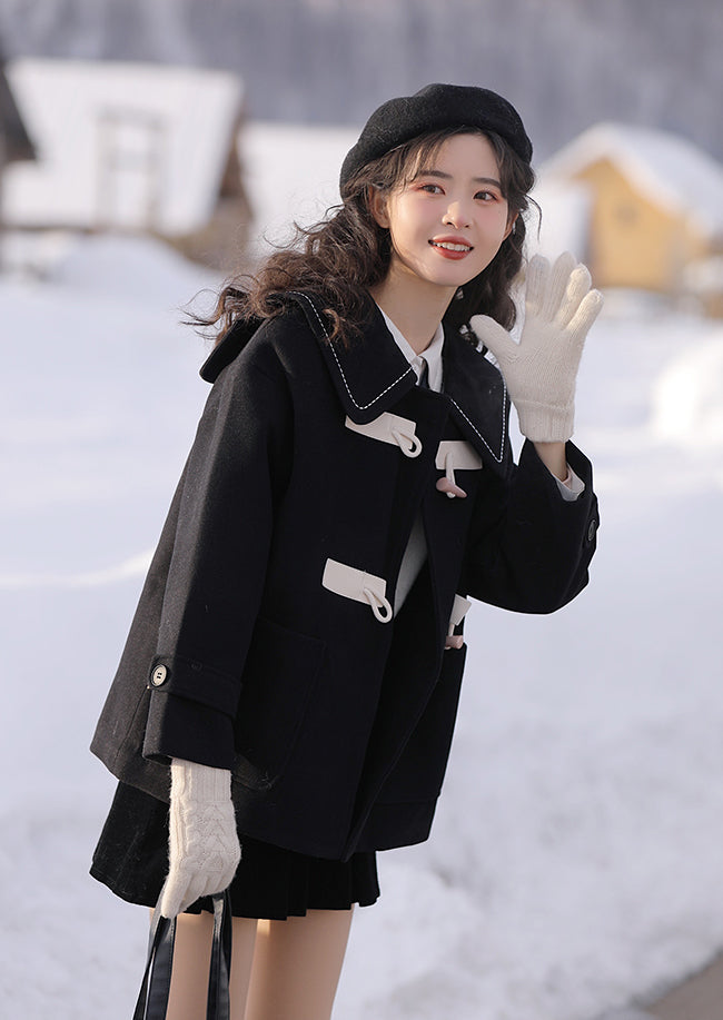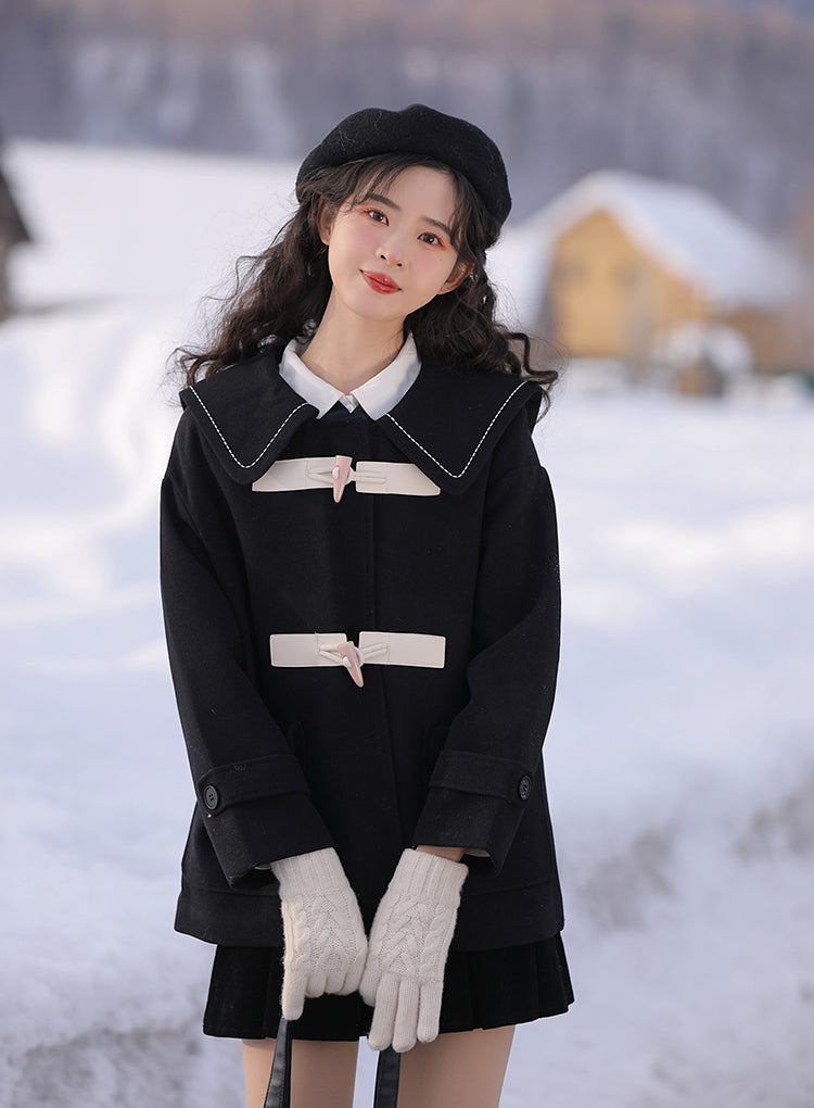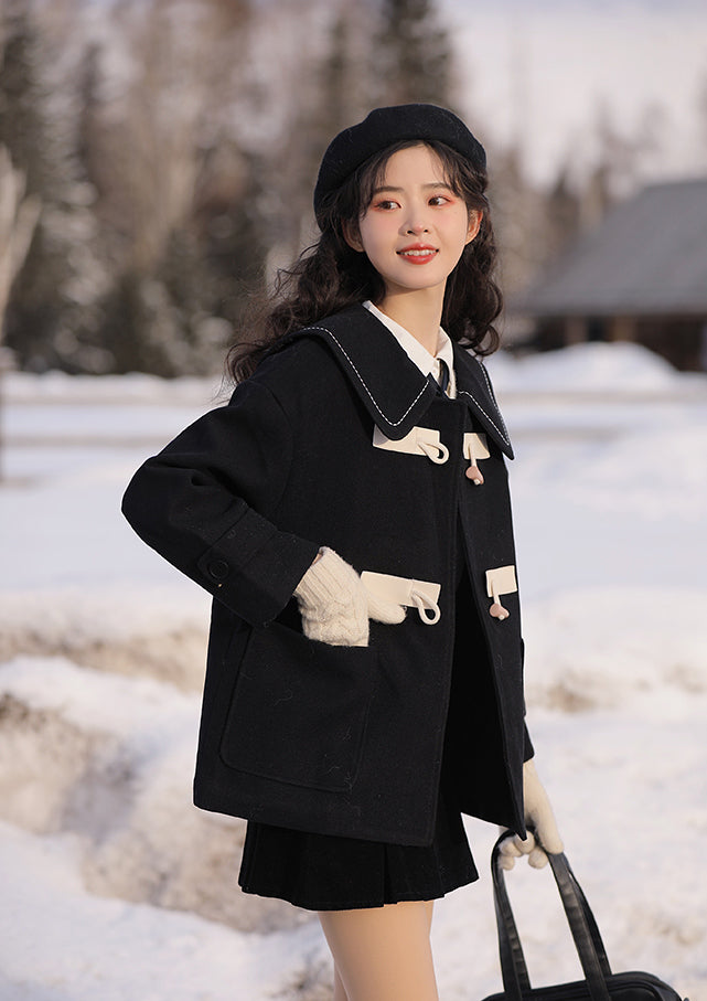 Oversized faux wool coat with an oversized peter pan collar, toggle buttons and large side pockets. Slightly padded lining for extra warmth.