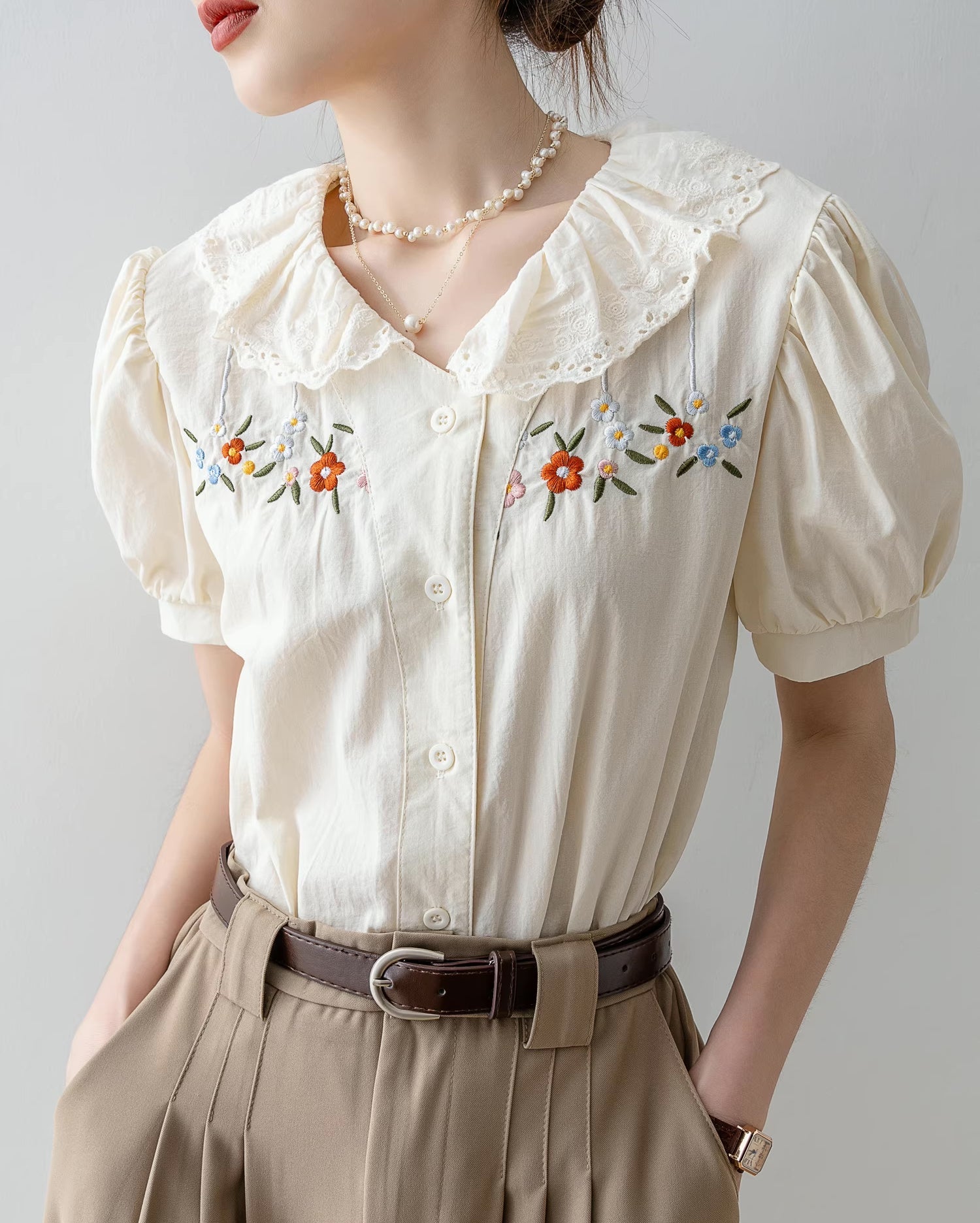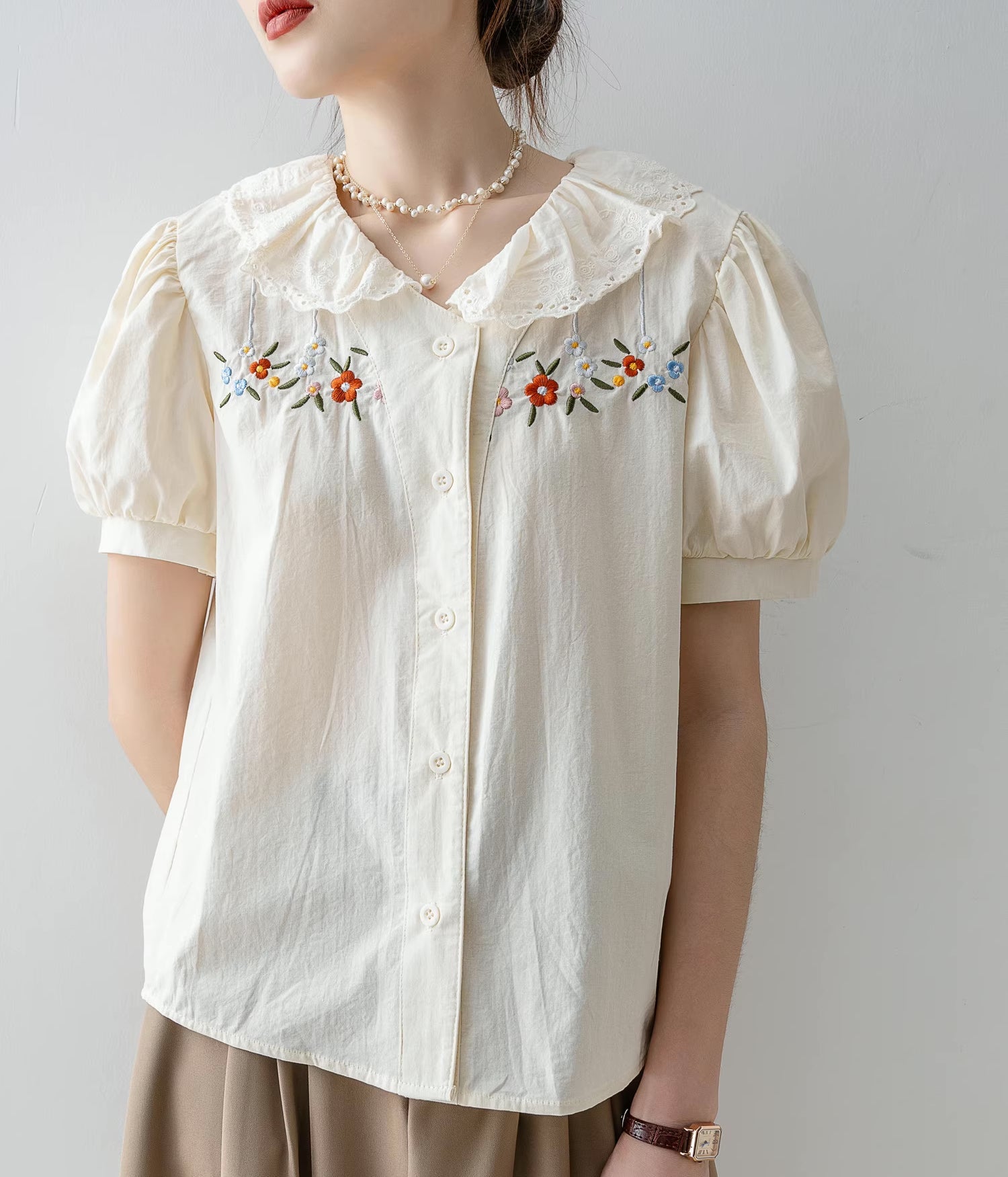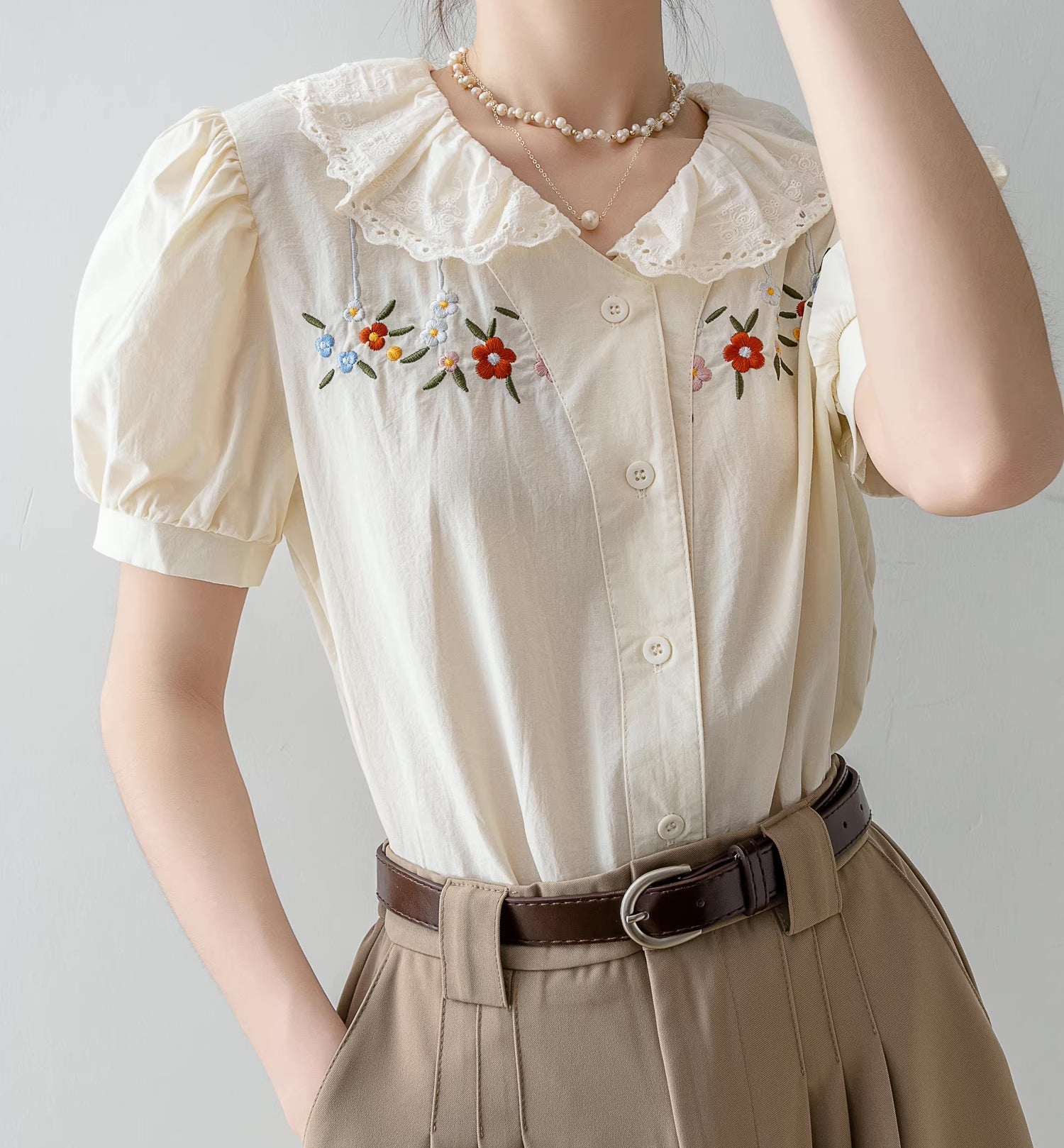 Long sleeve button up shirt with a scalloped eyelet collar and colorful daisy flower embroidery across the chest.