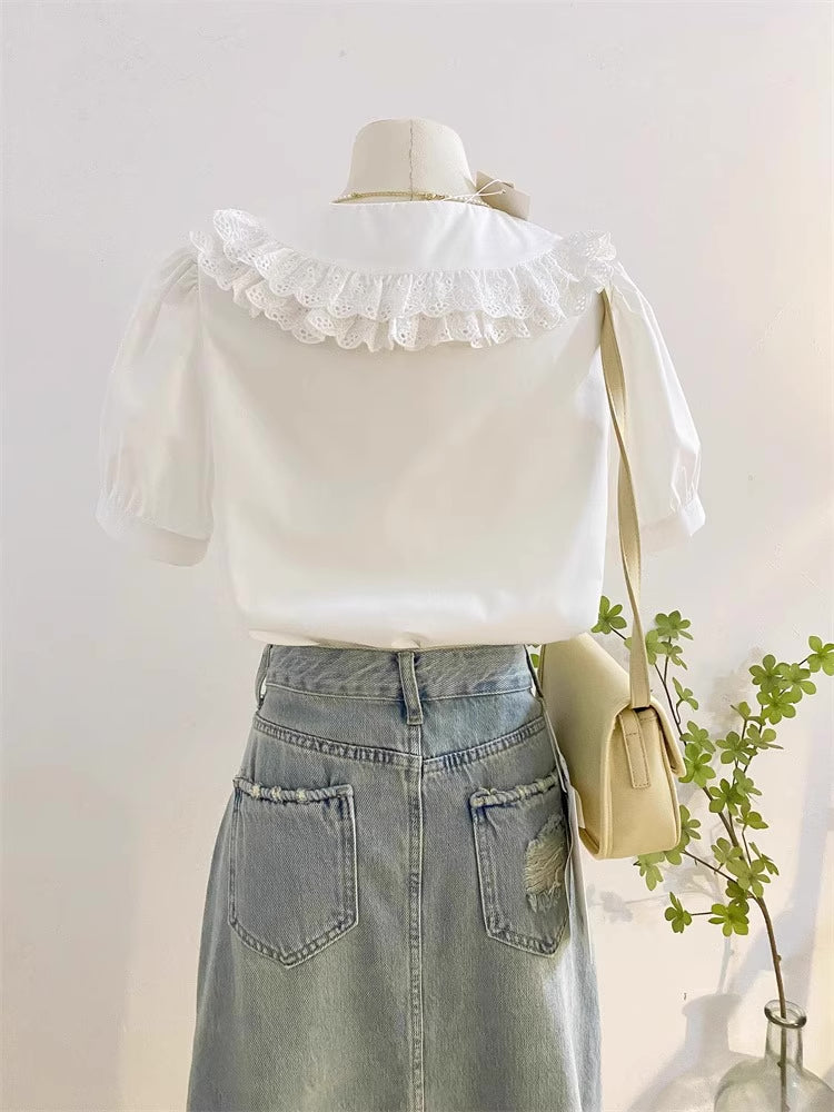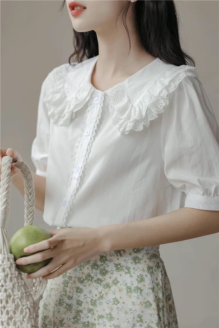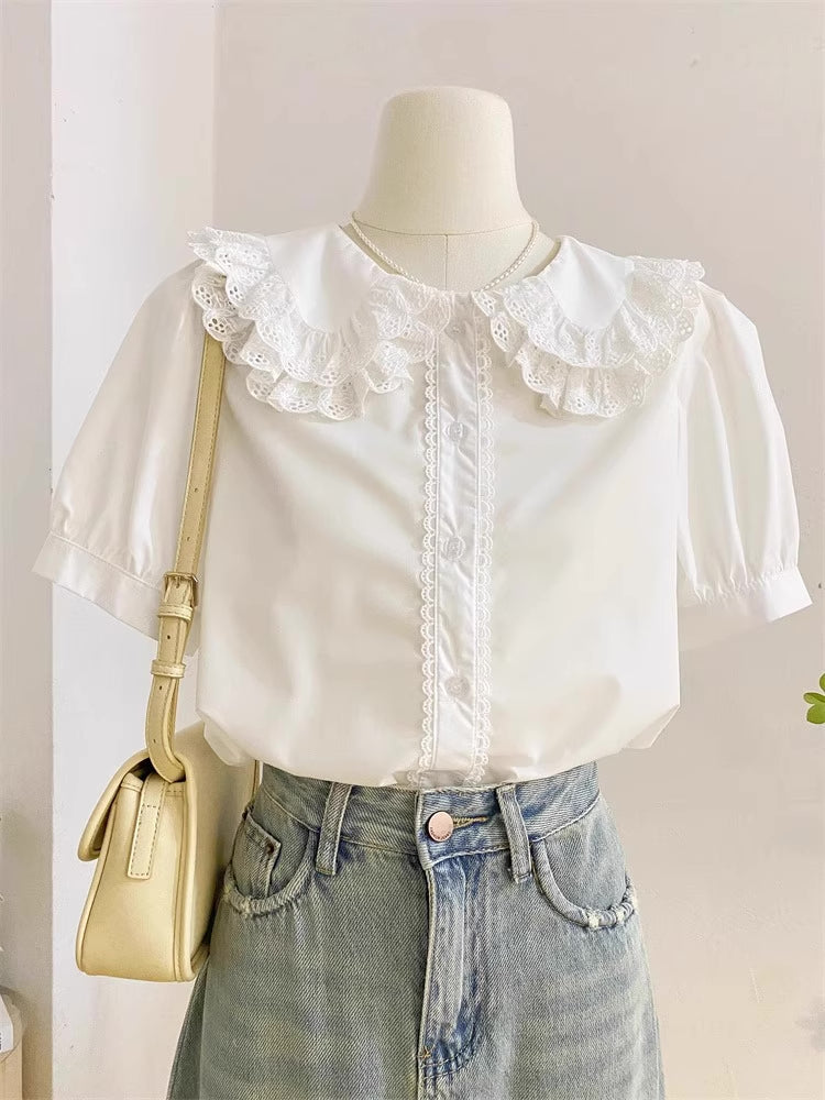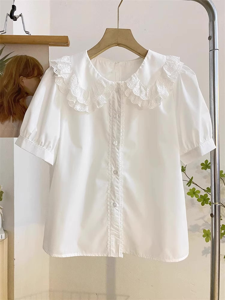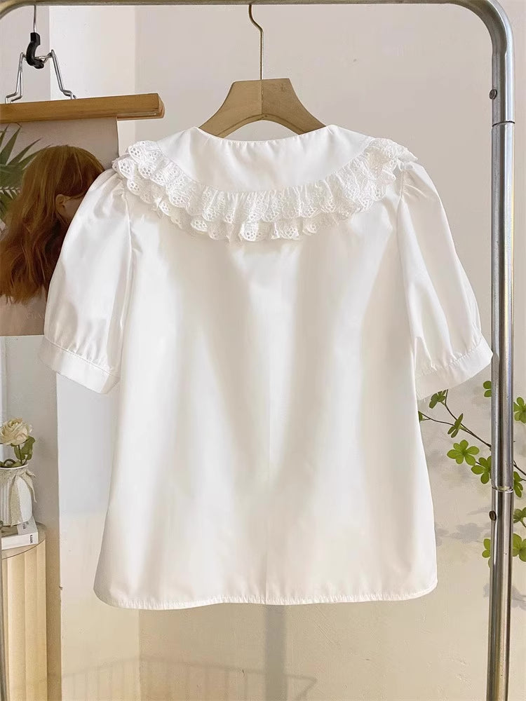 Short sleeved shirt with dual peter pan collars lined with lace frills and a button up placket lined with lace.