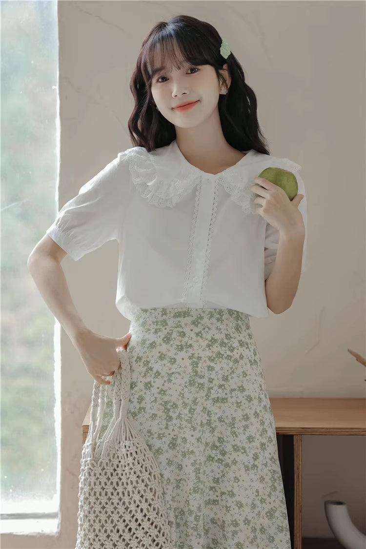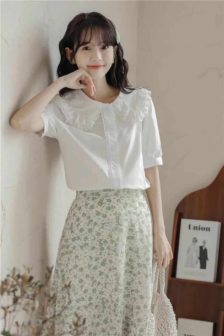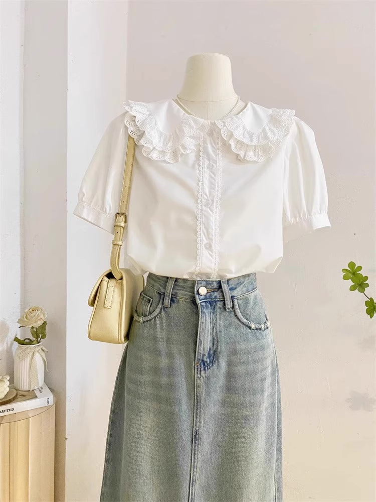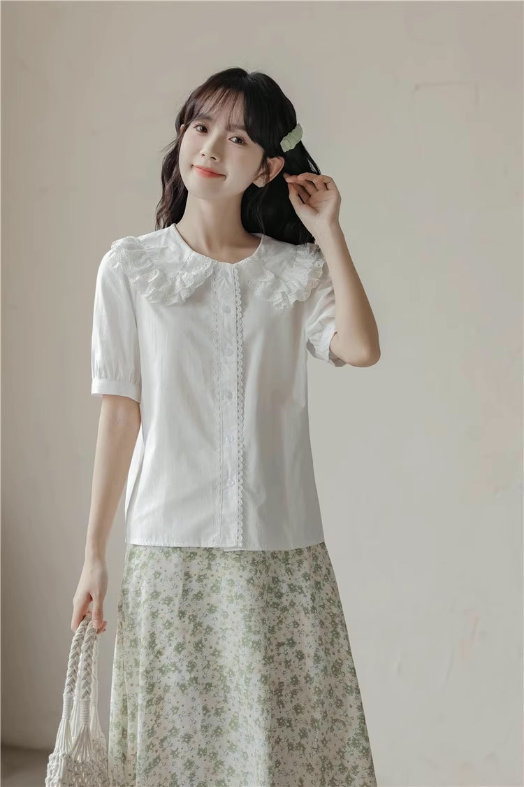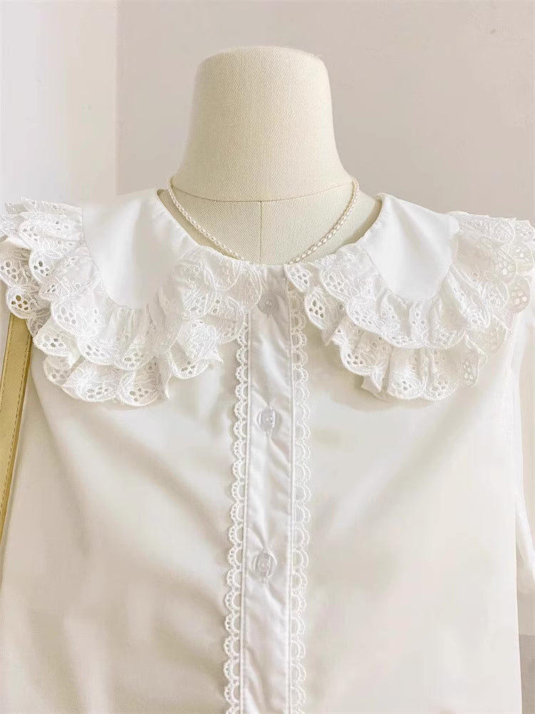 Short sleeved shirt with dual peter pan collars lined with lace frills and a button up placket lined with lace.