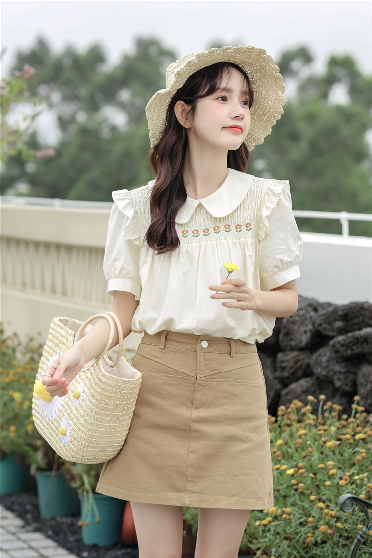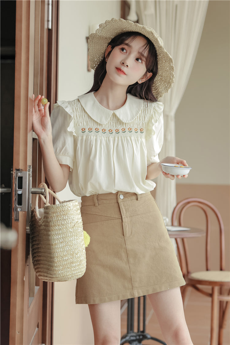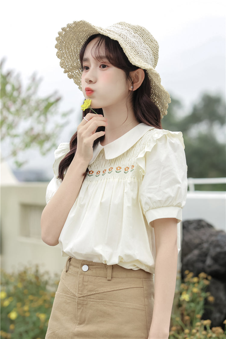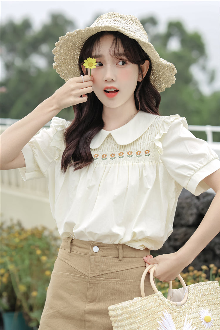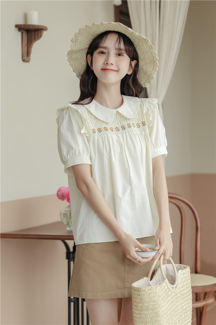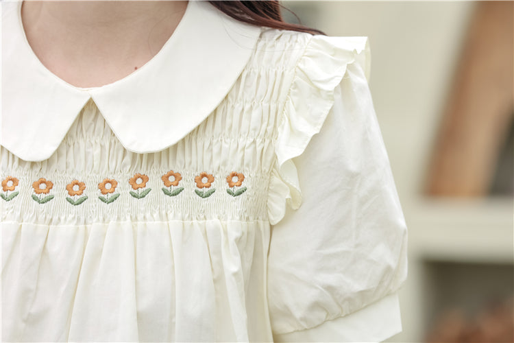 Short sleeve blouse with a peter pan collar, elasticised neck width, ruffles along the shoulders and embroidered flowers across the chest.