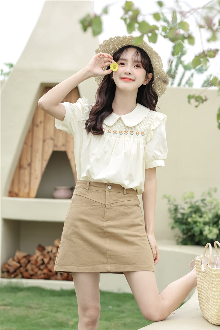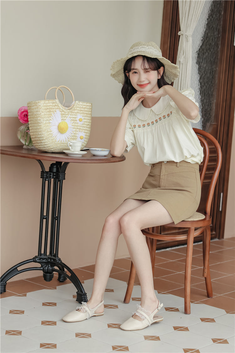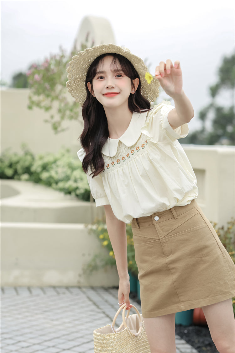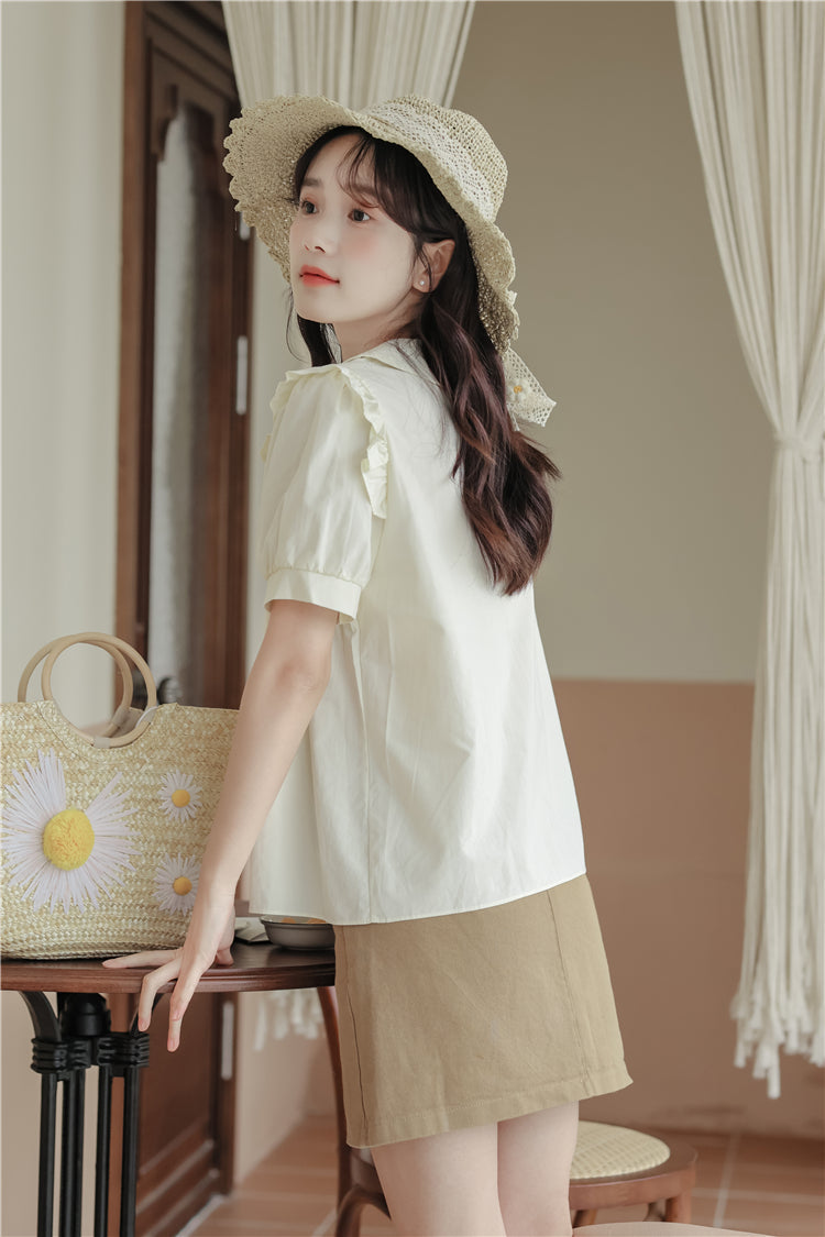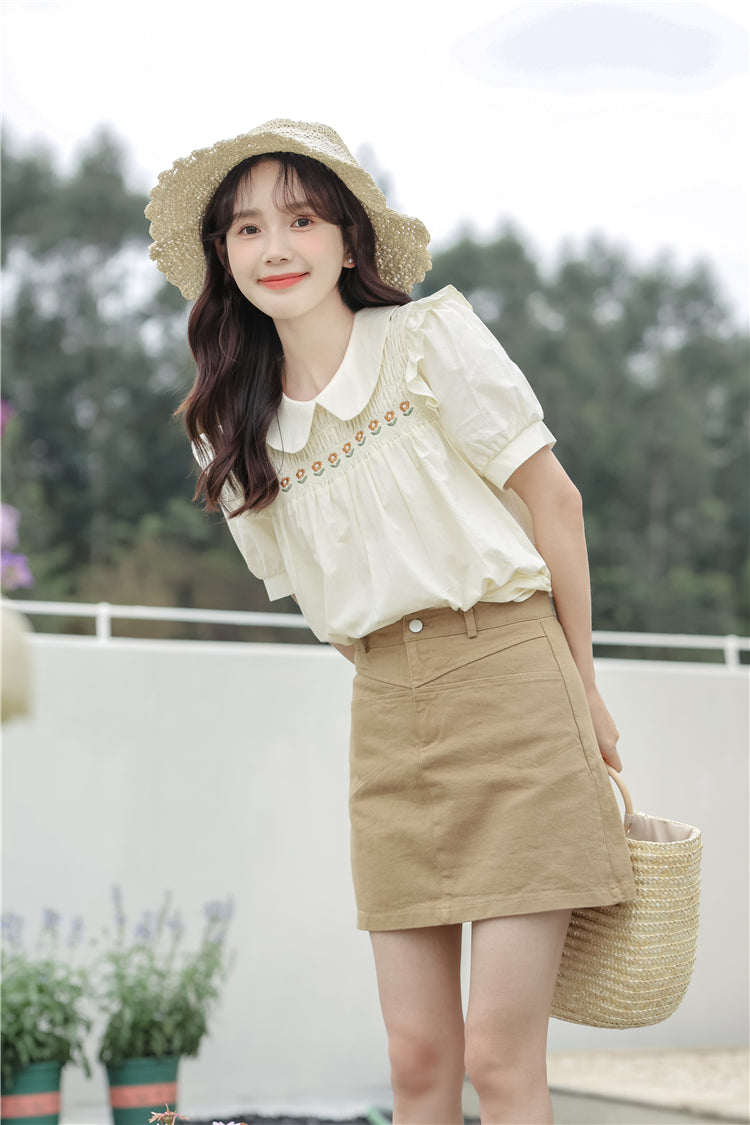 Short sleeve blouse with a peter pan collar, elasticised neck width, ruffles along the shoulders and embroidered flowers across the chest.