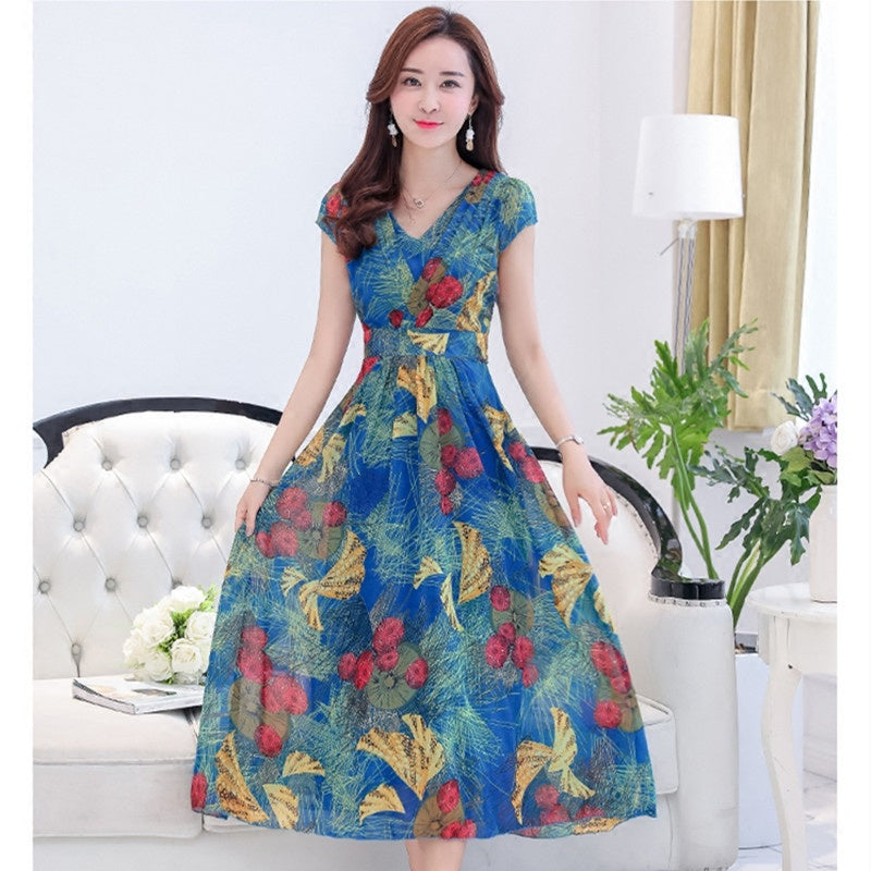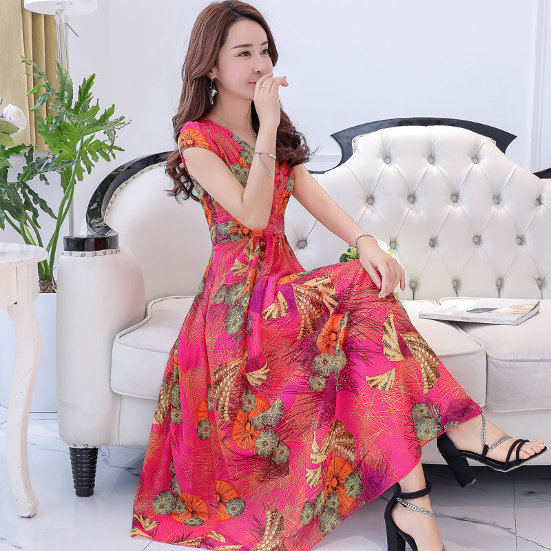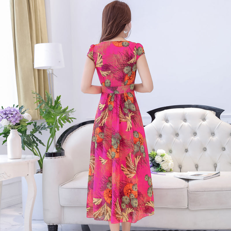 Floor Sweeping Chiffon Printed Dress With Short Sleeves