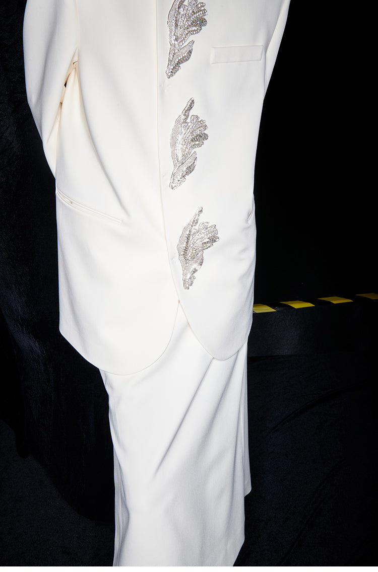 Add some stylish flair to your wardrobe with our M essential Mackay designer brand Jiayang twill iris beads suit. This versatile set is perfect for any occasion, offering chic and classy options to match any fashion forward or trendy look. Be vibrant in white with a beaded coat, shirt, and long skirt.