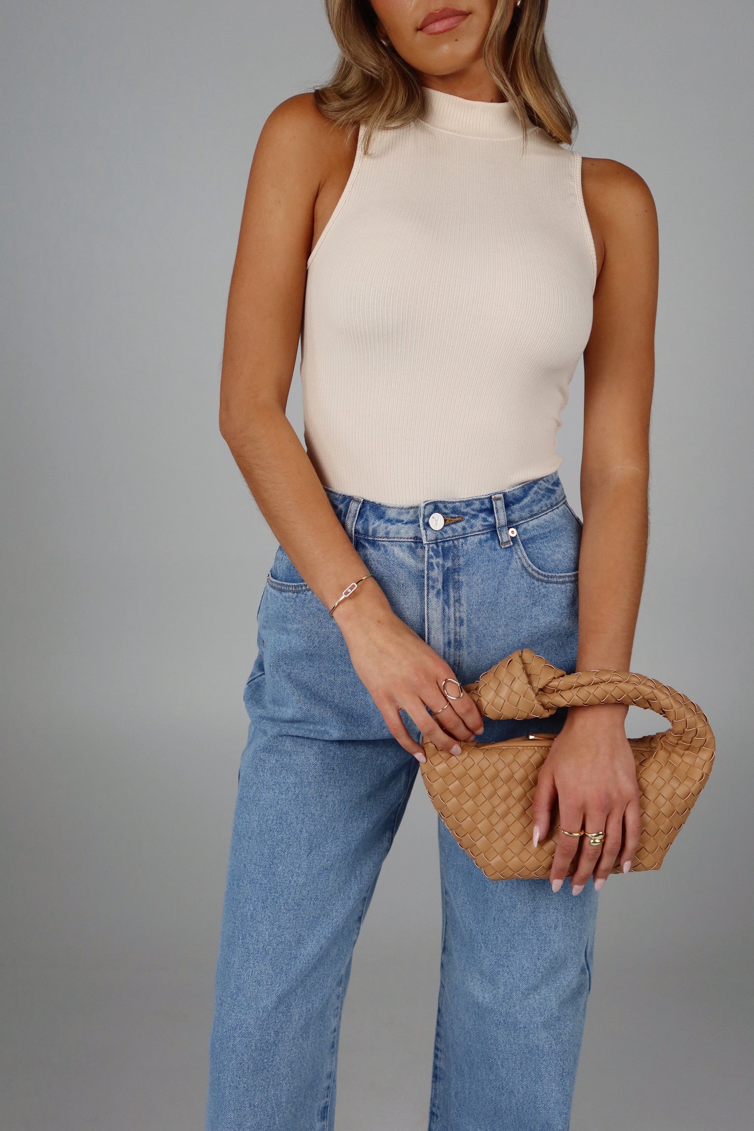 Our Mock Neck Tank Bodysuit is a high neck bodysuit with an keyhole detail back feature. The high neck has two small button closure and the bottom of the bodysuit has a snap button closure. The material is a wide ribbed farbic. This sleeveless item can be paired with so many different bottom options.