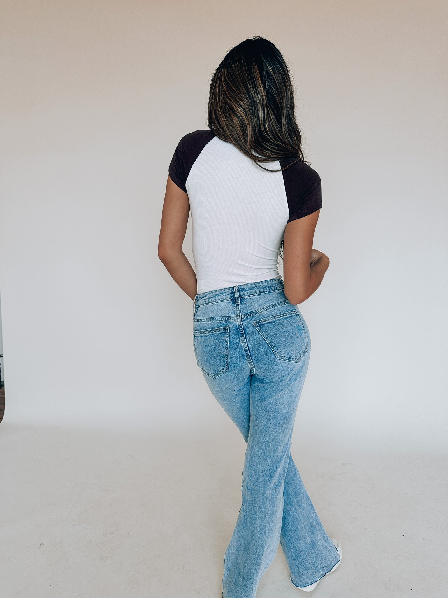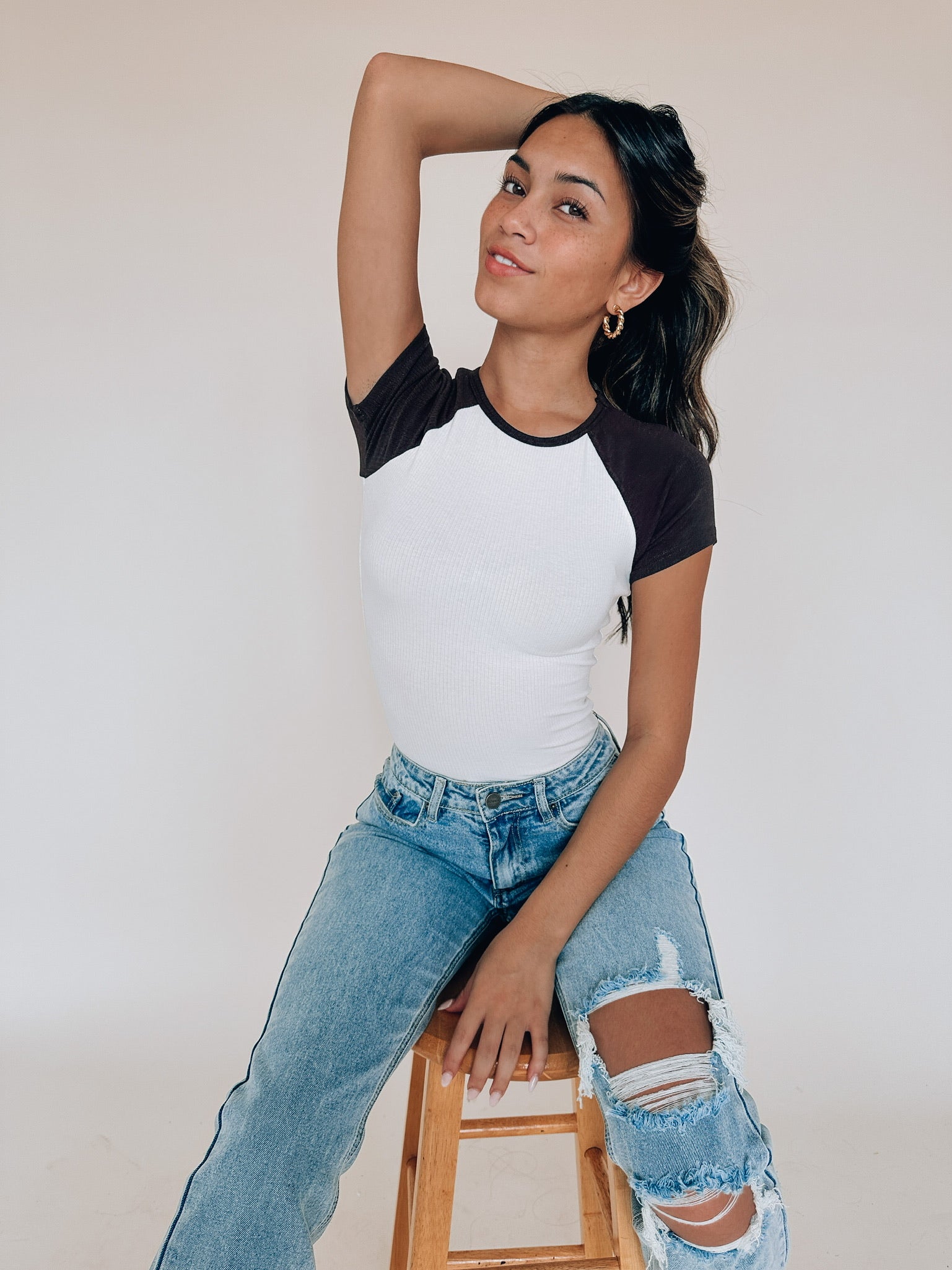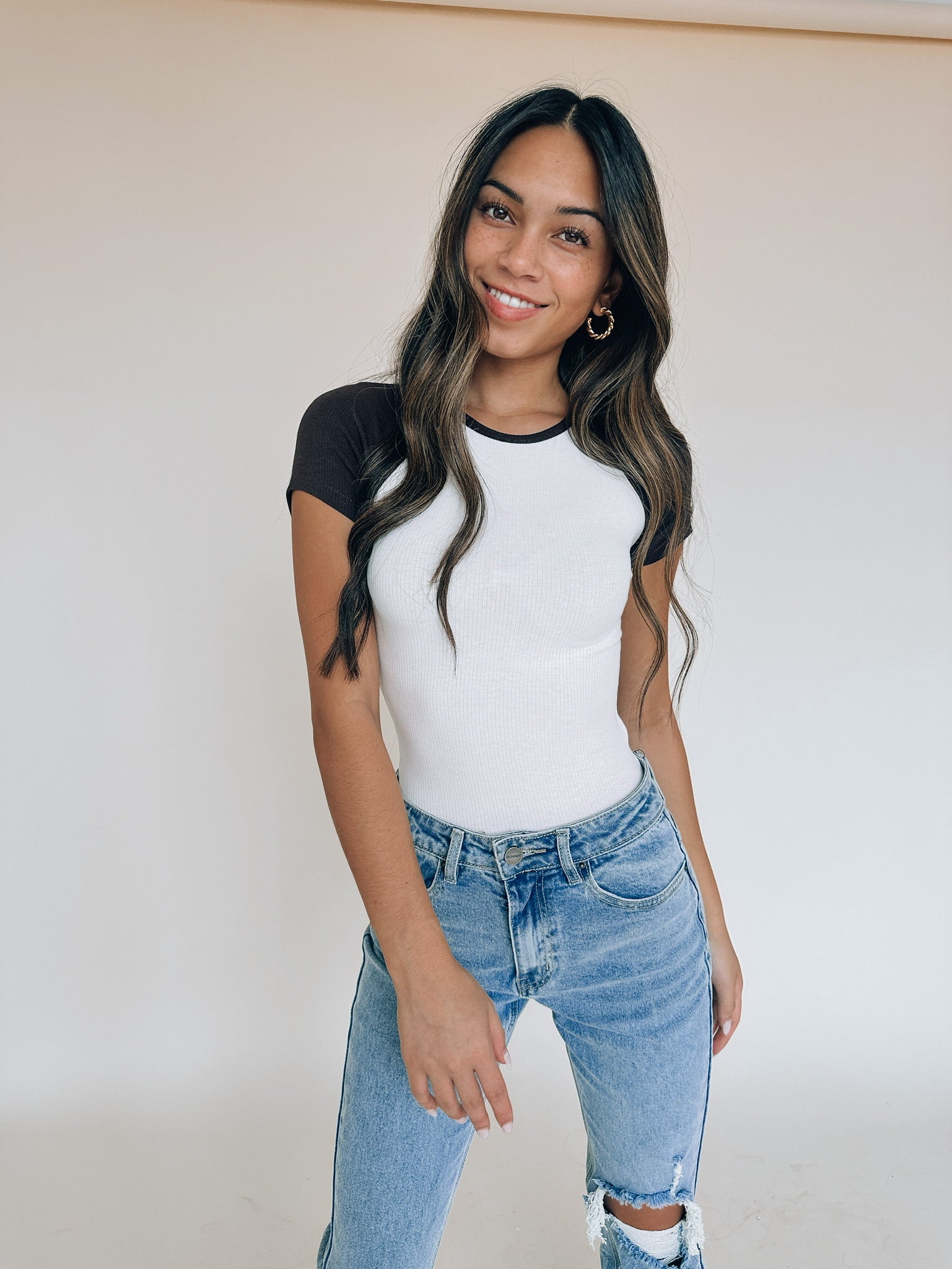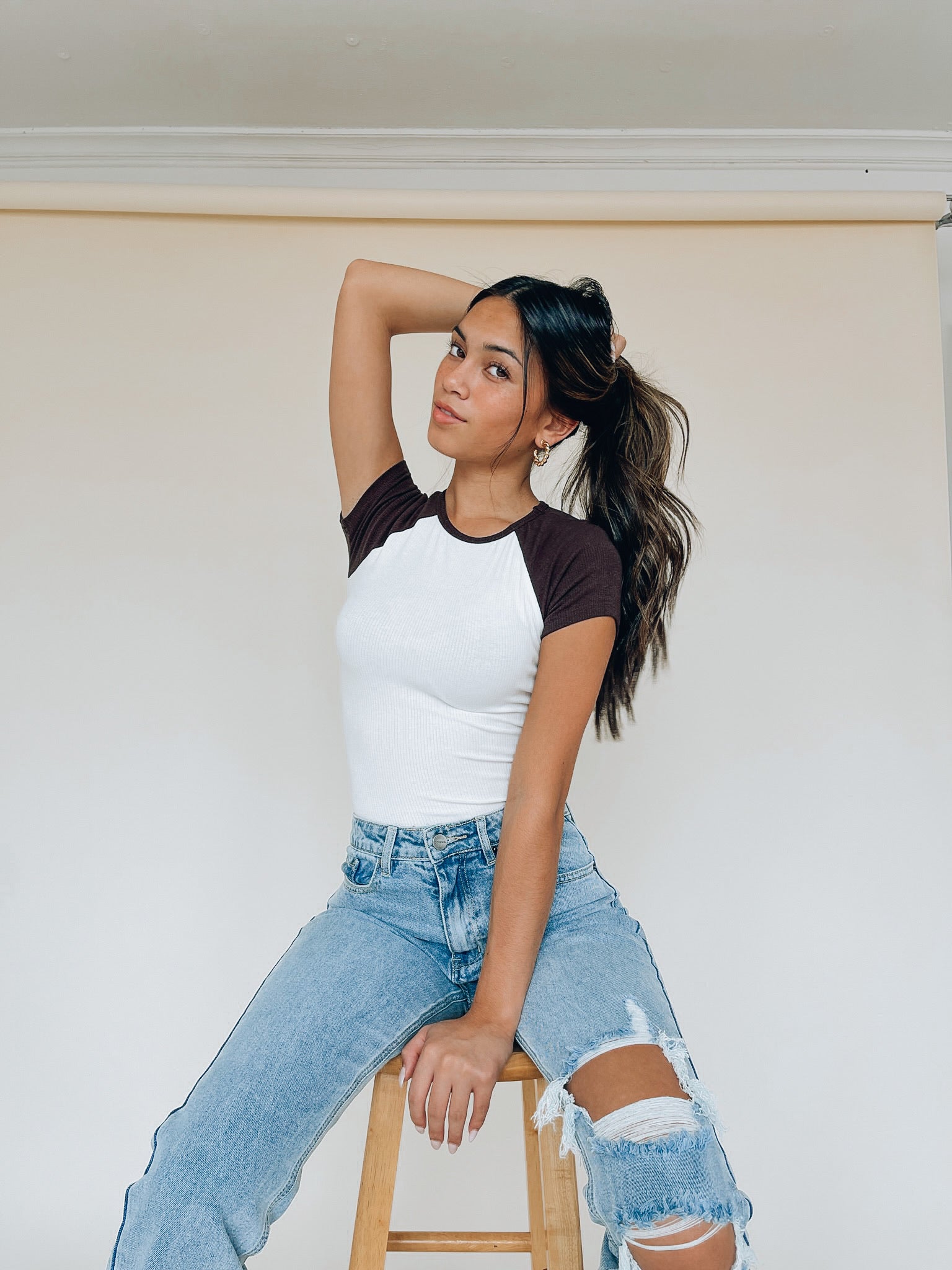 Our Varsity Tee Bodysuit is a fitted bodysuit that features a high round neckline, short sleeves, and a two button snap closure. This bodysuit is two toned with brown sleeves and brown trim around the neckline, the rest of the bodysuit is white. This bodysuit is soft to the touch, stretchy, and ribbed. This bodysuit is a staple in your wardrobe and can be paired with anything or everything.