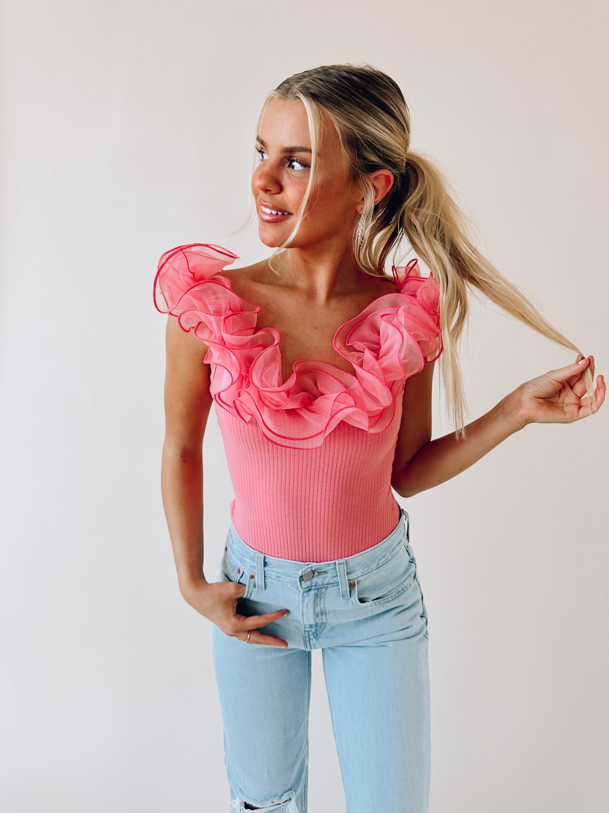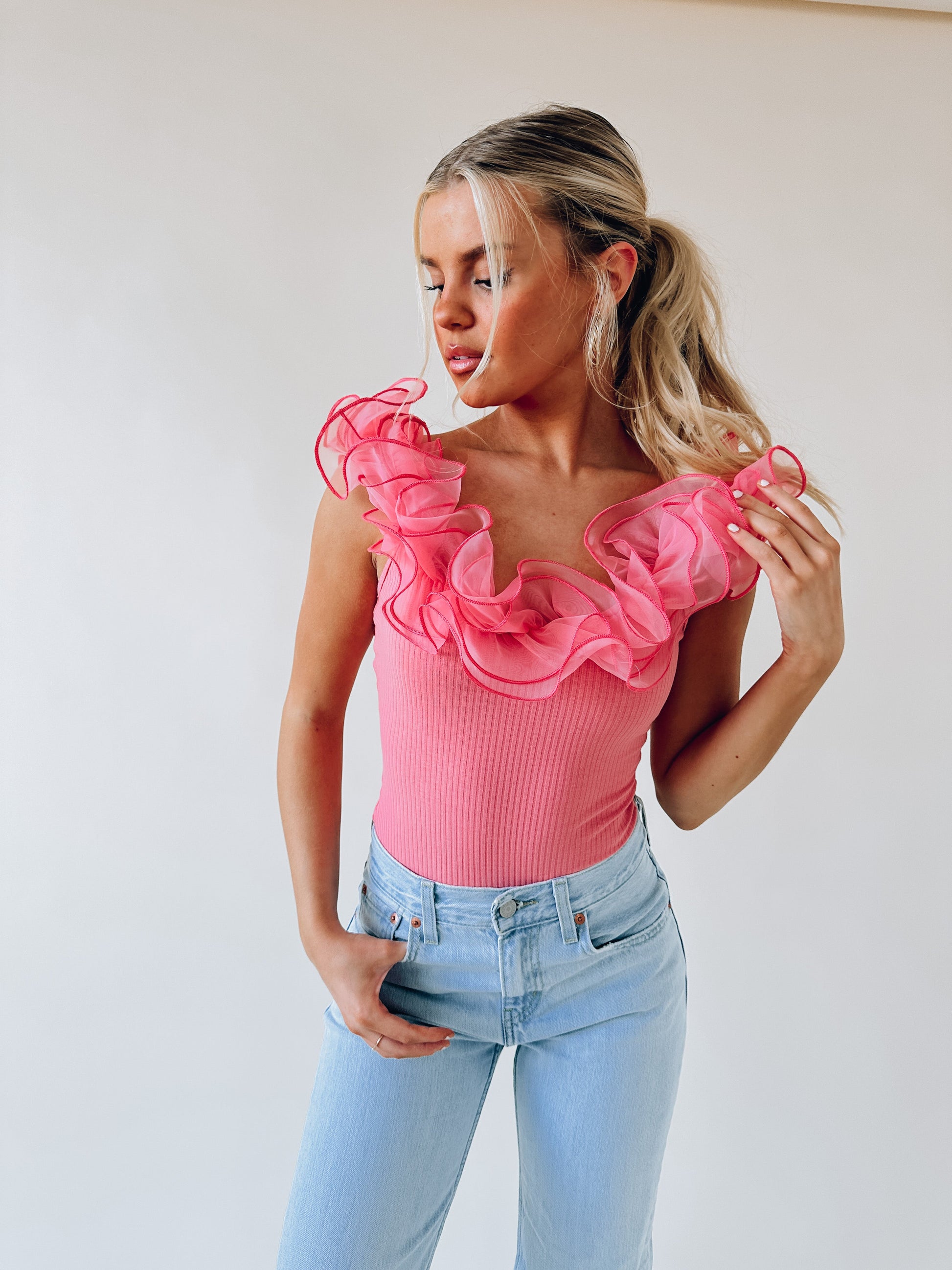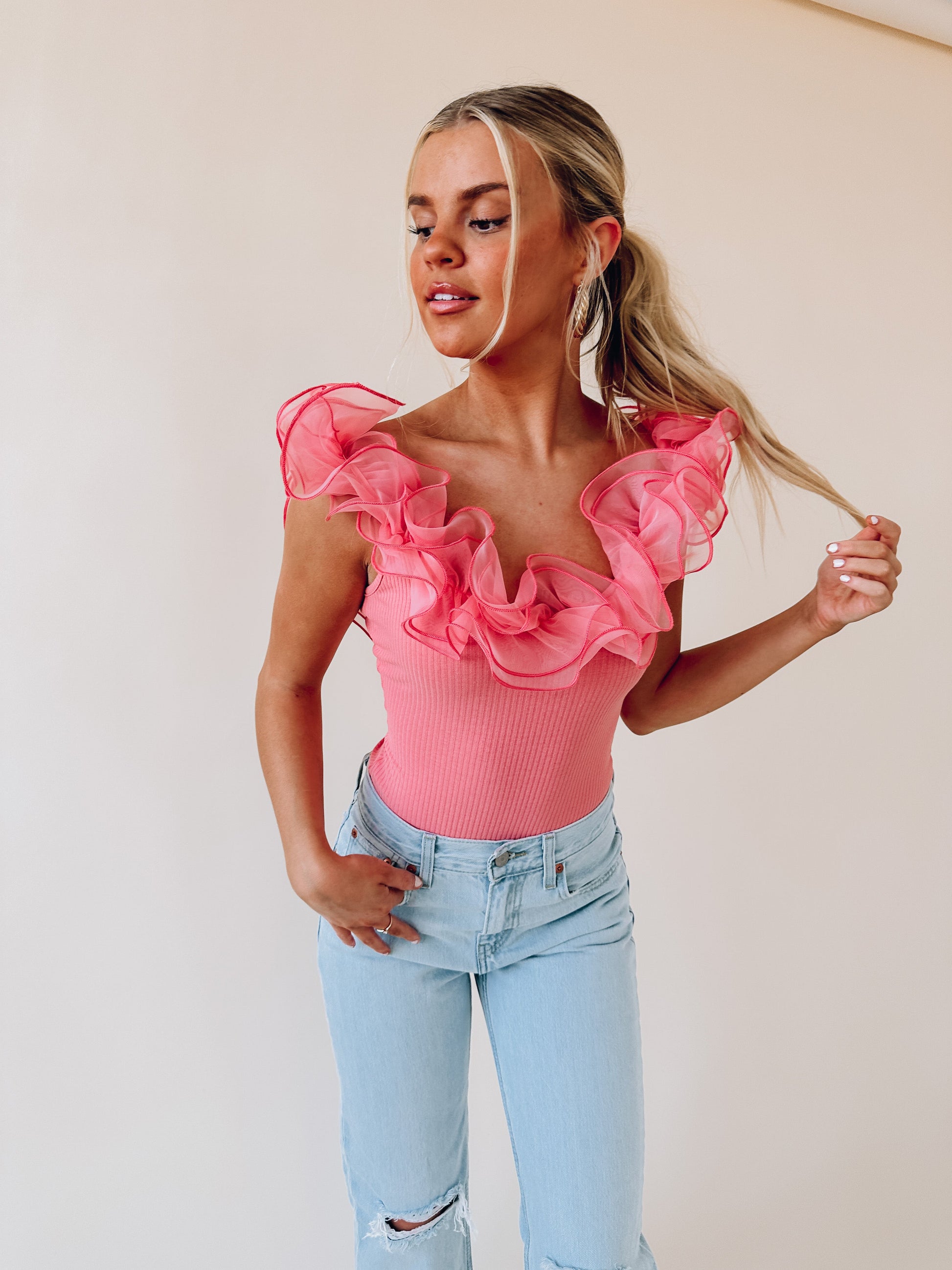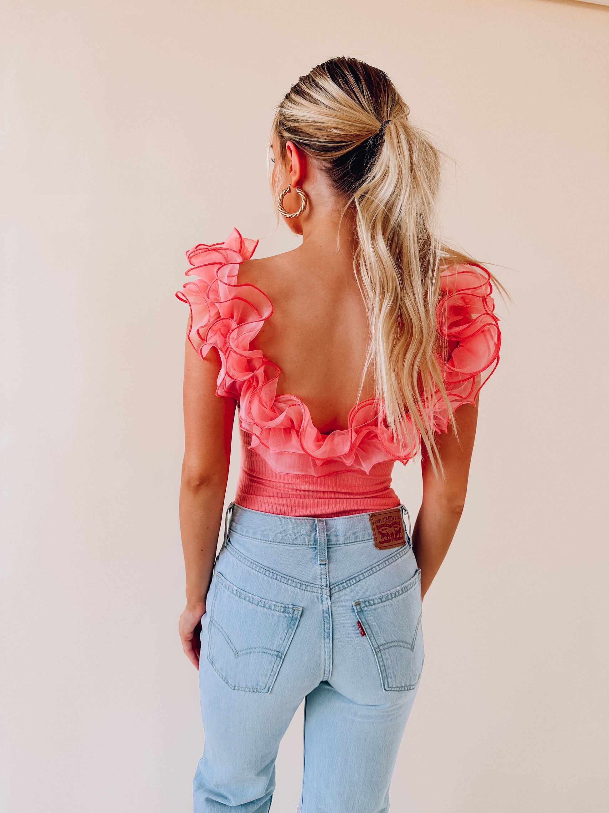 Our Wren Ruffle Bodysuit has a fitted ribbed fabric that has a good stretch to it. There is a ruffle organza detail that is around the top, straps, and back. This adorable bodysuit has a bottom snap closure. This can go with any bottom and heel for a cute going out outfit.