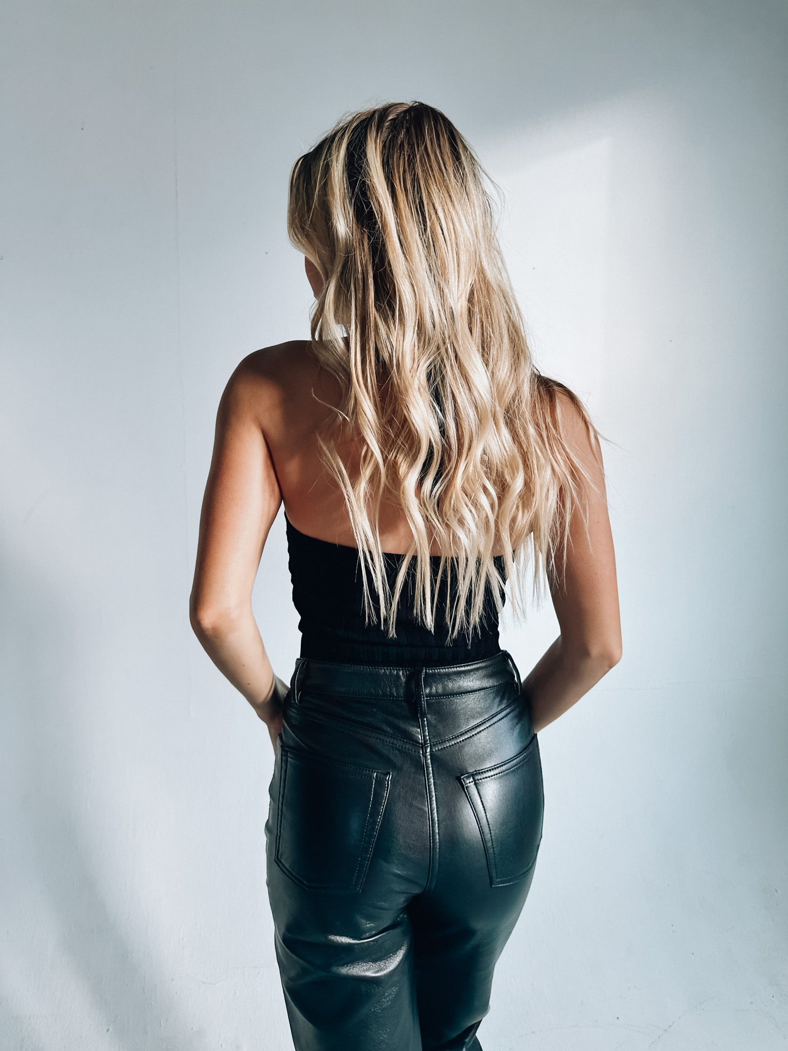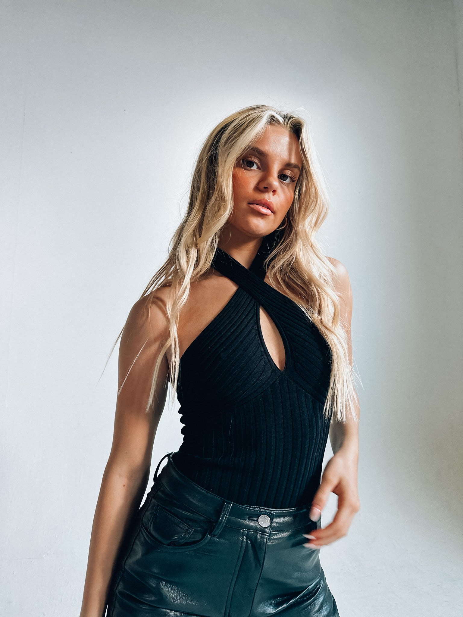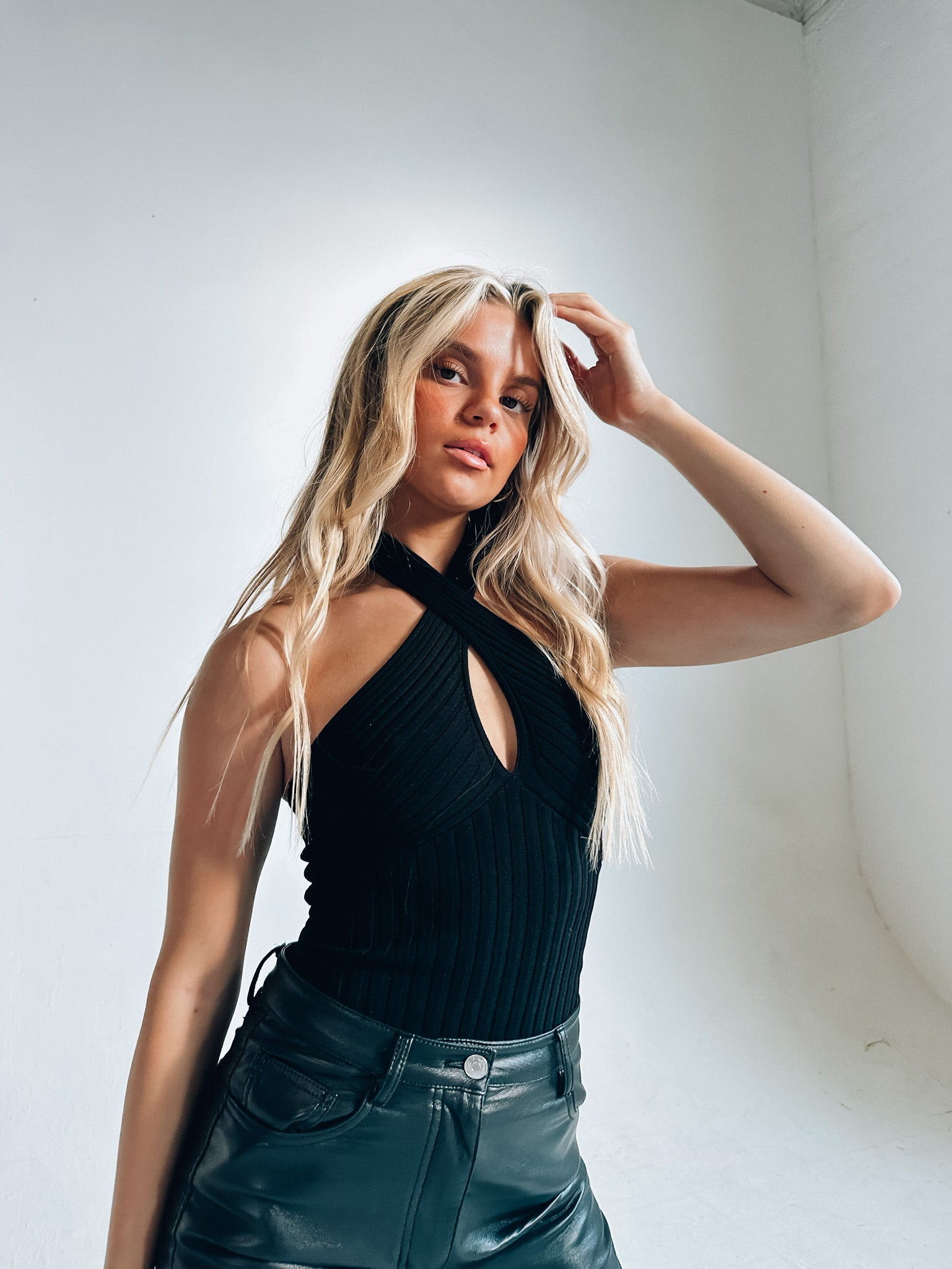Our Evie Ribbed Halter Bodysuit has a soft to the touch ribbed fabric that is form fitted to the body. This bodysuit has a cross halter detail that has a self tie around the neck. On the front you will see a small keyhole to give it a cute detail. The bodysuit has a "thong" like bottom with a snap button closure. This is the perfect bodysuit to have in your closet!