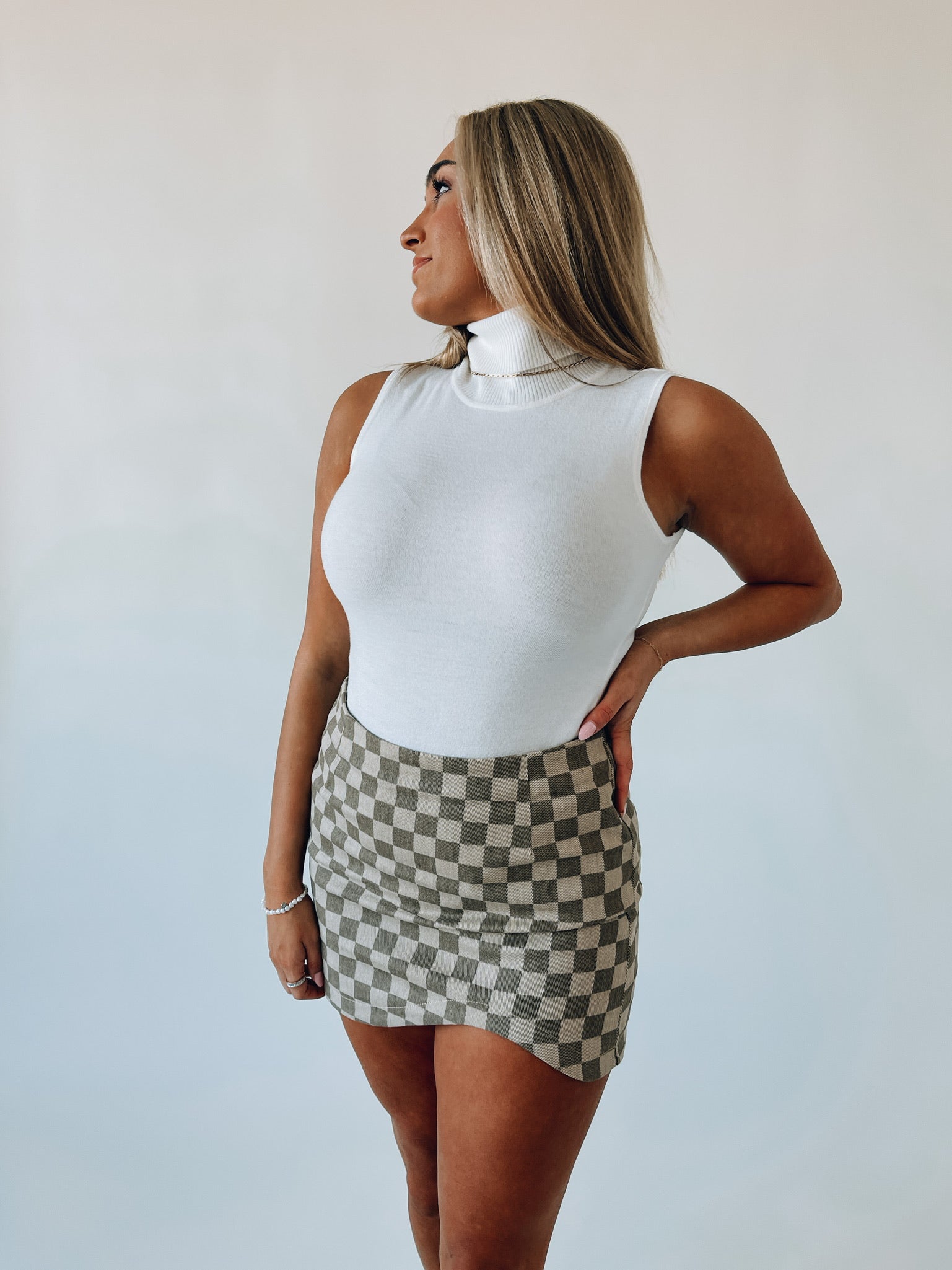 Our Sleeveless Turtleneck Bodysuit has a very soft sweater like fabric. This fitted bodysuit has a turtleneck collar that folds down. There is a two snap button closure on the bottom. Pair this with leather pants and a leather jacket for a cute outfit!