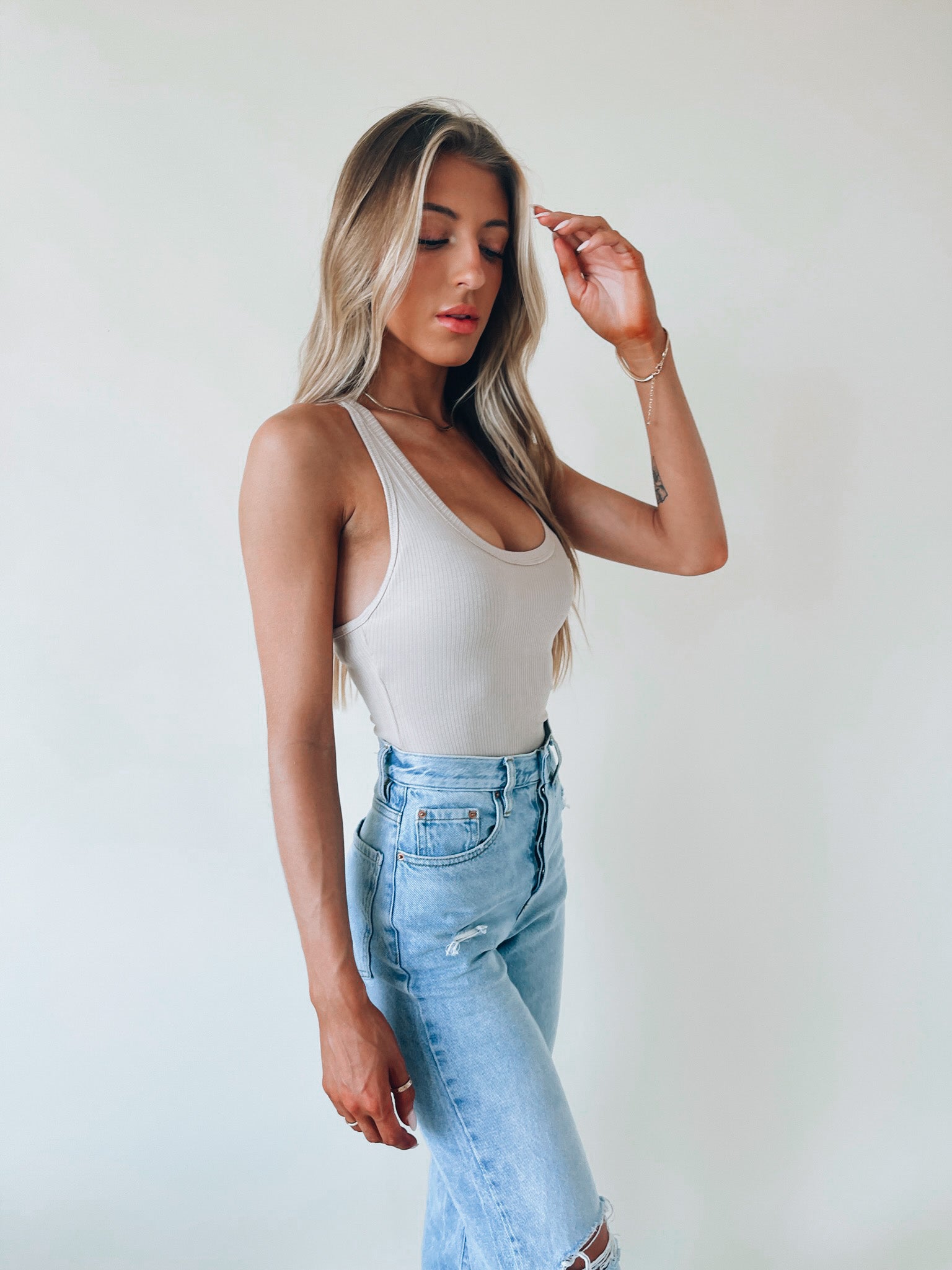 Our Basic Ribbed Khaki Bodysuit is a fitted bodysuit with a scoop neckline. There is a snap button closure on the bottom. This item is the perfect basic for your closet.