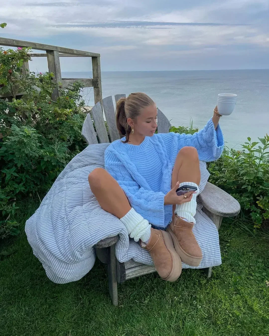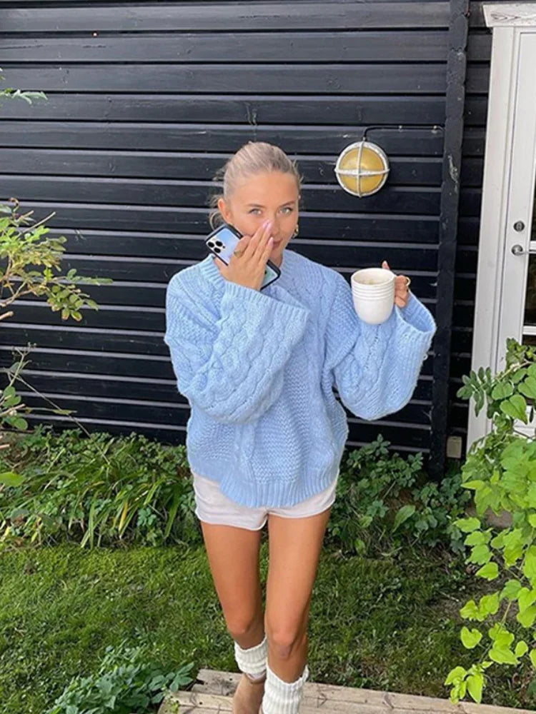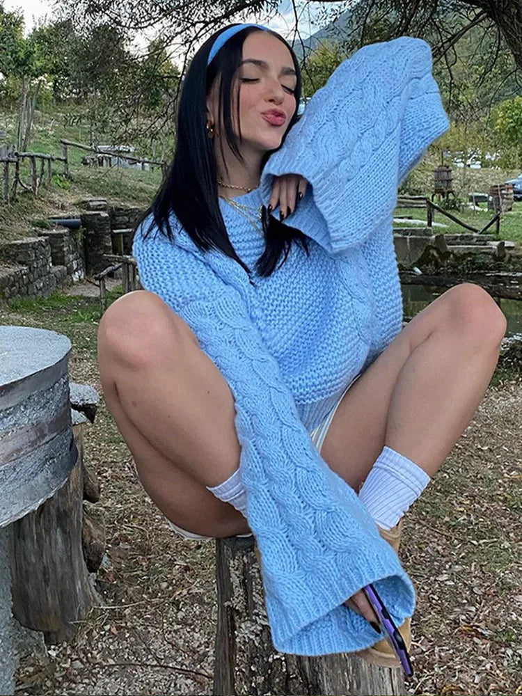 Women Blue Ribbed Knitted Loose Jumper Tops Fashion O Neck Long Sleeve Sweater