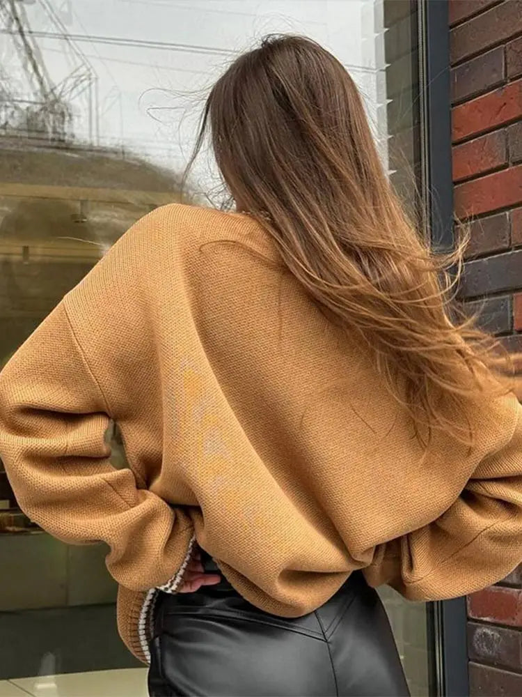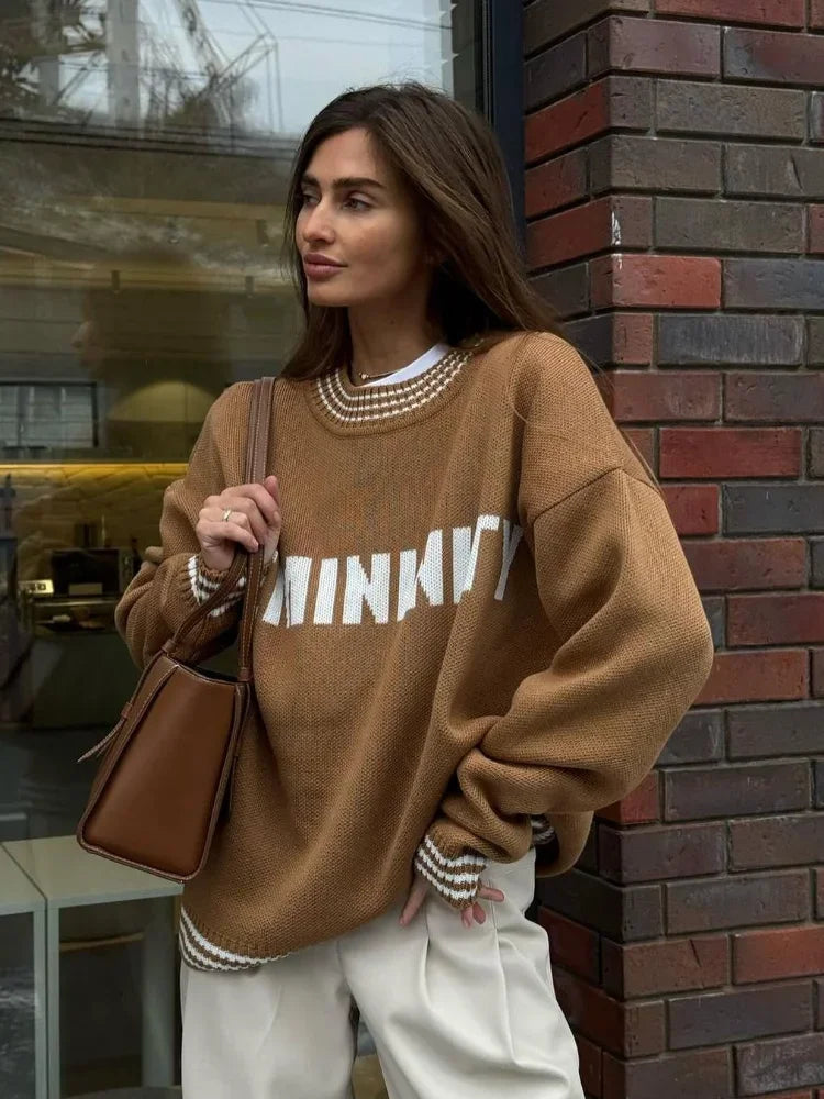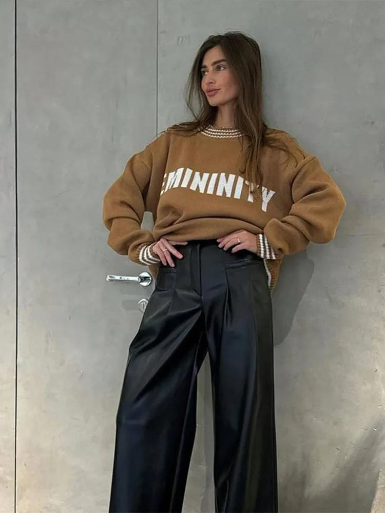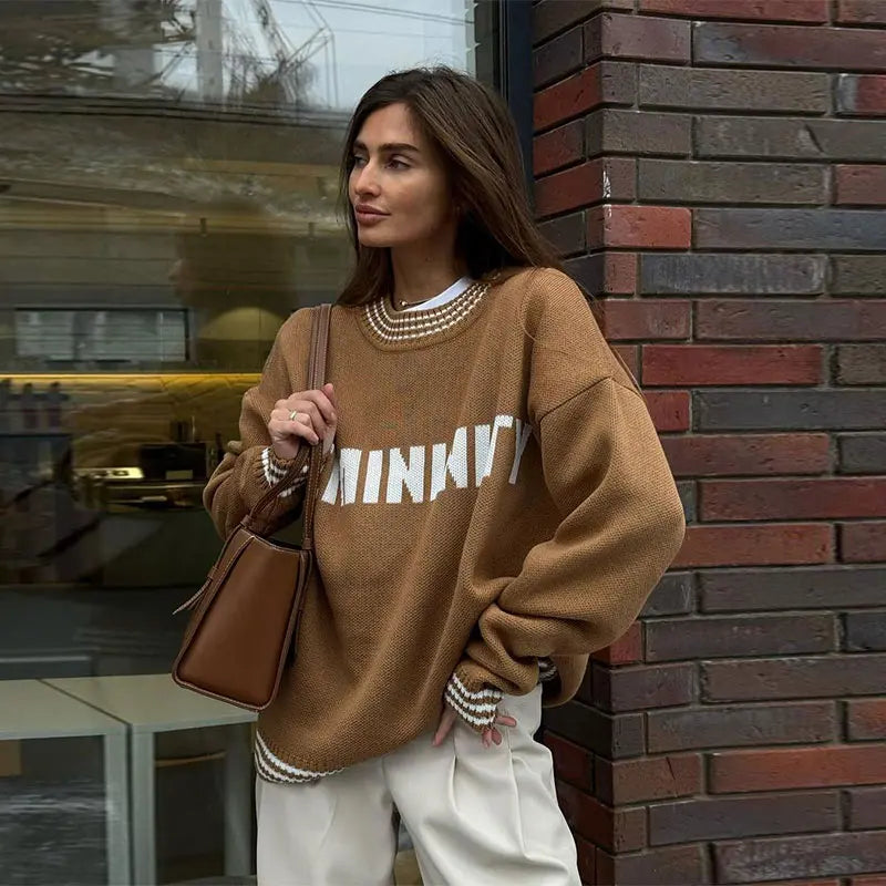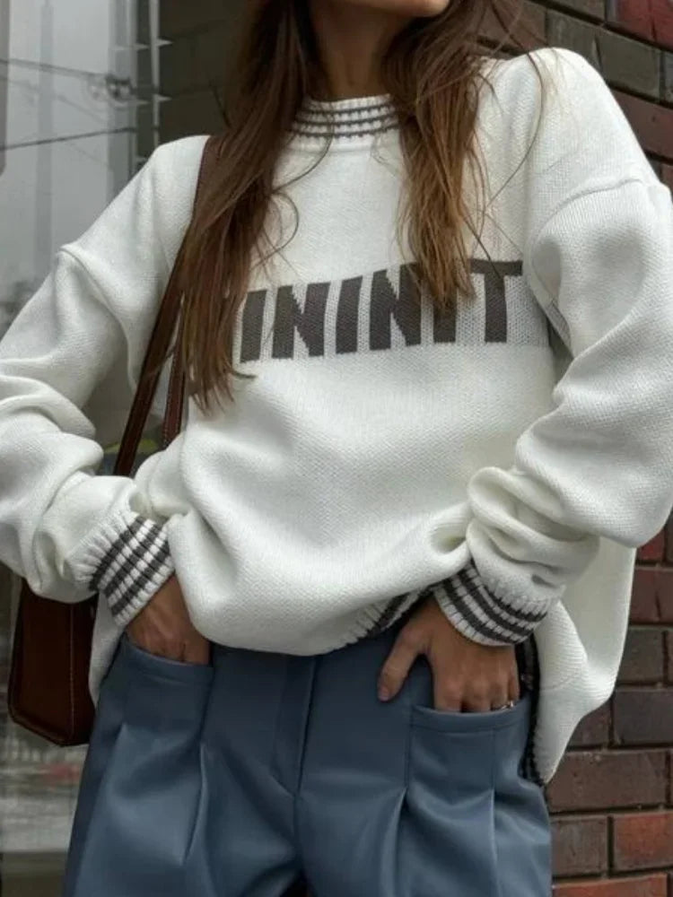 Contrast Letter Print Loose Knitted Women Casual O Neck Long Sleeve Sweater