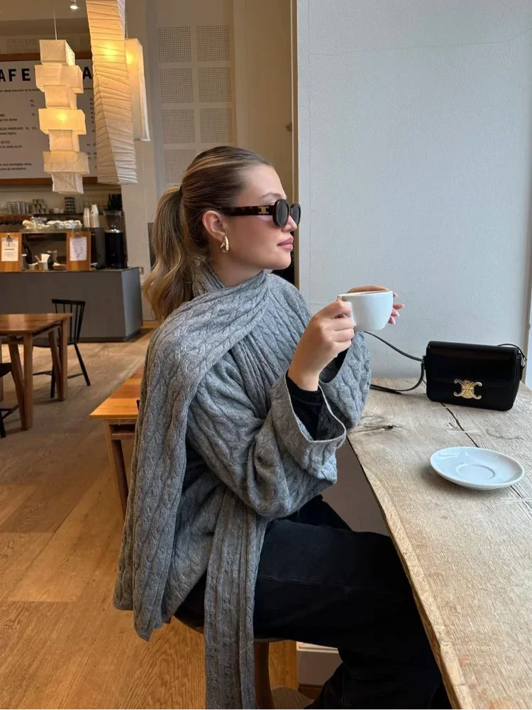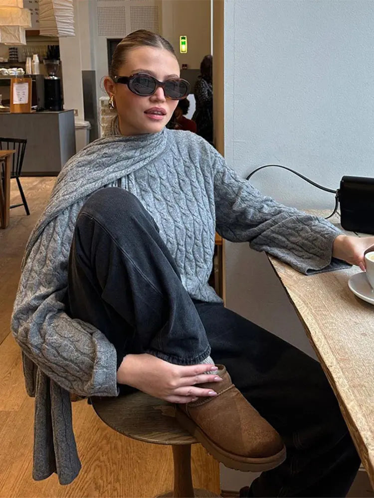 Women Chic With Scarf Knitted Fashion O Neck Basic Long Sleeves Sweater