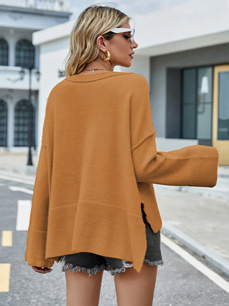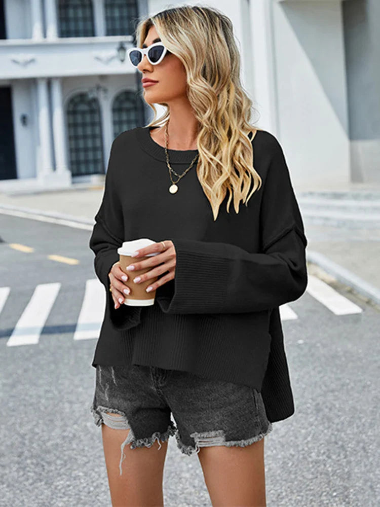 2025 Winter New Round Neck Women's Christmas Bell Sleeve Solid Color Casual Pullover Sweater