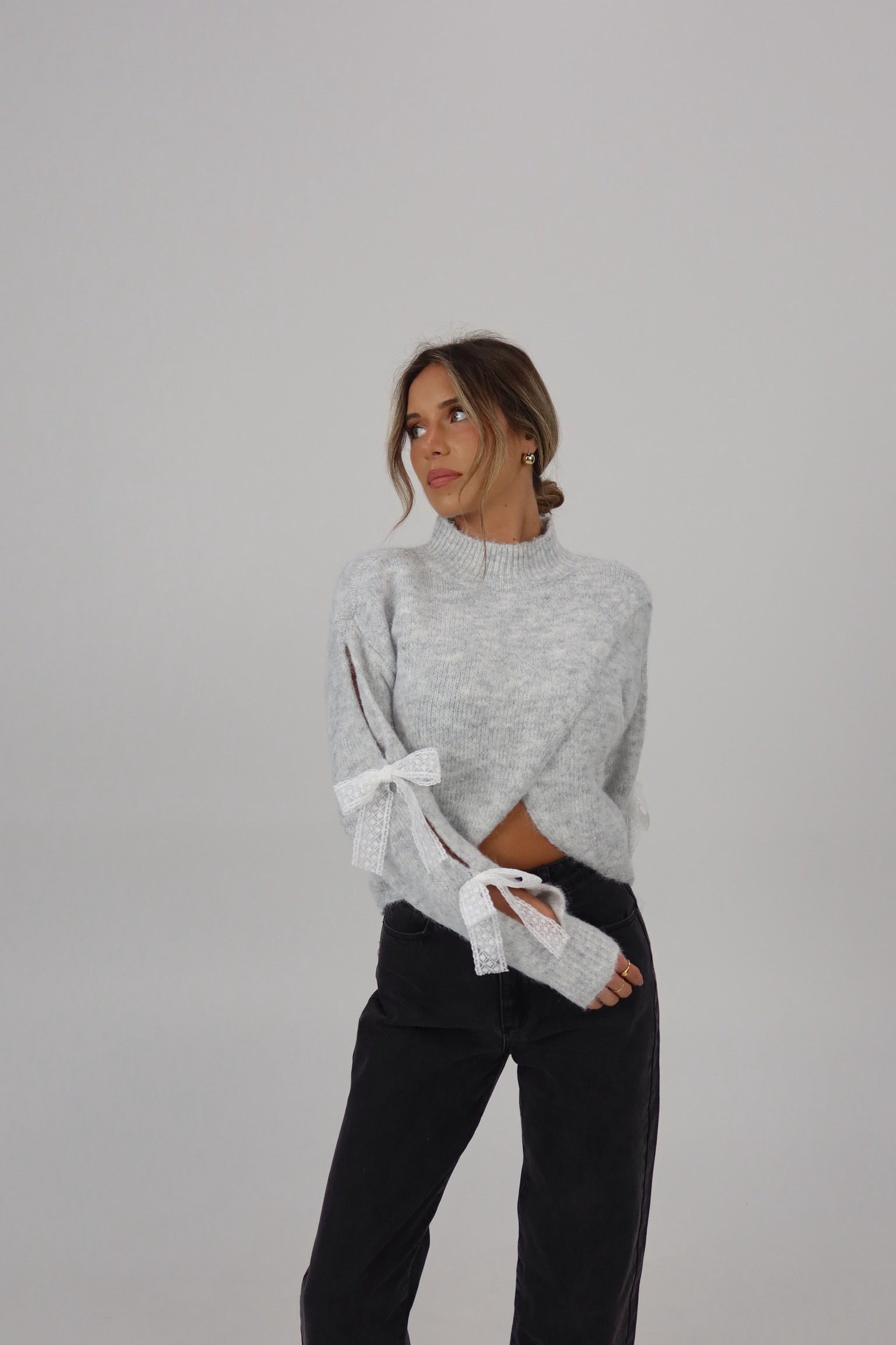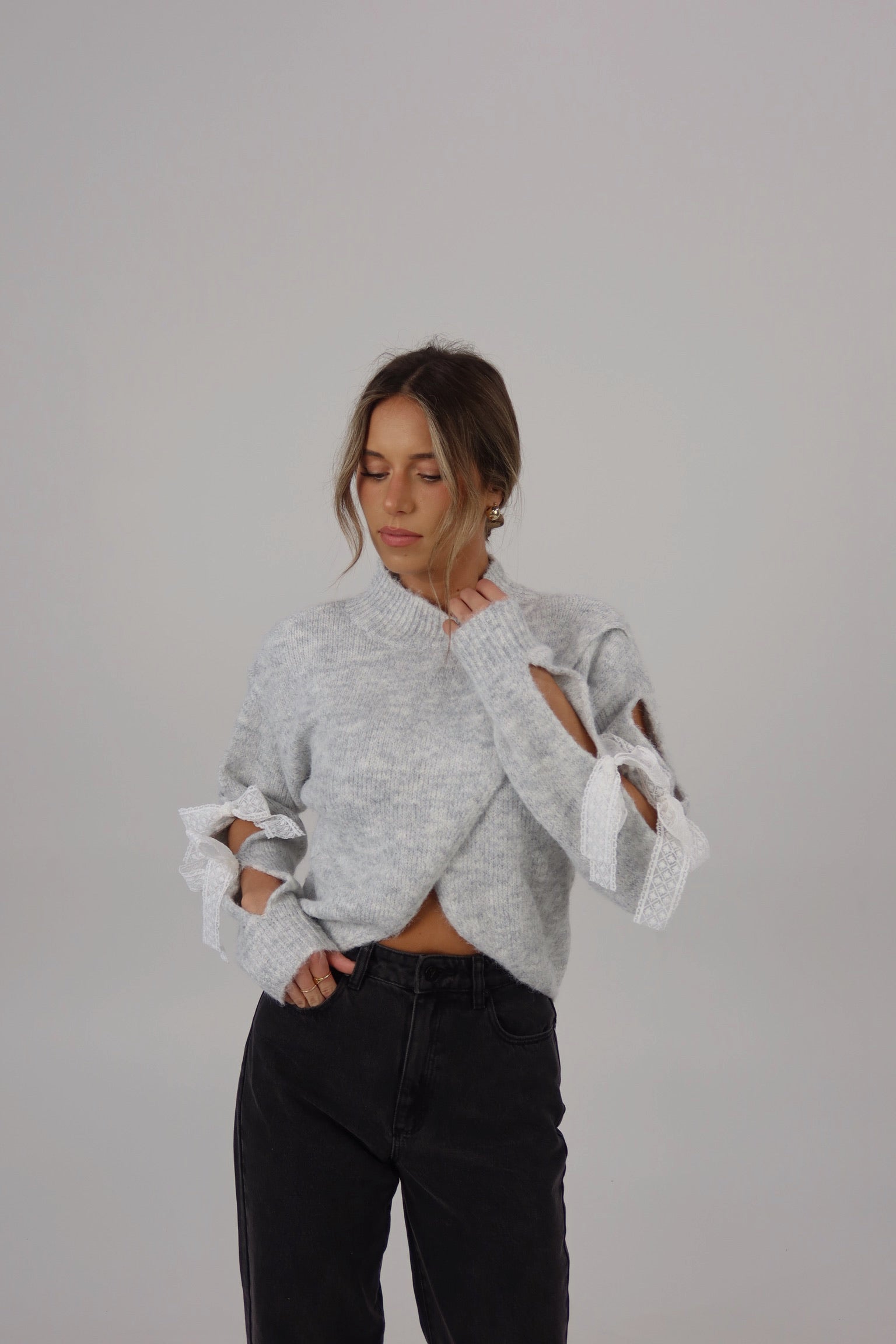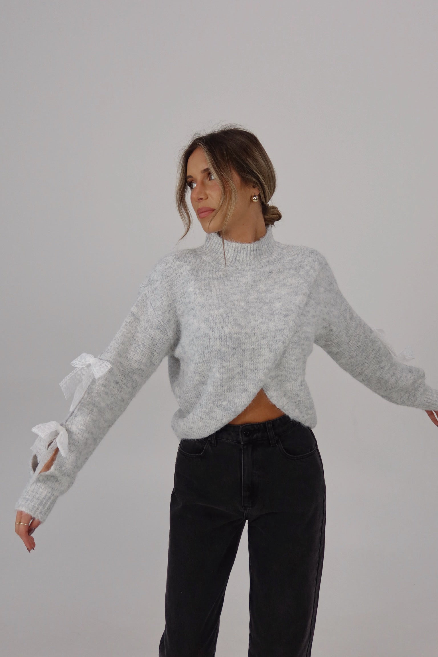 Discover our romantic cropped sweater with cross-front design and ribbon-adorned sleeve slits. Features elegant bow details. Ballet-inspired charm meets cozy style.