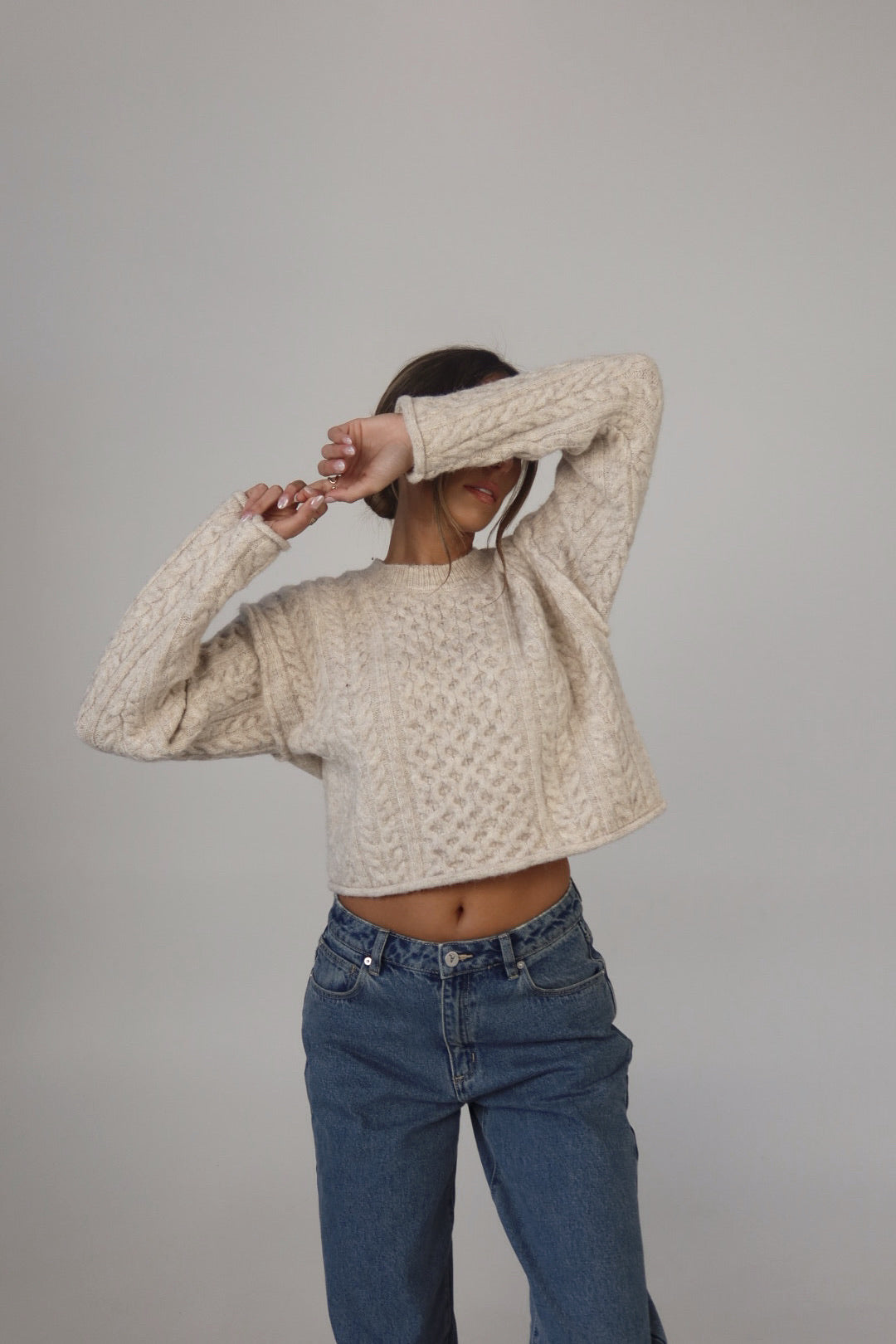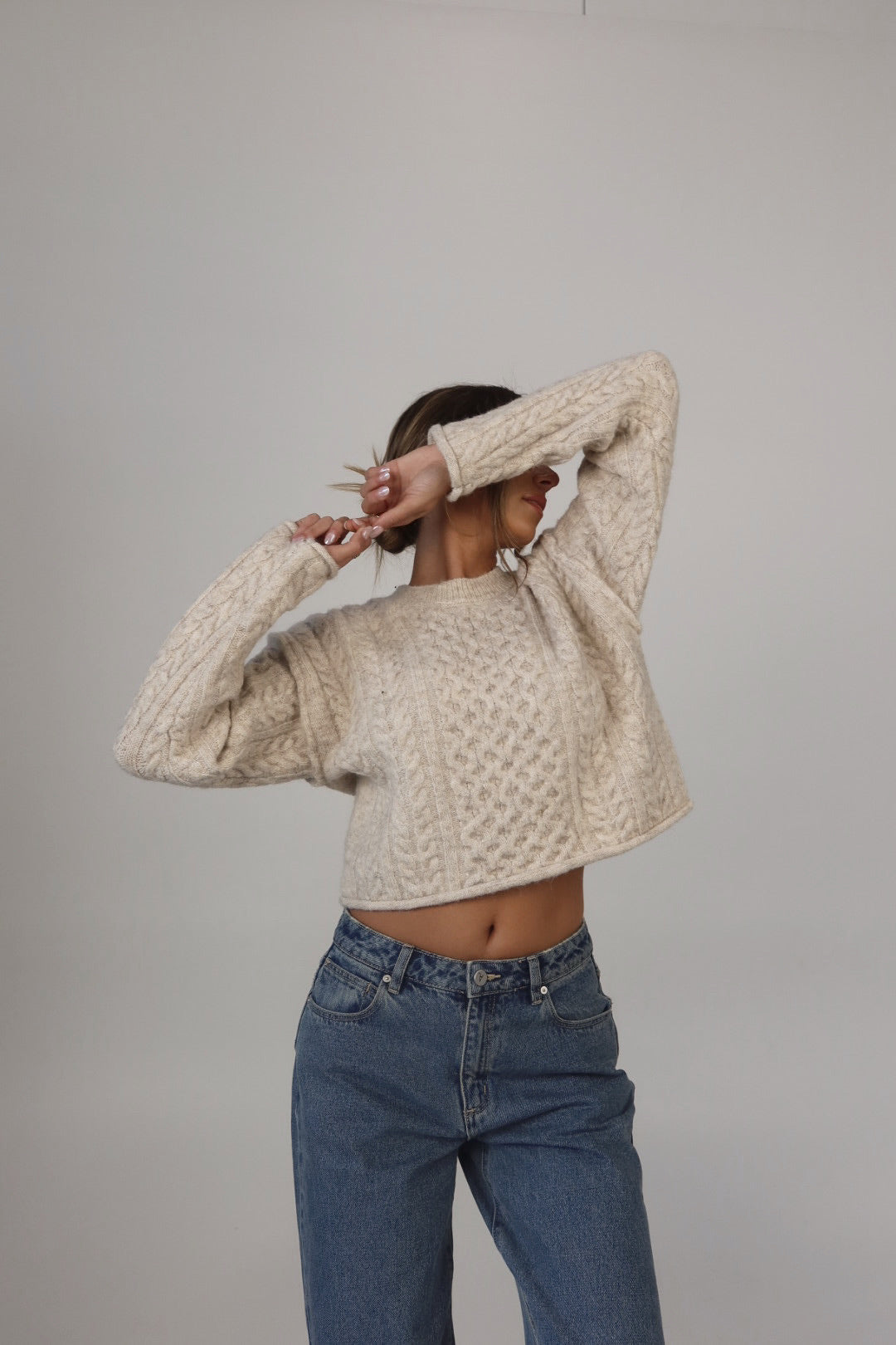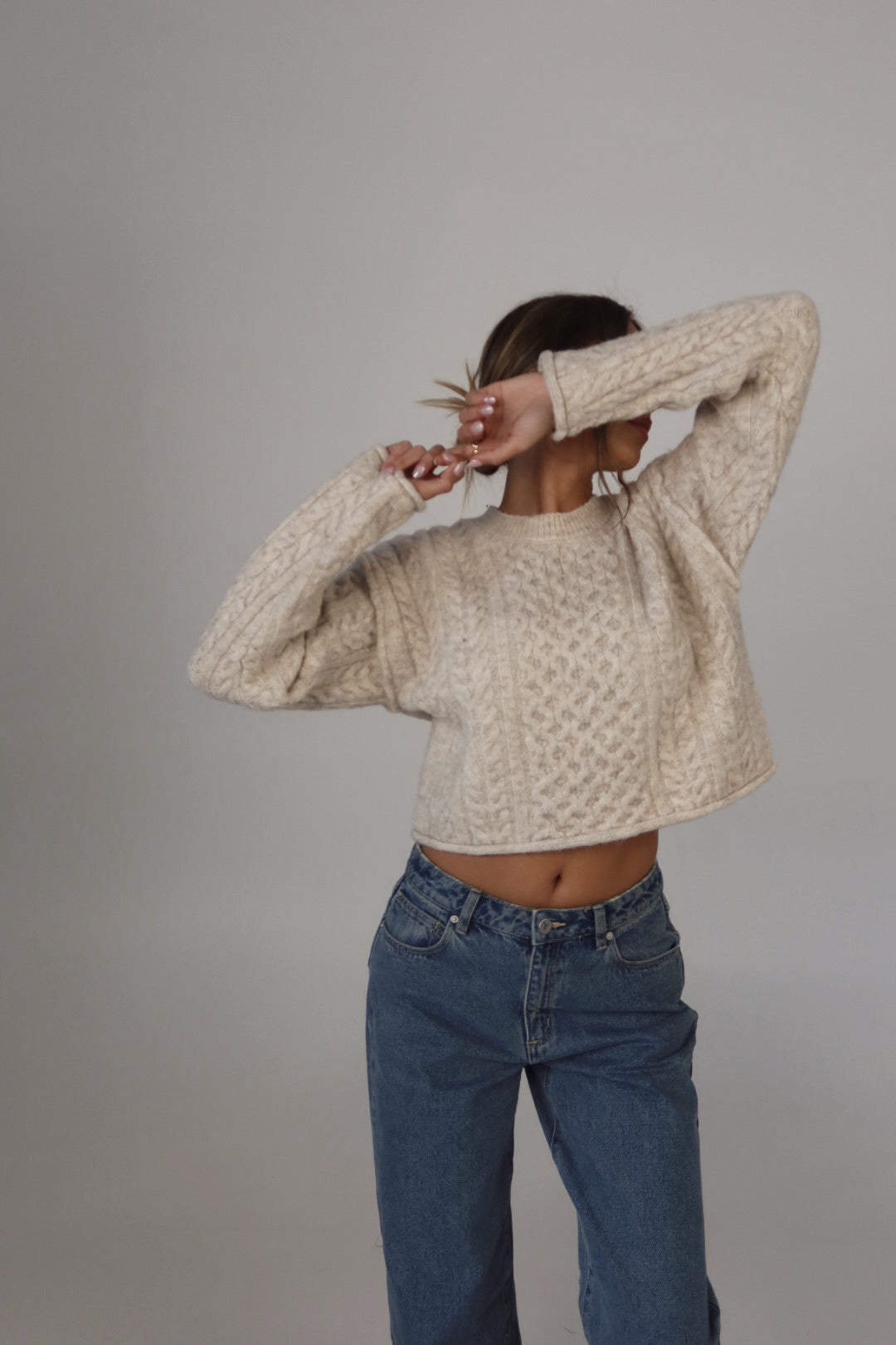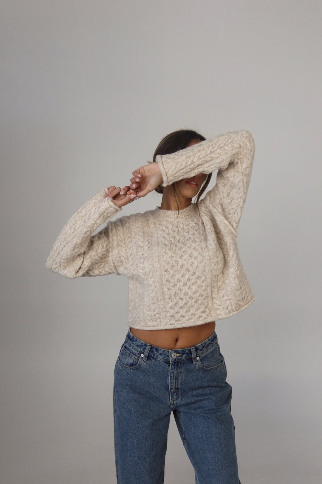 Discover our sustainable Eco Cable Knit Crew Sweater, crafted from recycled materials. Classic cable design meets modern comfort in this versatile layering essential.