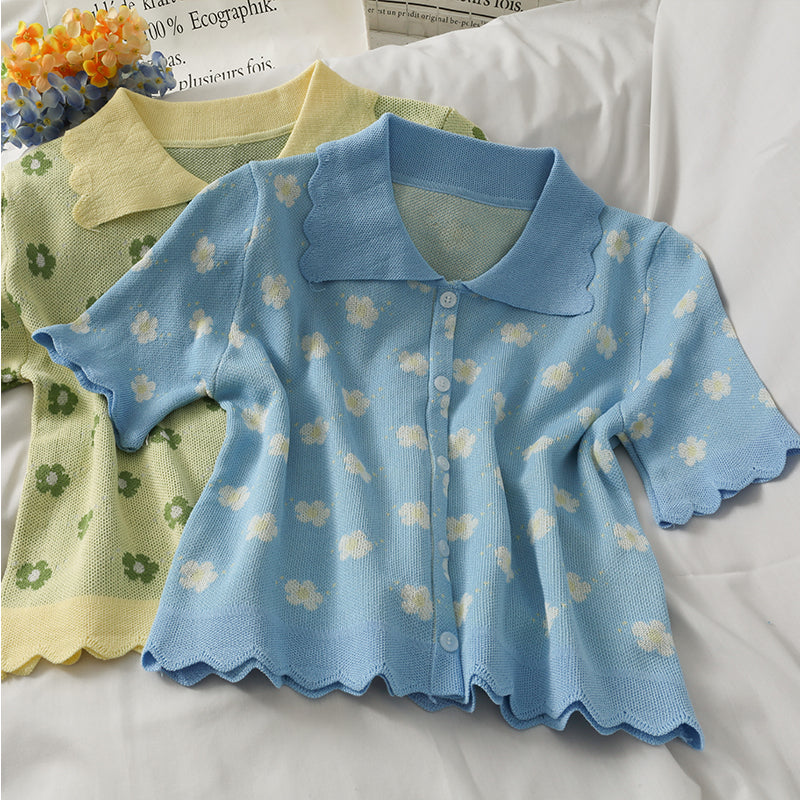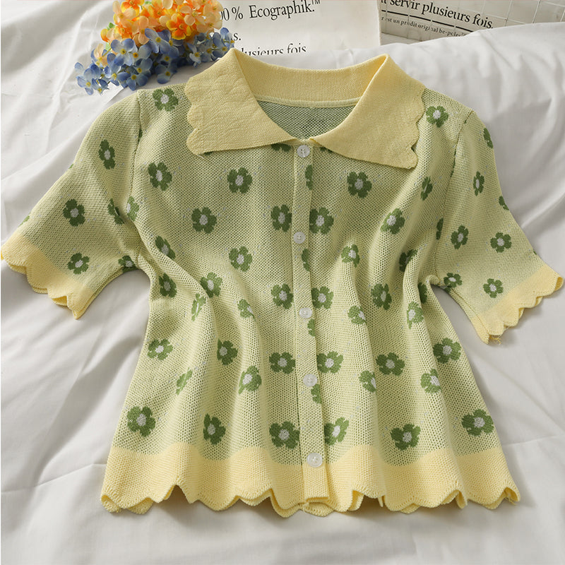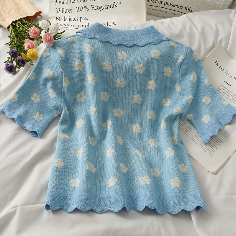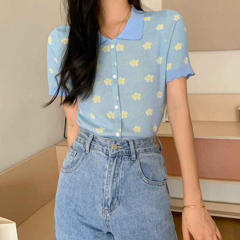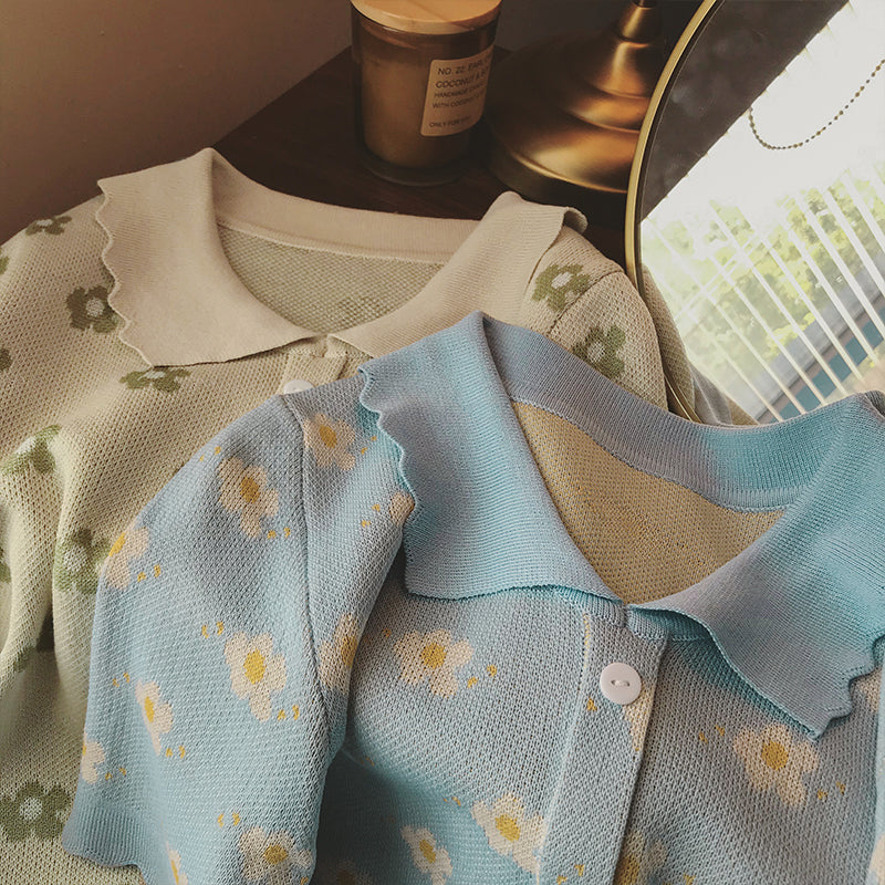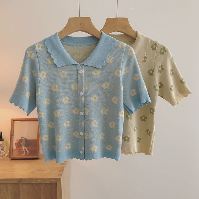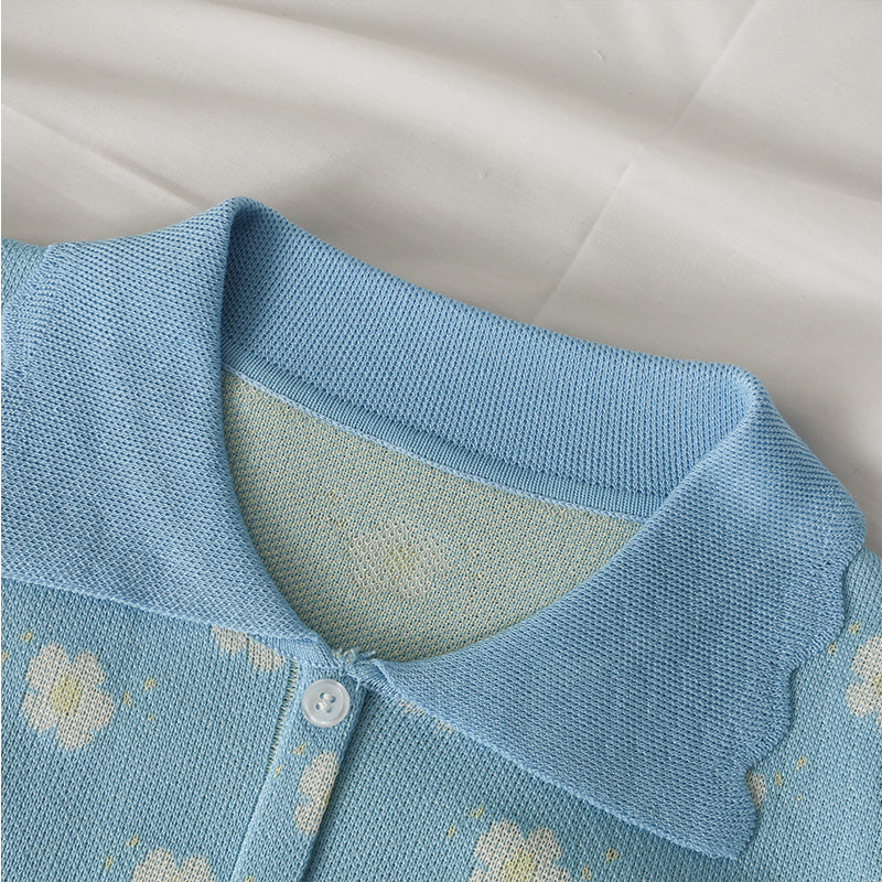 Cropped polo knit button up with daisies all over. Non-functional buttons.