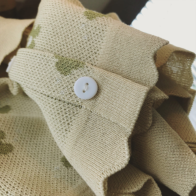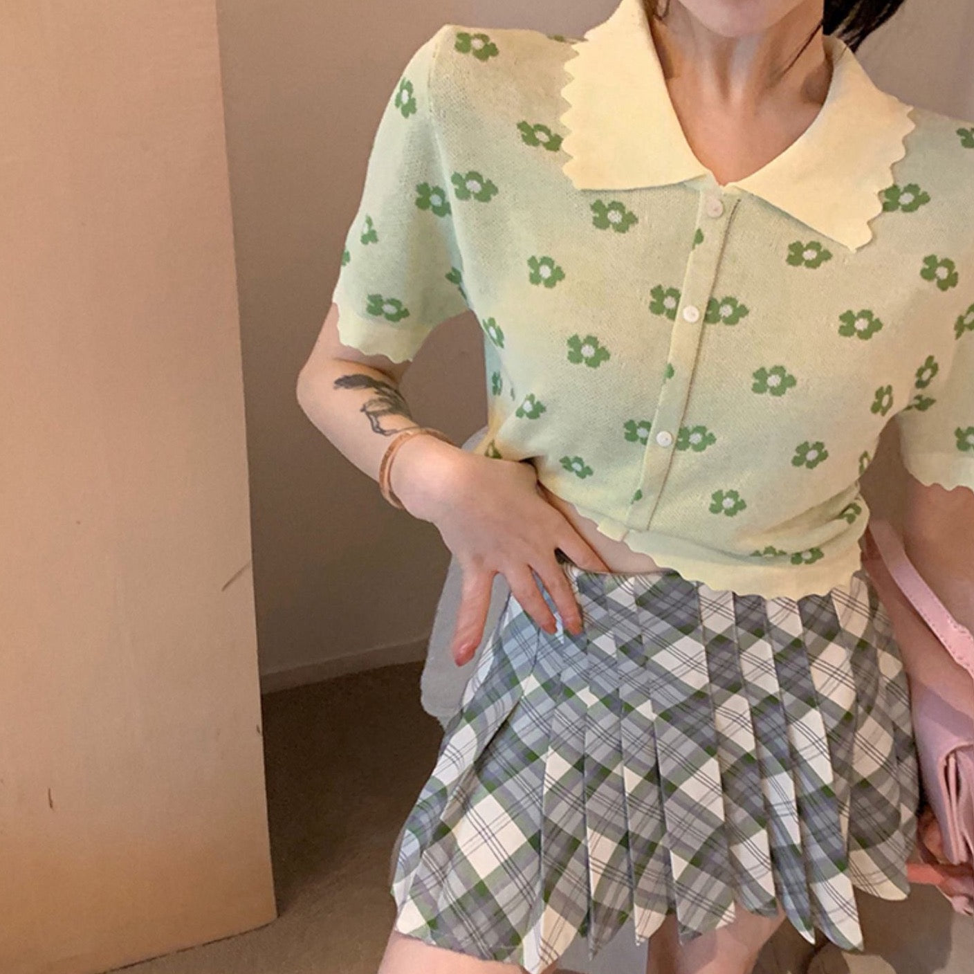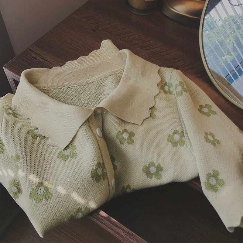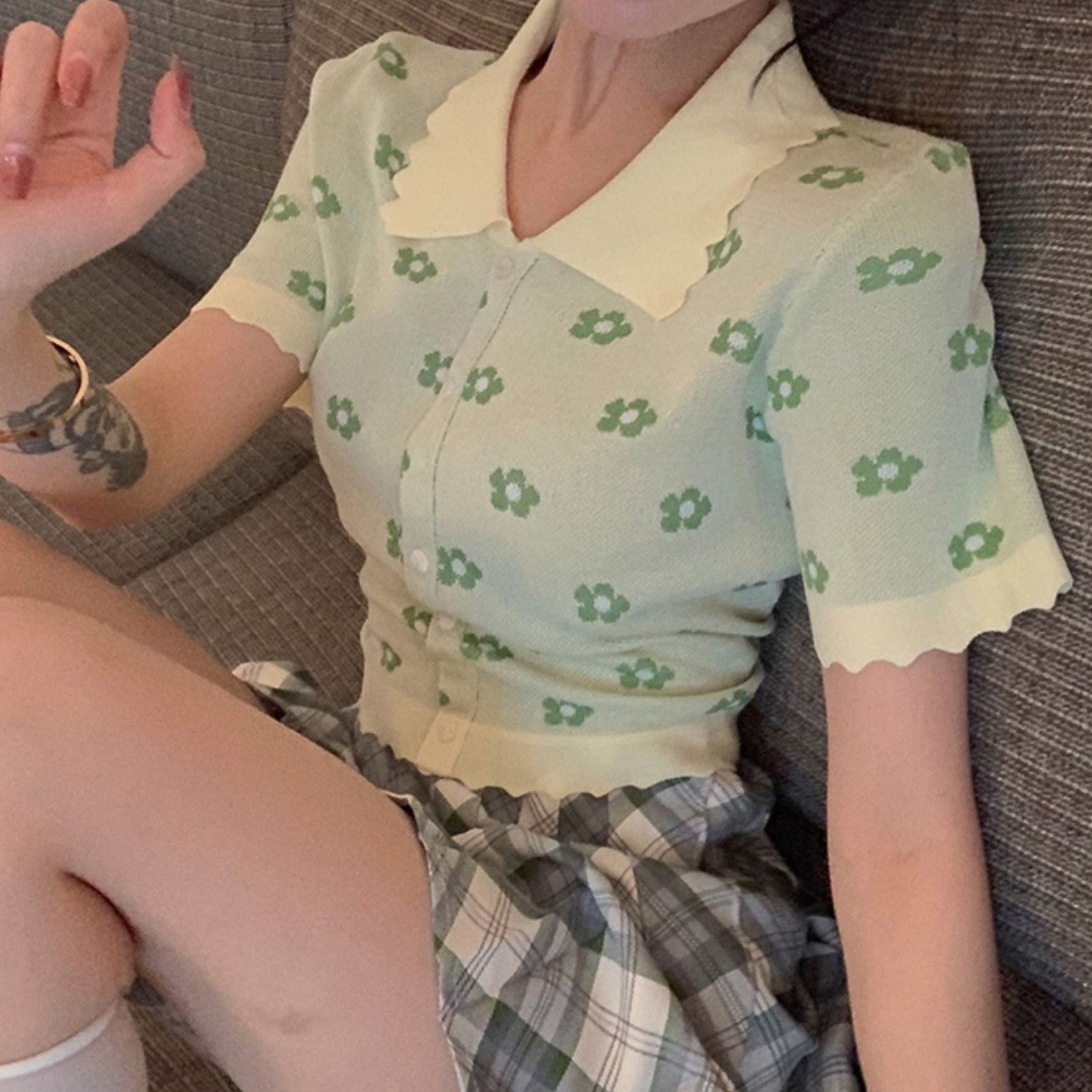 Cropped polo knit button up with daisies all over. Non-functional buttons.