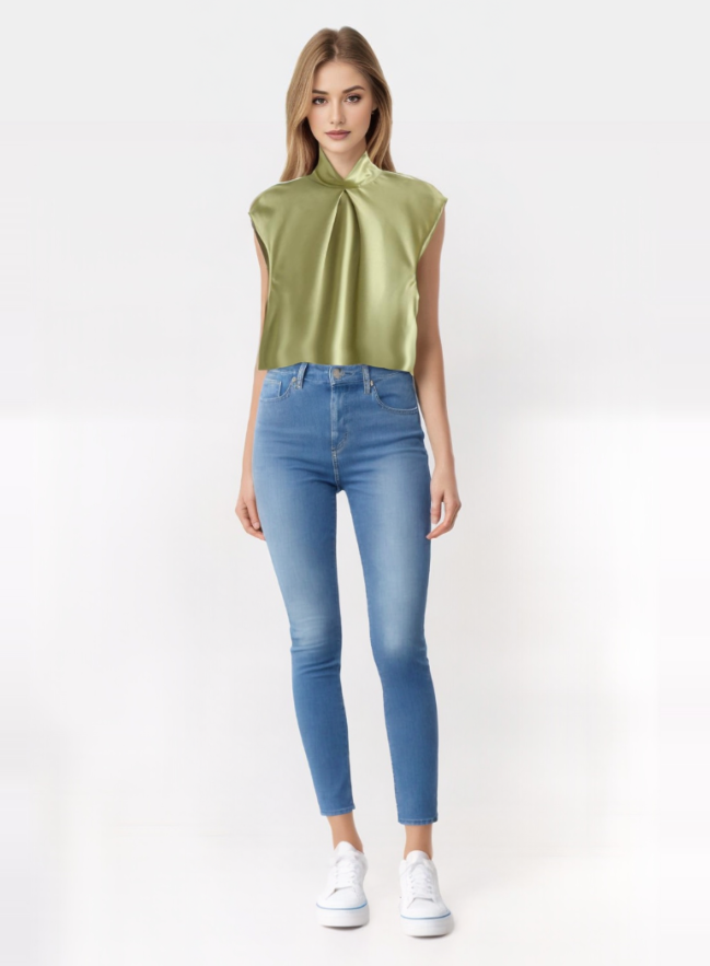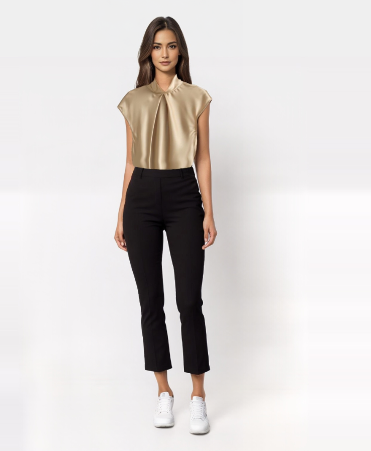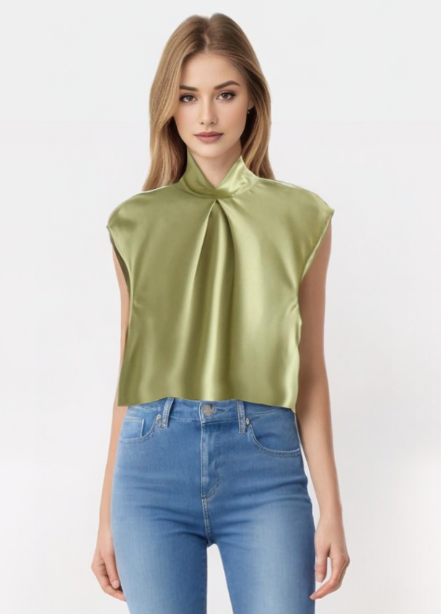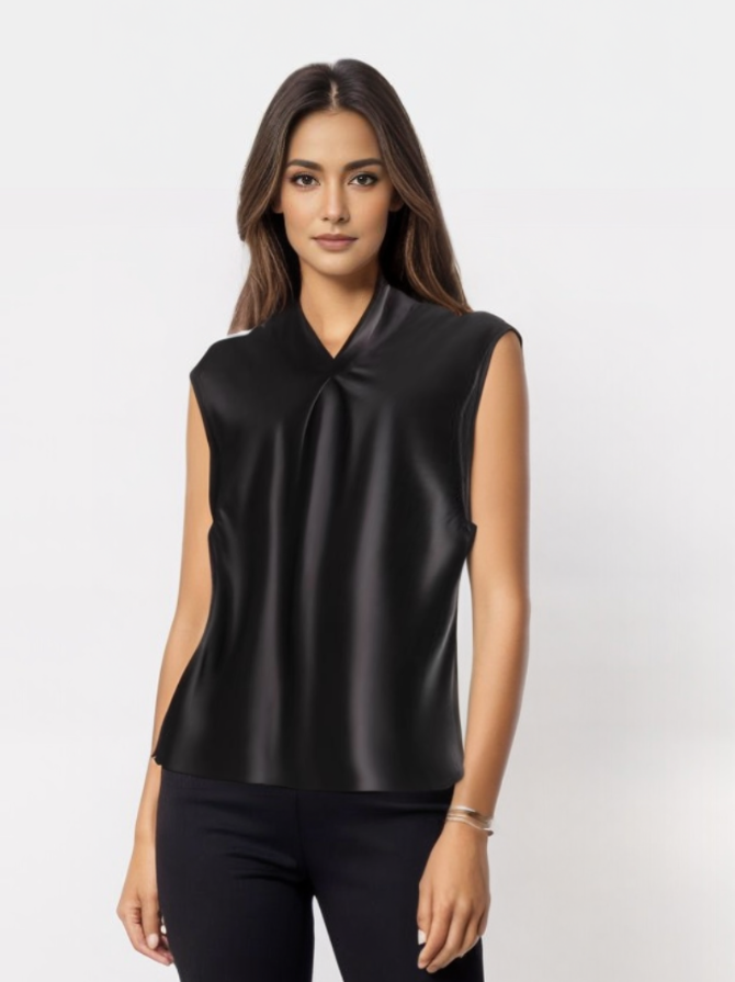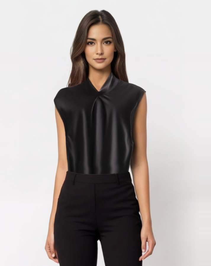 Élevez votre garde-robe avec la blouse LYRA, confectionnée dans un satin luxueux pour un look raffiné. Son col haut torsadé et son design sans manches offrent un mélange de style chic et de confort, parfait pour des occasions professionnelles comme décontractées.