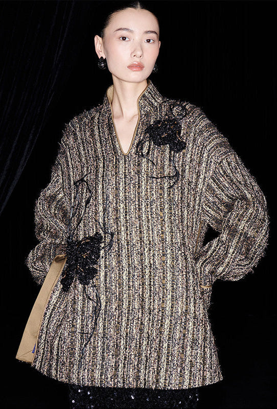 Elevate your style and conquer the unknown with our M essential Mackay designer top! Made from luxurious fabric and adorned with wrought iron orchid feathers and beads, this top is the epitome of class. Be bold and make a statement with this Master piece.