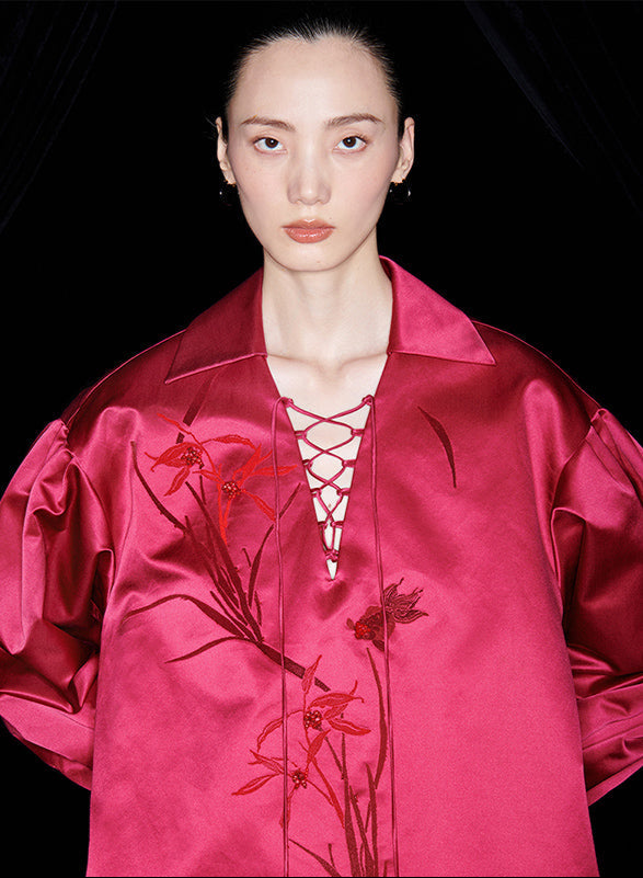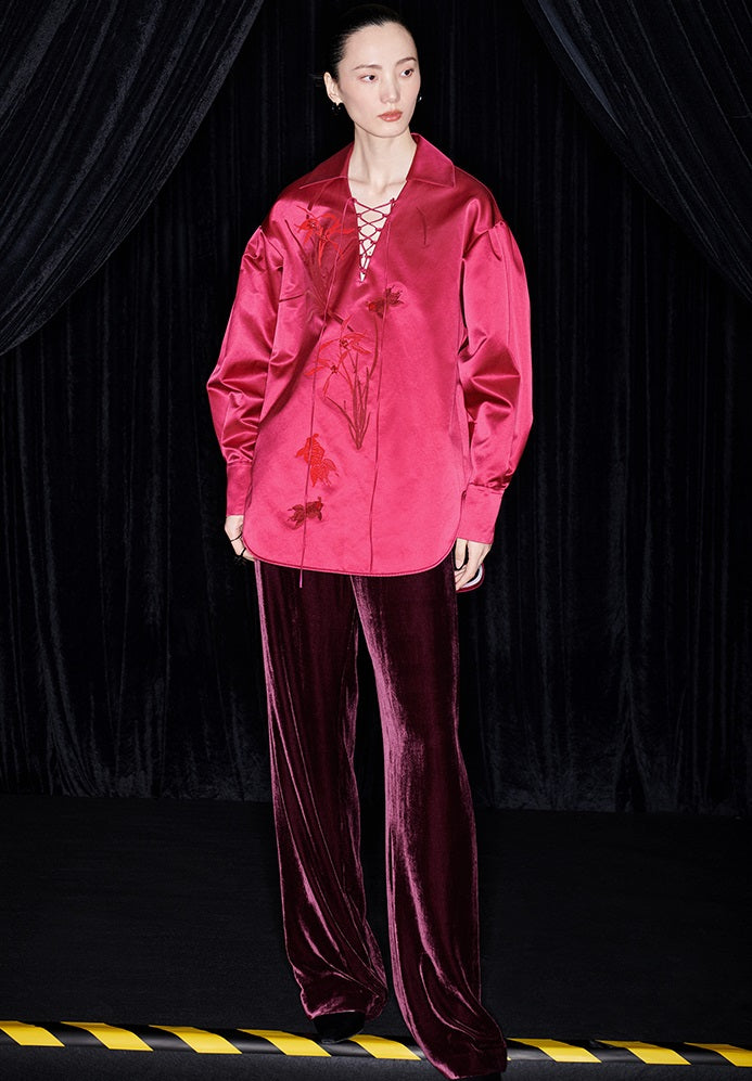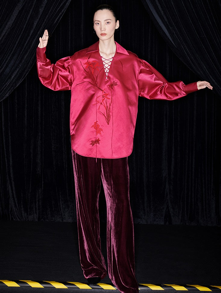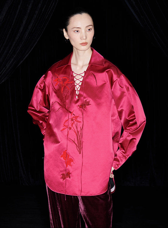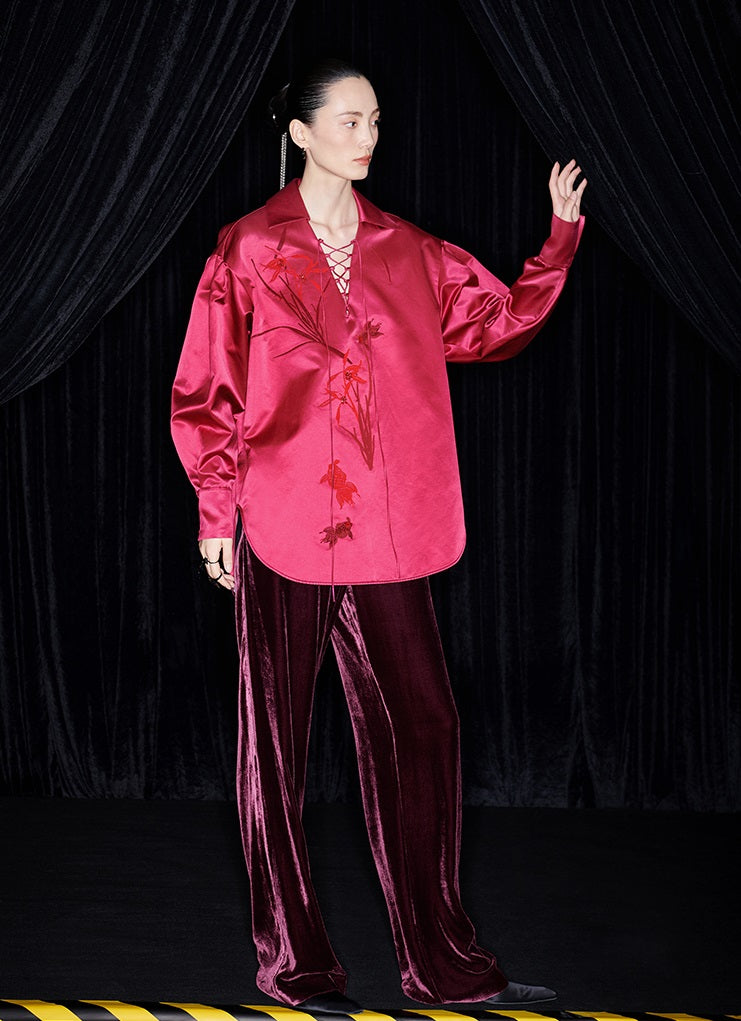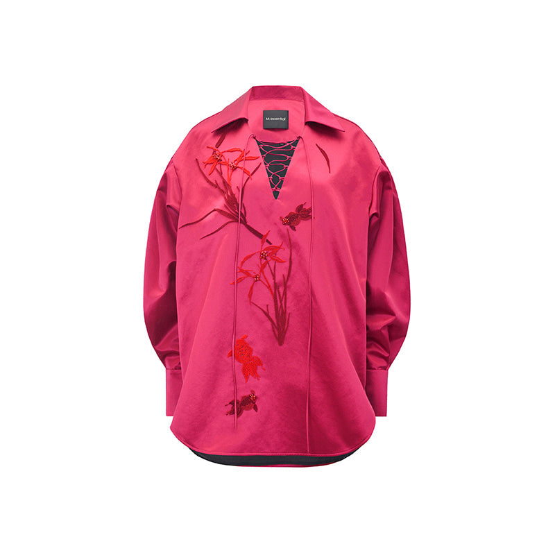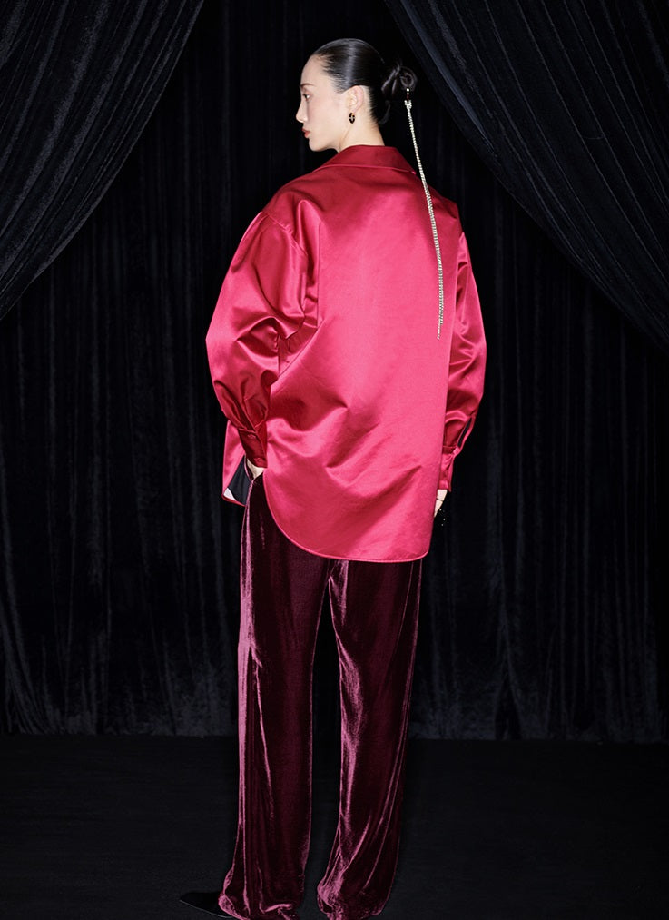 Take a risk and stand out with the M essential Mackay designer brand Drunken plum jersey lapel tie loose top! This classy top showcases a volume design that exudes confidence and adventure. Perfect for those who dare to be different! Only from M essential.