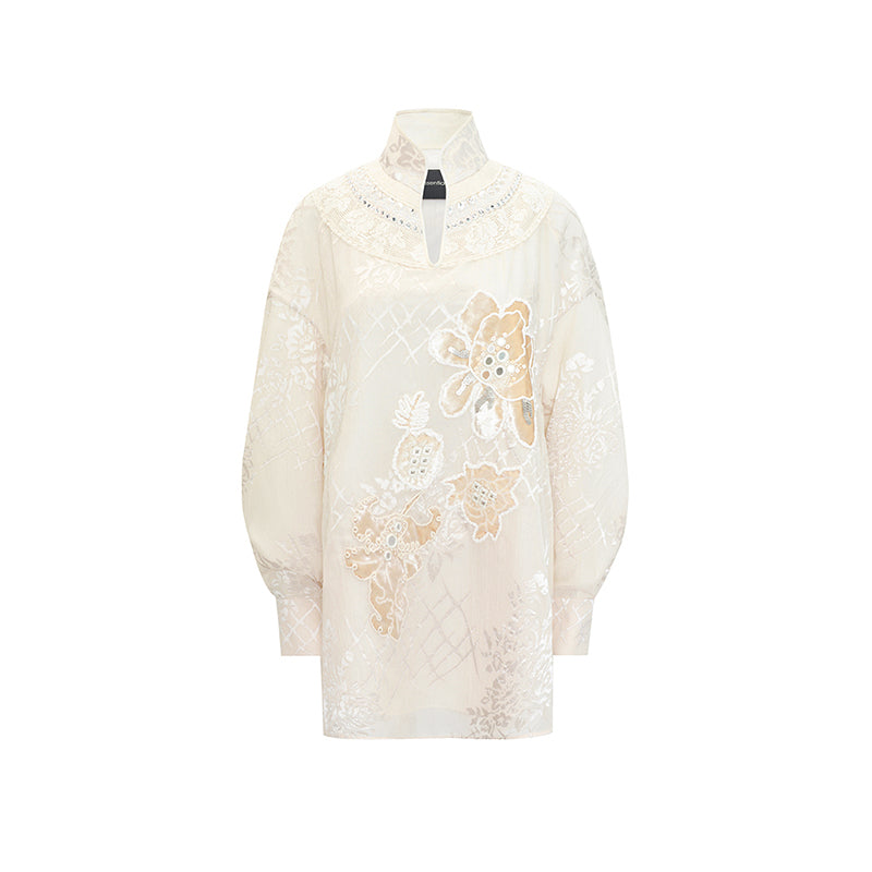 M essential Mackay designer Hip Burnt Stacked Trim Stand Collar Loose Top - sent.