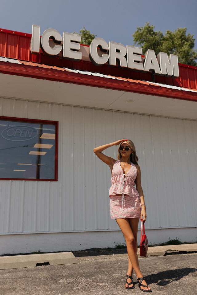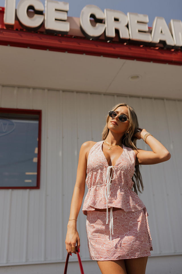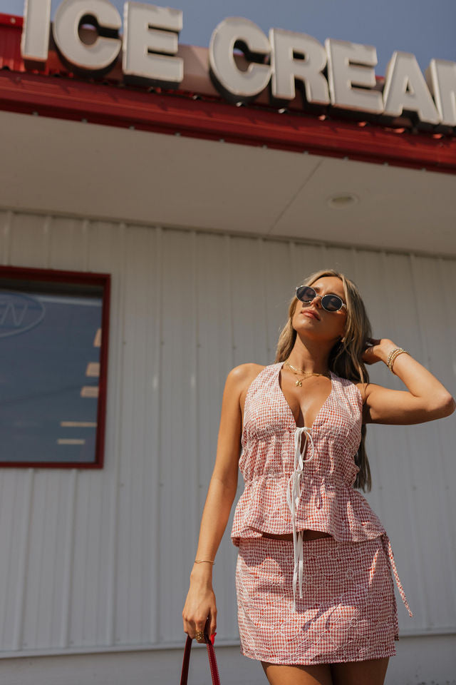 Claira Checkered Halter Top, Halter Tie Top, Double Tie Front Closure, Neck Strap Button Closure, Open Back with Tie Detail, Red and White Gingham Pattern with White Floral Stitching, Matching Skirt Set, Summer Essential, USA, Fourth of July Outfit Inspo, 4th Of July Set.