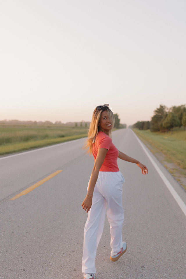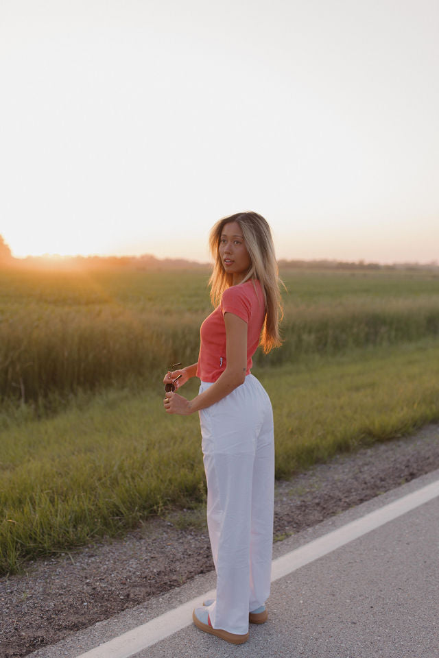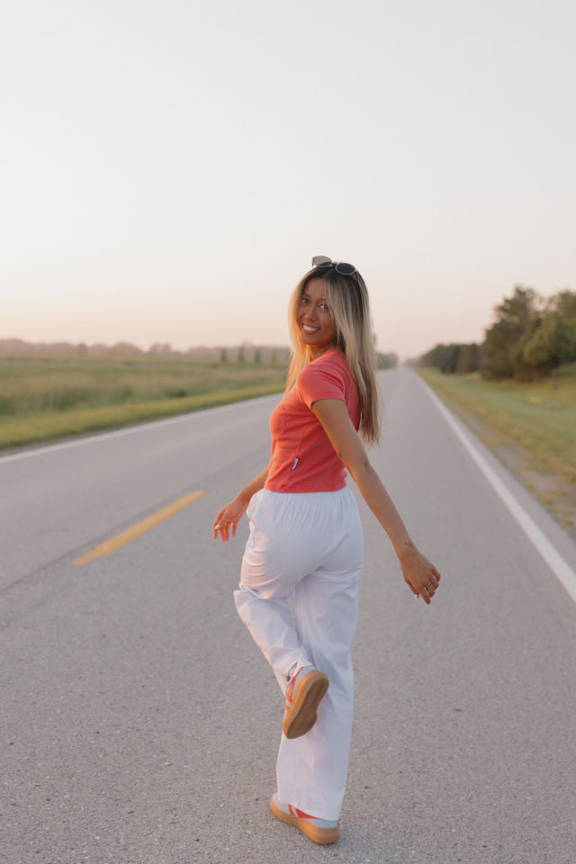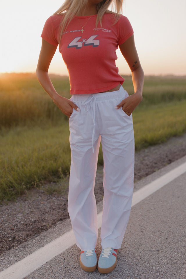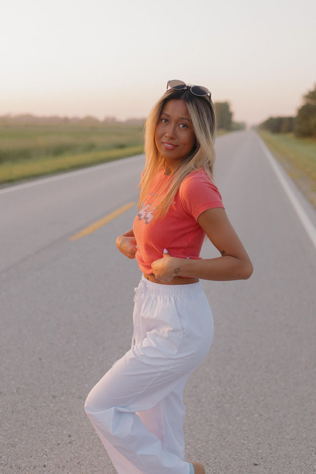 Off Road 4x4 Racing Baby Tee In Vintage Red, The Laundry Room, Baby Tee, Red Baby Tee, Vintage Inspired Graphic Baby Tee, Cropped Tee, Round Neckline, Short Sleeve Tee, Fitted Baby Tee, Red Tee with Blue and White "4x4" Front Print Graphic, Ribbed Jersey Material, Lightweight Fabric, USA, Fourth of July Top.