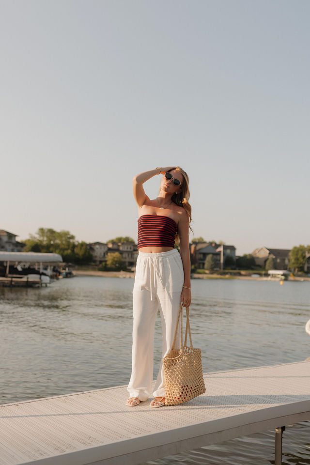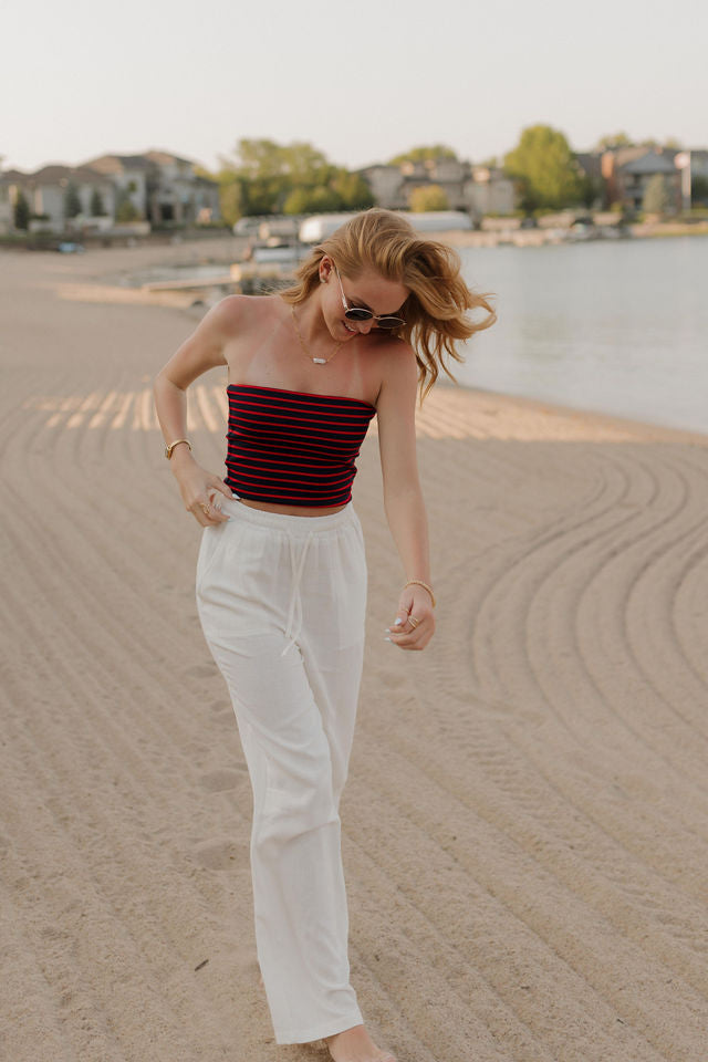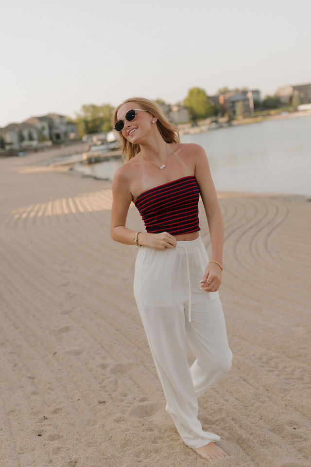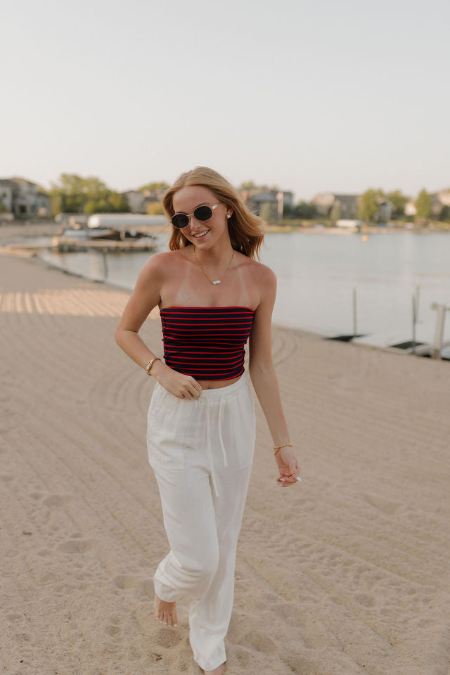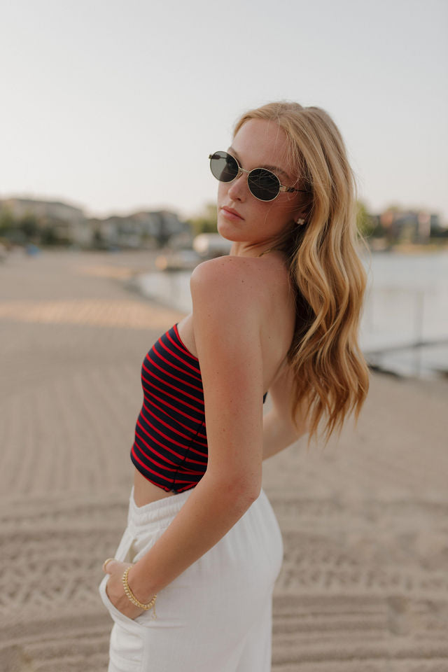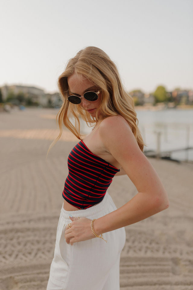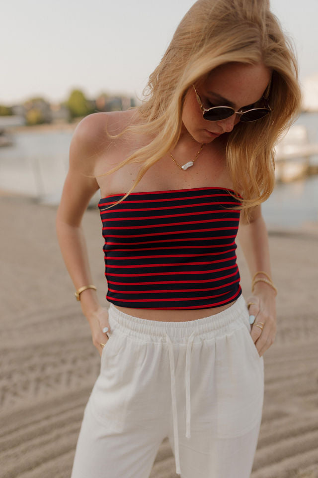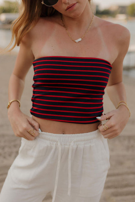 Sailor Striped Tube Top, Strapless Top, Fitted Top, Tube Top, Navy and Red Striped Tube Top, Straight Neckline, Hidden Side Zipper Closure, Stretchy Material, Crop Top, USA, Fourth of July Top, Fourth of July Outfit Inspo.
