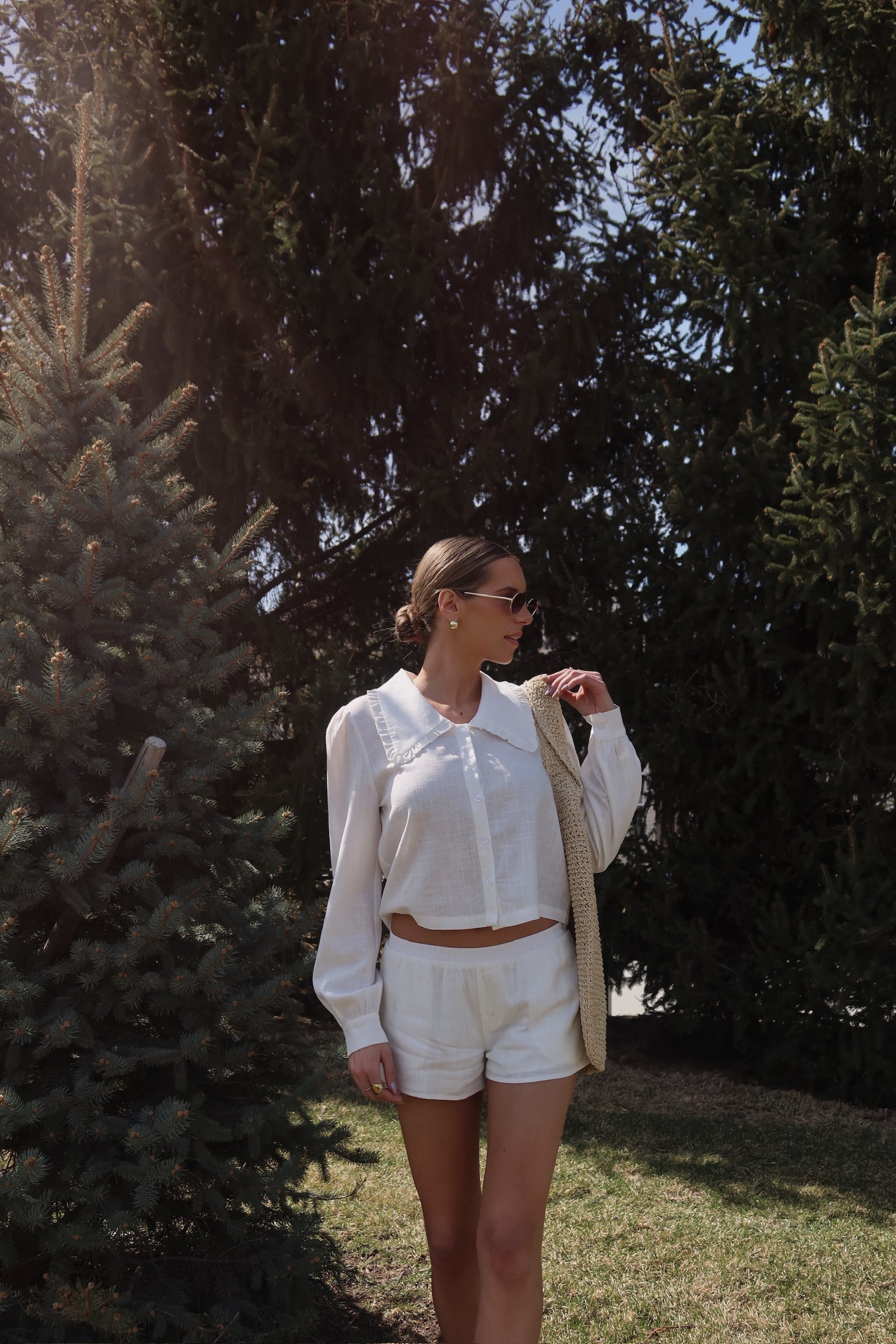 Linen Ruffled Collar Button Up Top, Long Sleeve Top, Off White Long Sleeve, Off White Top, Ruffle Detail Collar, Button Down Top, Linen Long Sleeve, Spring Essential, Staple Piece, Effortless Fit, Flowy Long Sleeve Top.