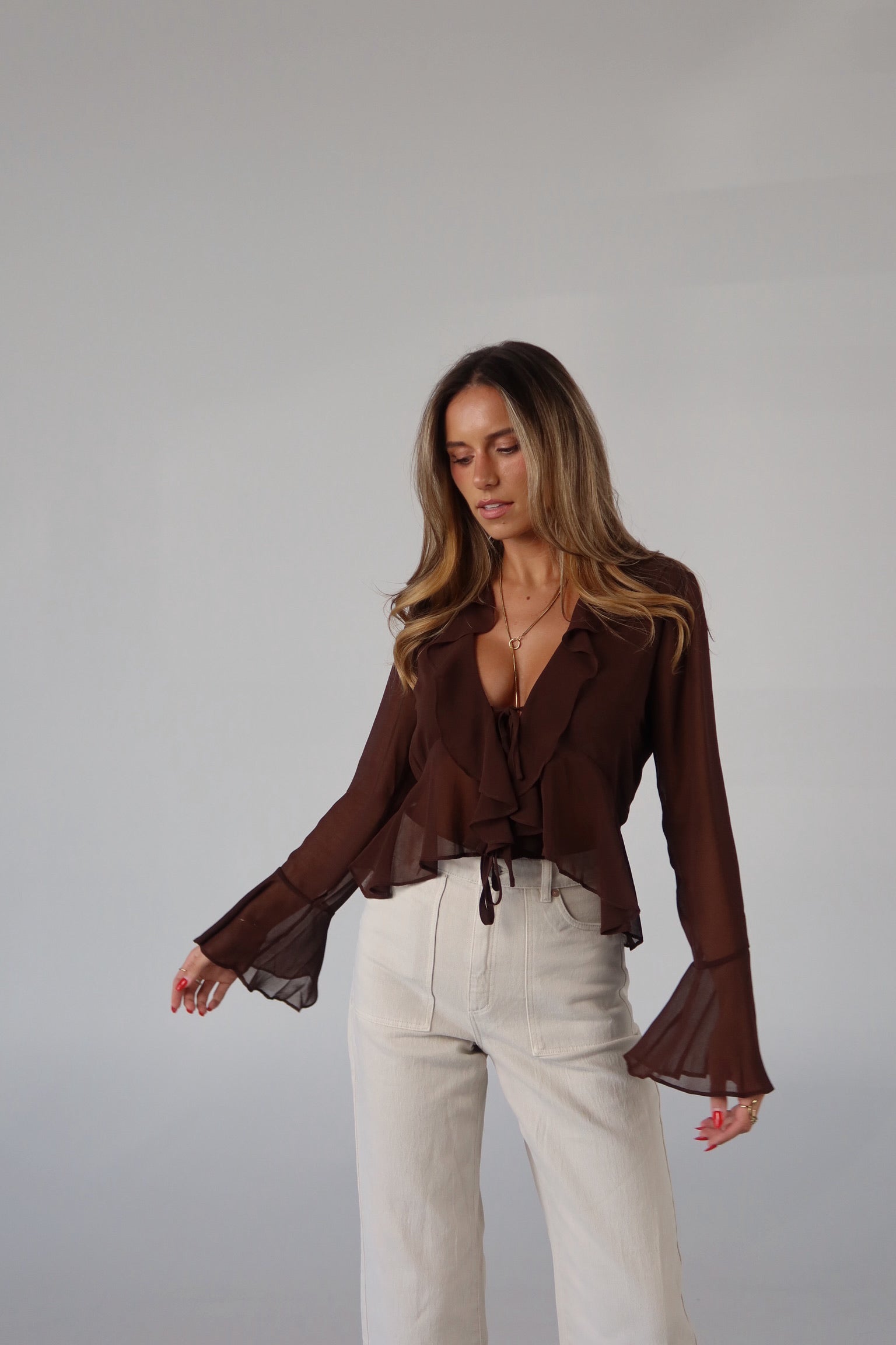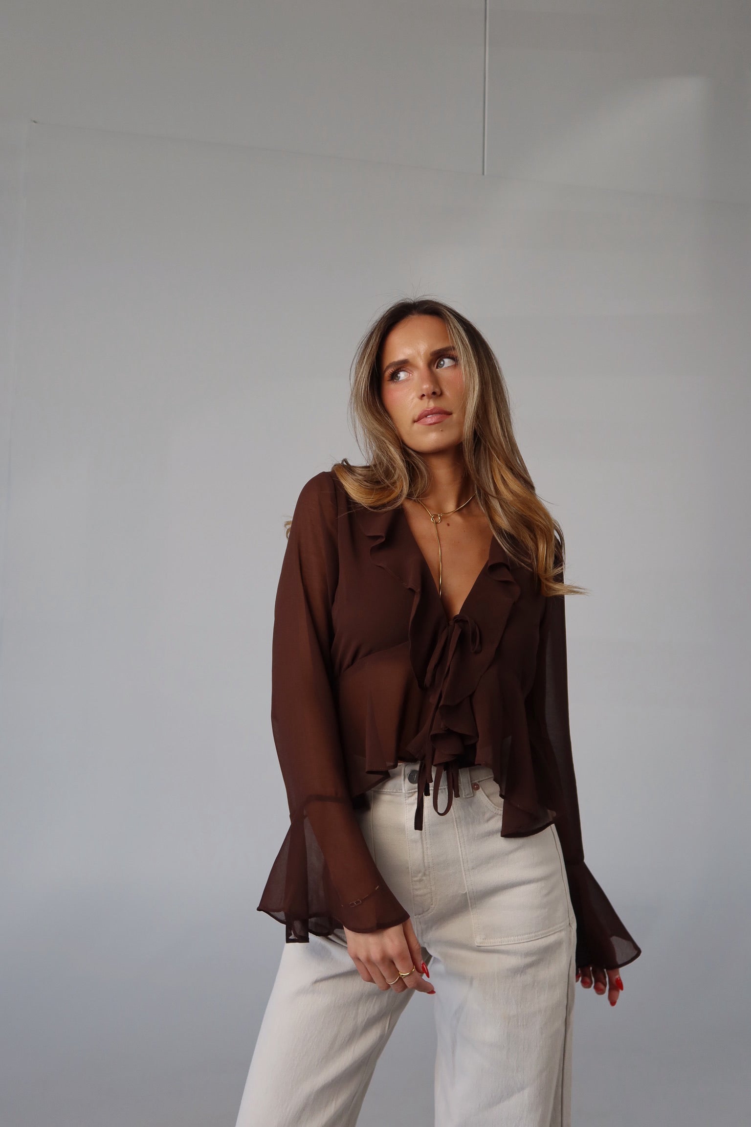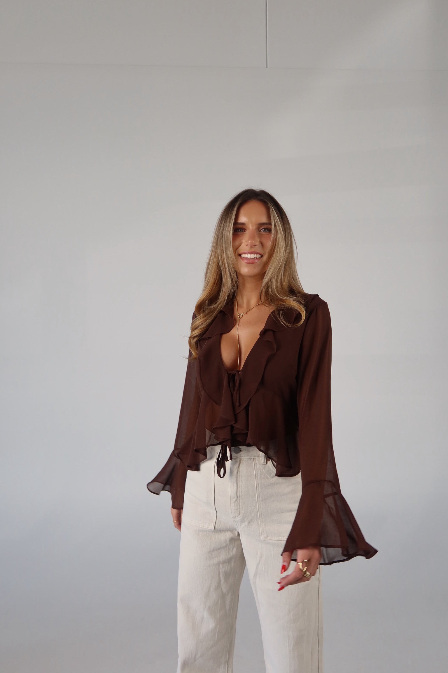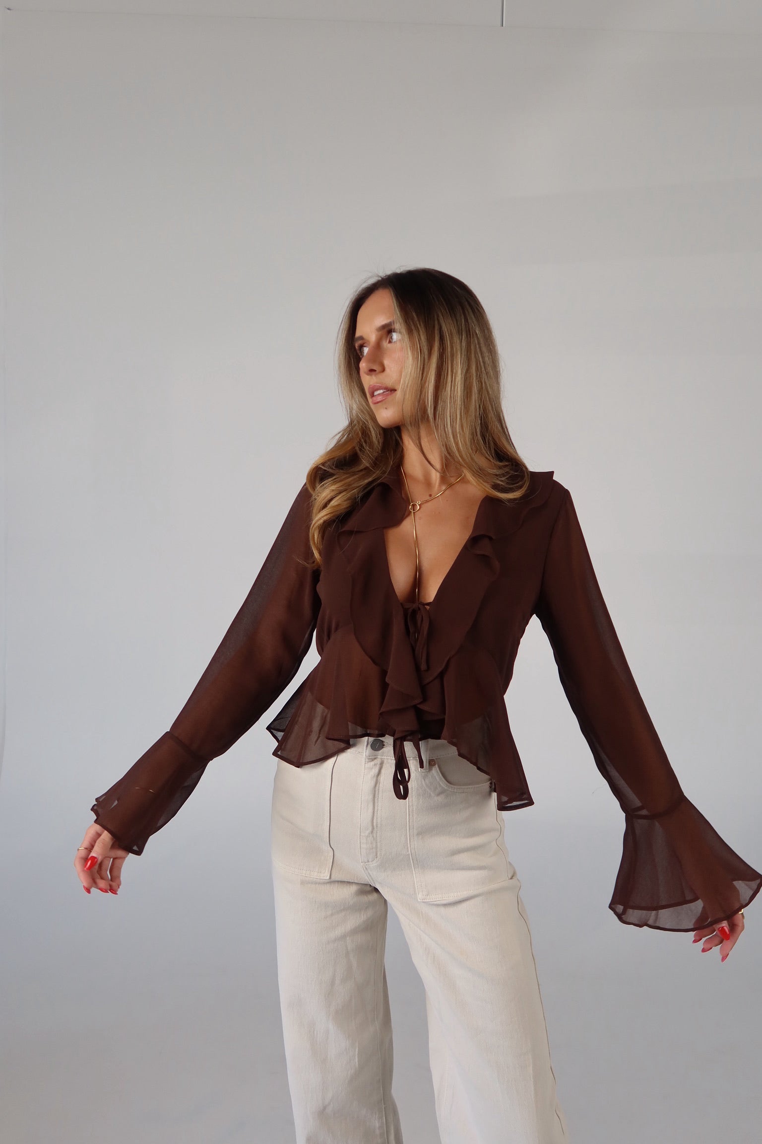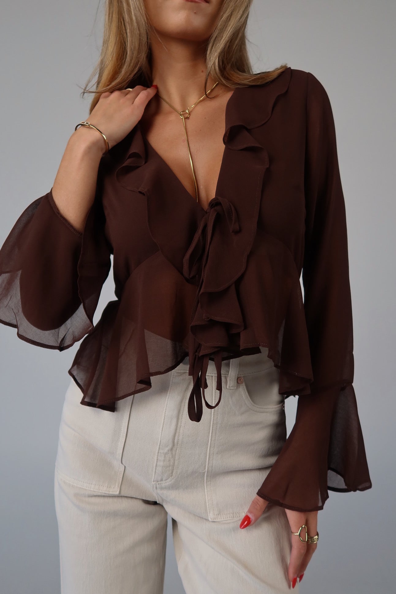 Brown Chiffon Ruffled Tie-Front Top, Lightweight Chiffon, Ruffled Details, Feminine Charm, Low-Cut Neckline, Self-Tie Front, Day-to-Night Style, Elegant and Alluring, Effortlessly Chic.