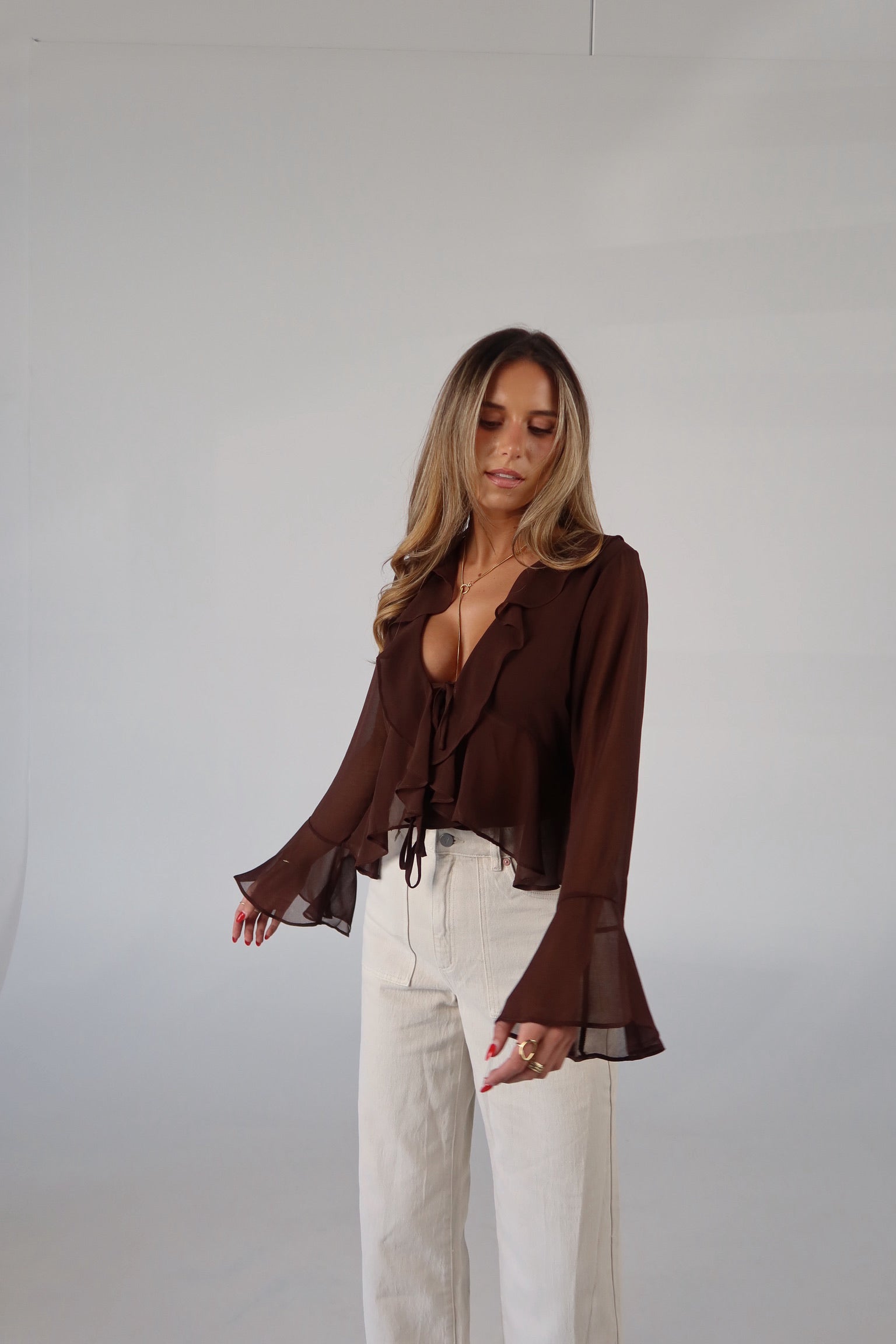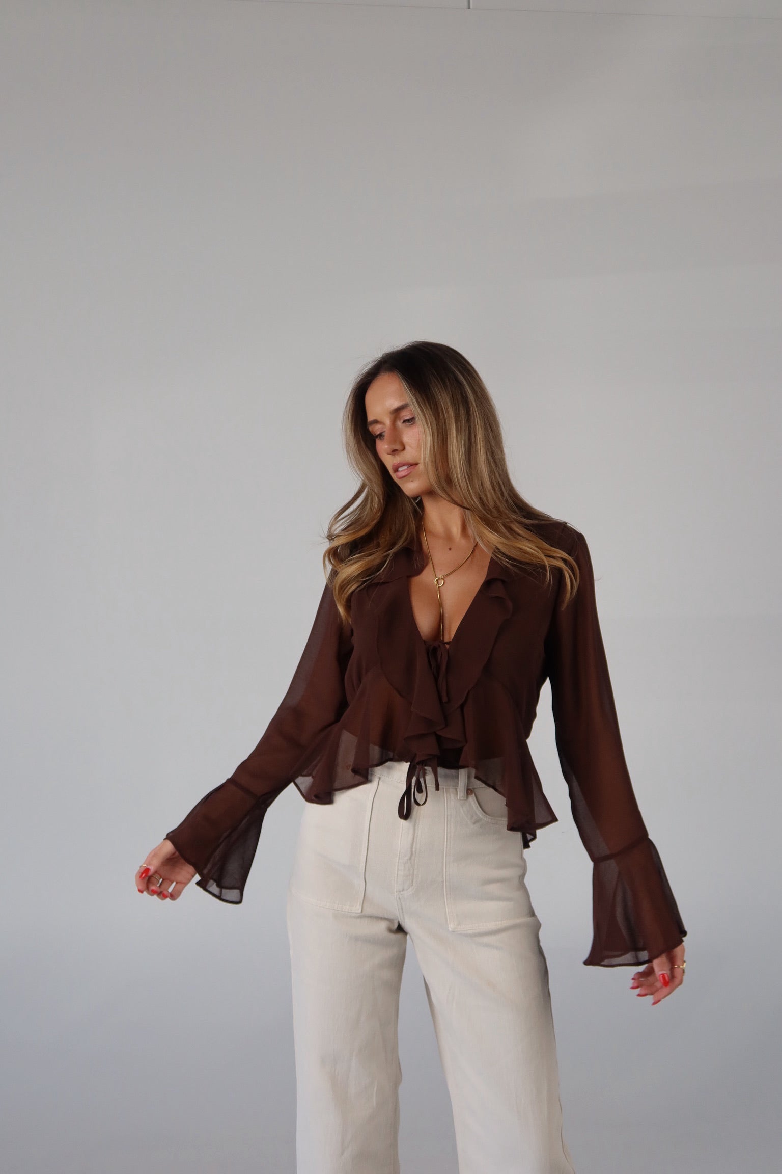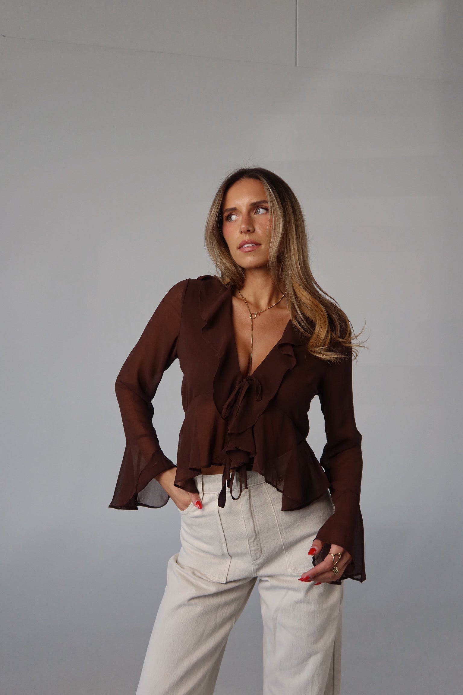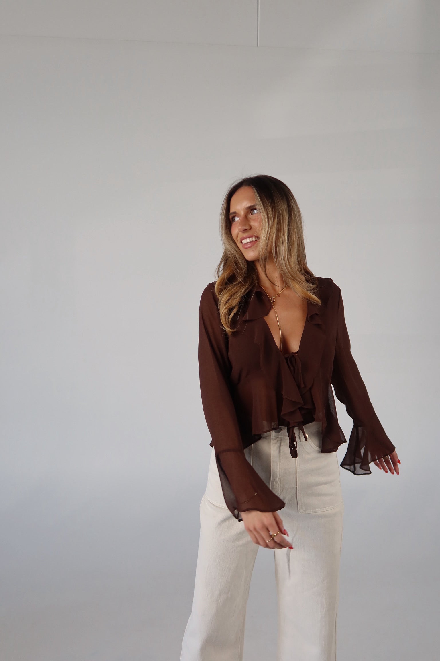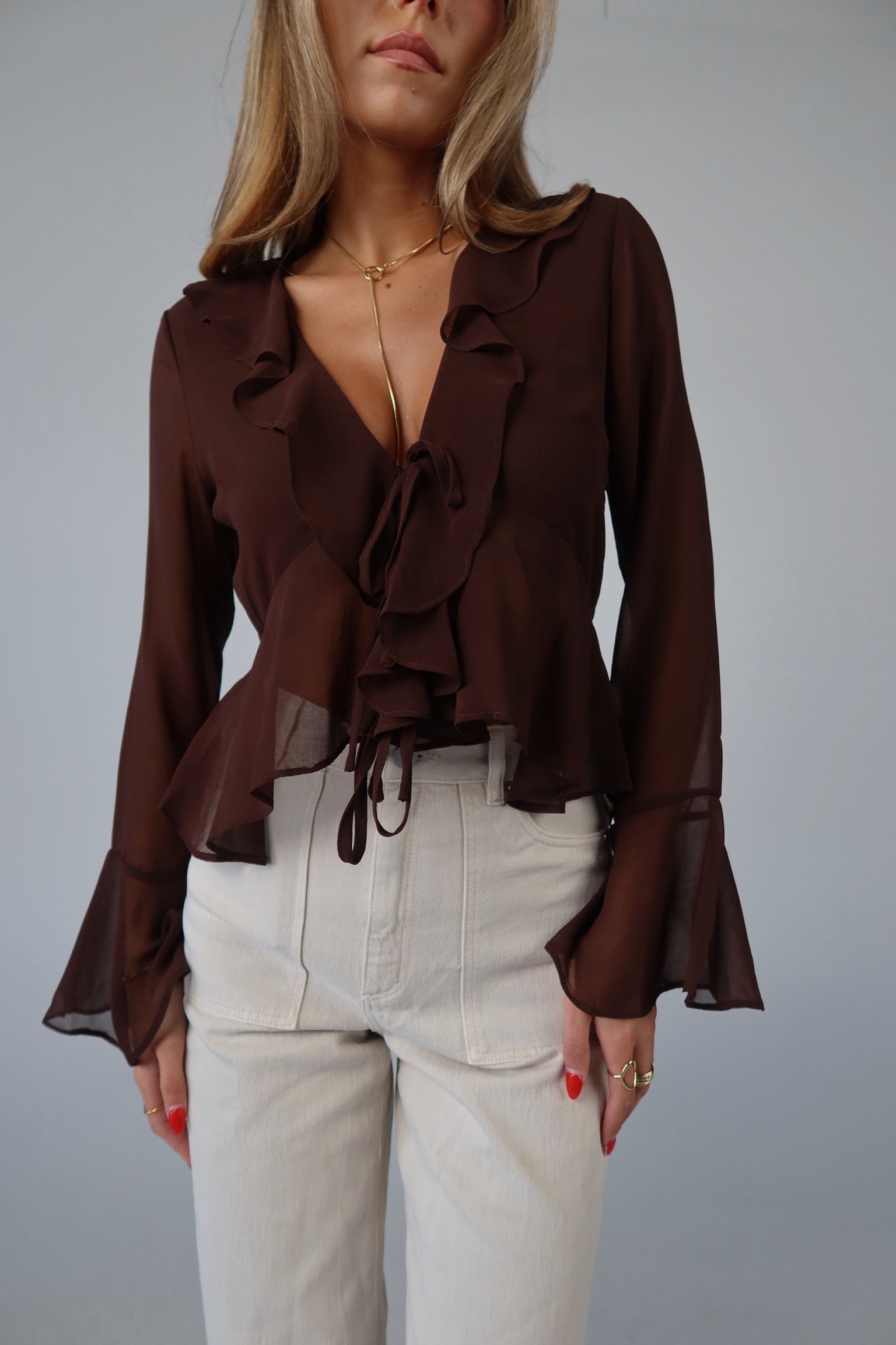 Brown Chiffon Ruffled Tie-Front Top, Lightweight Chiffon, Ruffled Details, Feminine Charm, Low-Cut Neckline, Self-Tie Front, Day-to-Night Style, Elegant and Alluring, Effortlessly Chic.