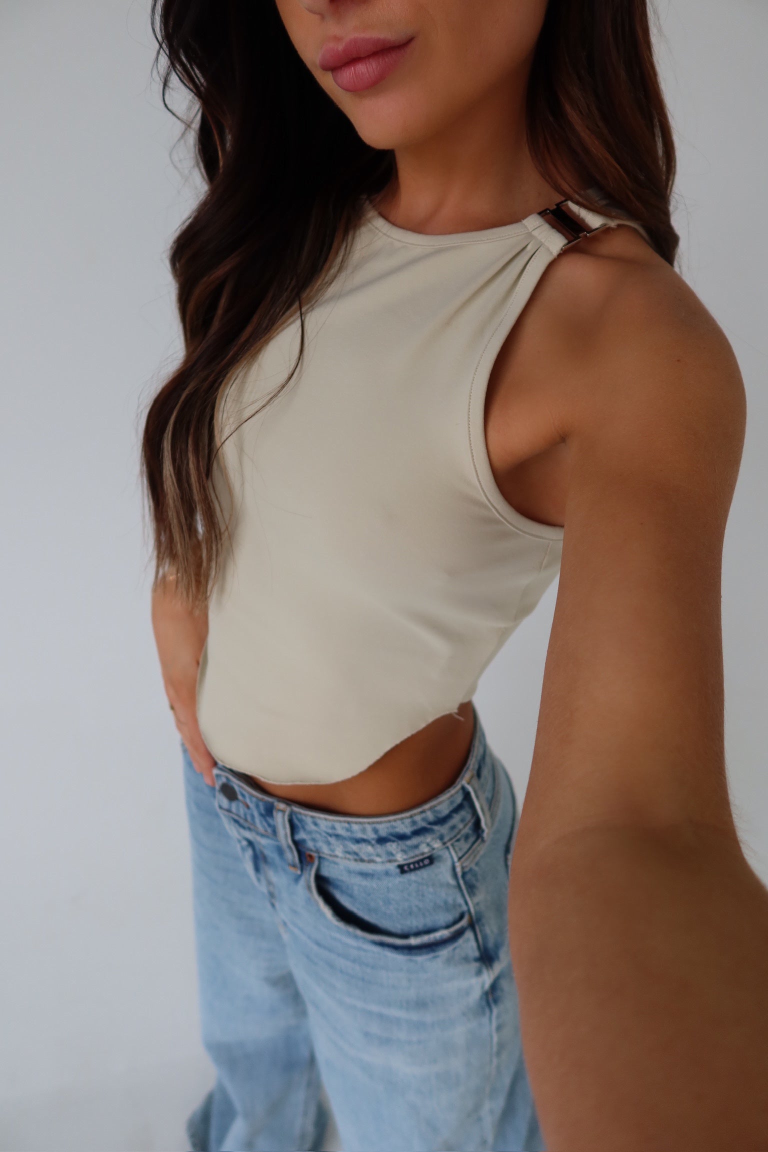 Discover the versatility of our Sand Round Hemline Tank, a timeless staple for your wardrobe. Boasting a classic round neckline, thick tank straps, and a cropped hemline, this top exudes simplicity and sophistication. Completed with a curved hemline for added style, it offers a comfortable fit true to size. Perfect for effortless styling and layering, the Sand Round Hemline Tank is a must-have essential for any wardrobe.