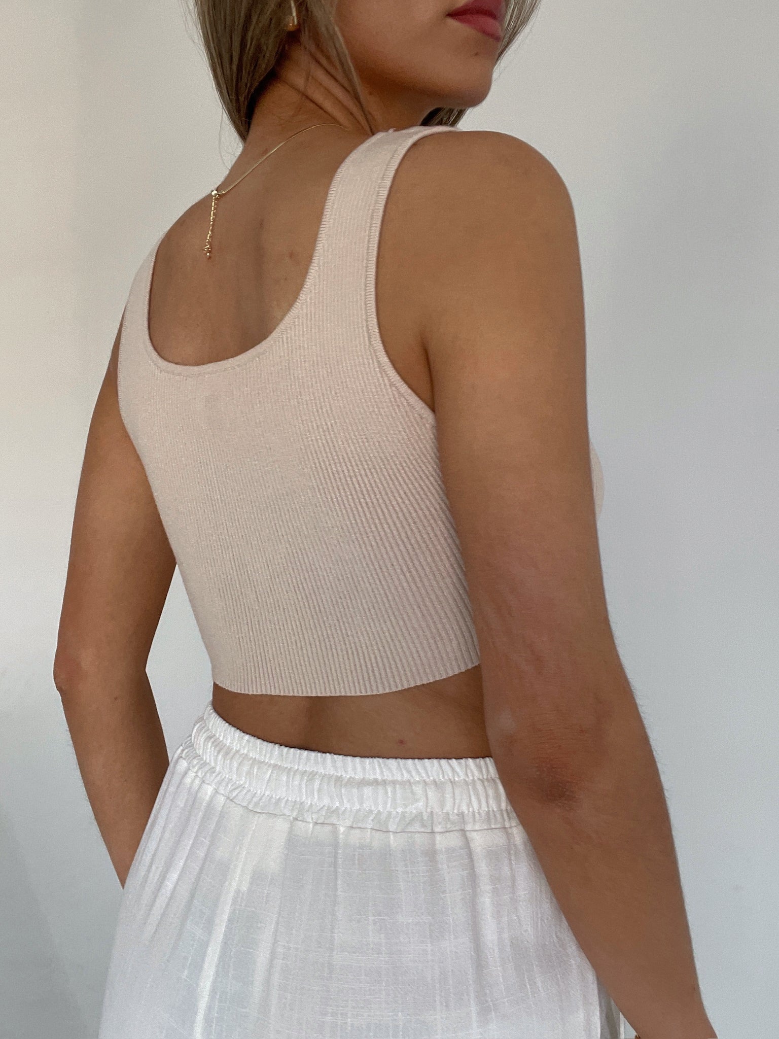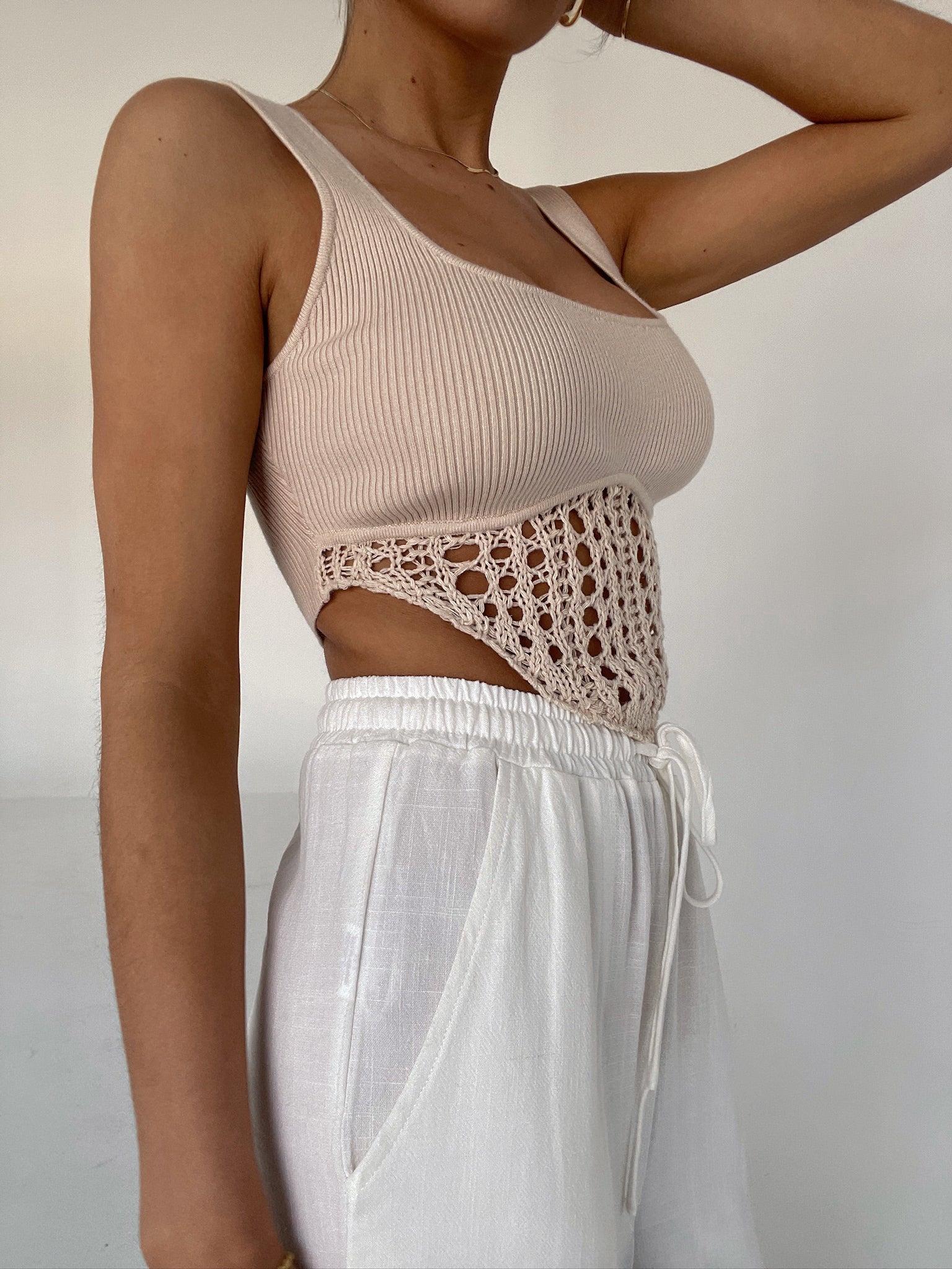 Presenting our Lana Crochet Tank Top, a uniquely designed asymmetrical hemline top that adds a touch of flair to your wardrobe. Crafted with thick fixed tank straps and a flattering scoop neckline, this top exudes effortless style and comfort. Below the bust, you'll find an open crochet knit design that gracefully transitions into an asymmetrical sheer hemline, adding an element of intrigue to your look. Plus, with its stretch fabric, this top ensures a comfortable and flexible fit for all-day wear.