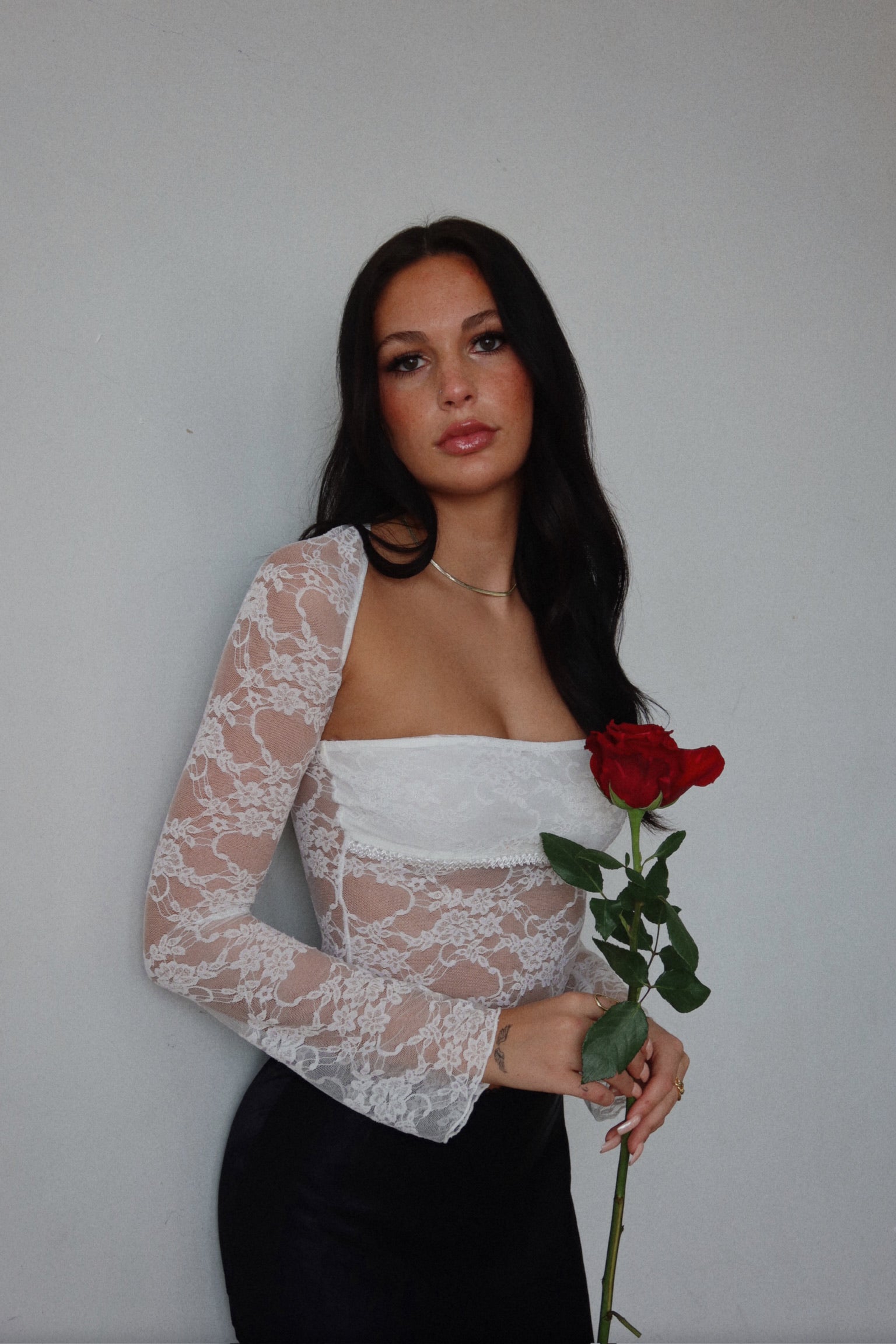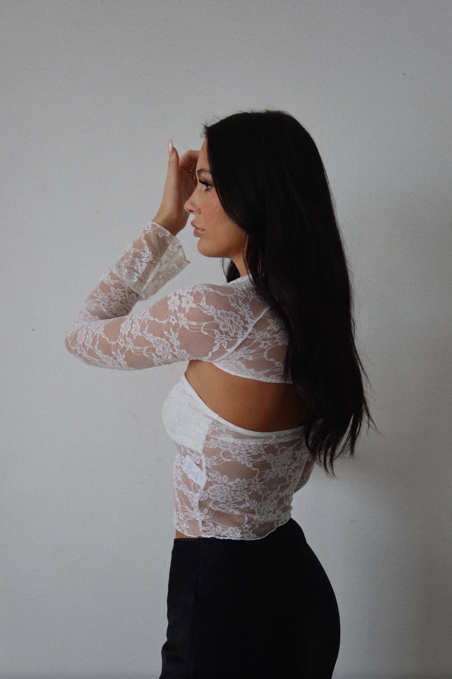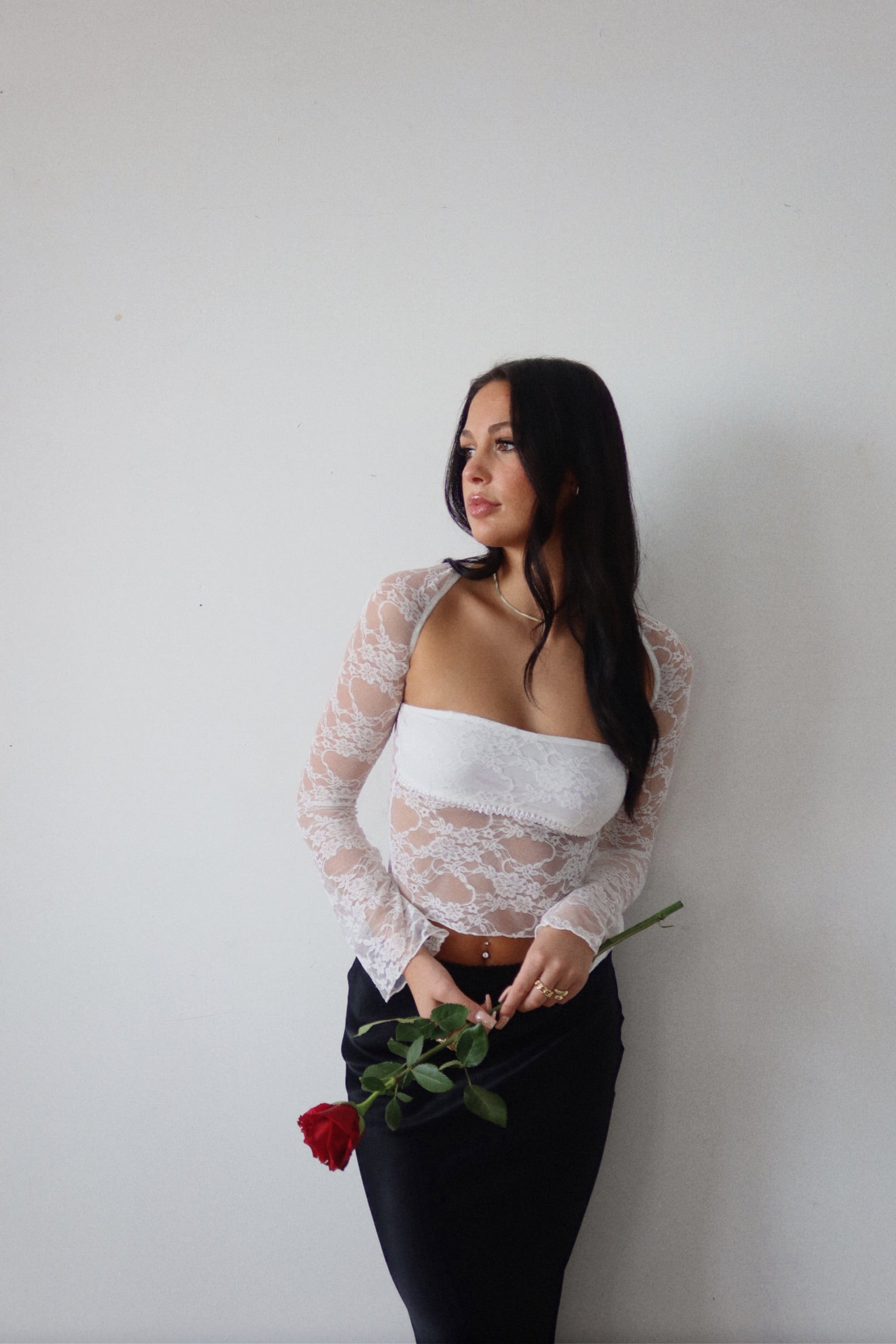 Our Shae Lace Two Piece Bolero Set is a strapless tube top and bolero overpiece set with a lined bust and the rest is a sheer lace fabric. The top features a white lace fabric with a lined bust and the rest of the top is sheer through the bodice, below the bustline is a satin trim detail. The top is strapless and the back is completely sheer. The bolero is the same lace material and is completely sheer over piece as well. The bolero is long-sleeved and has a wide cuff. This top runs true to size and has stretch throughout.