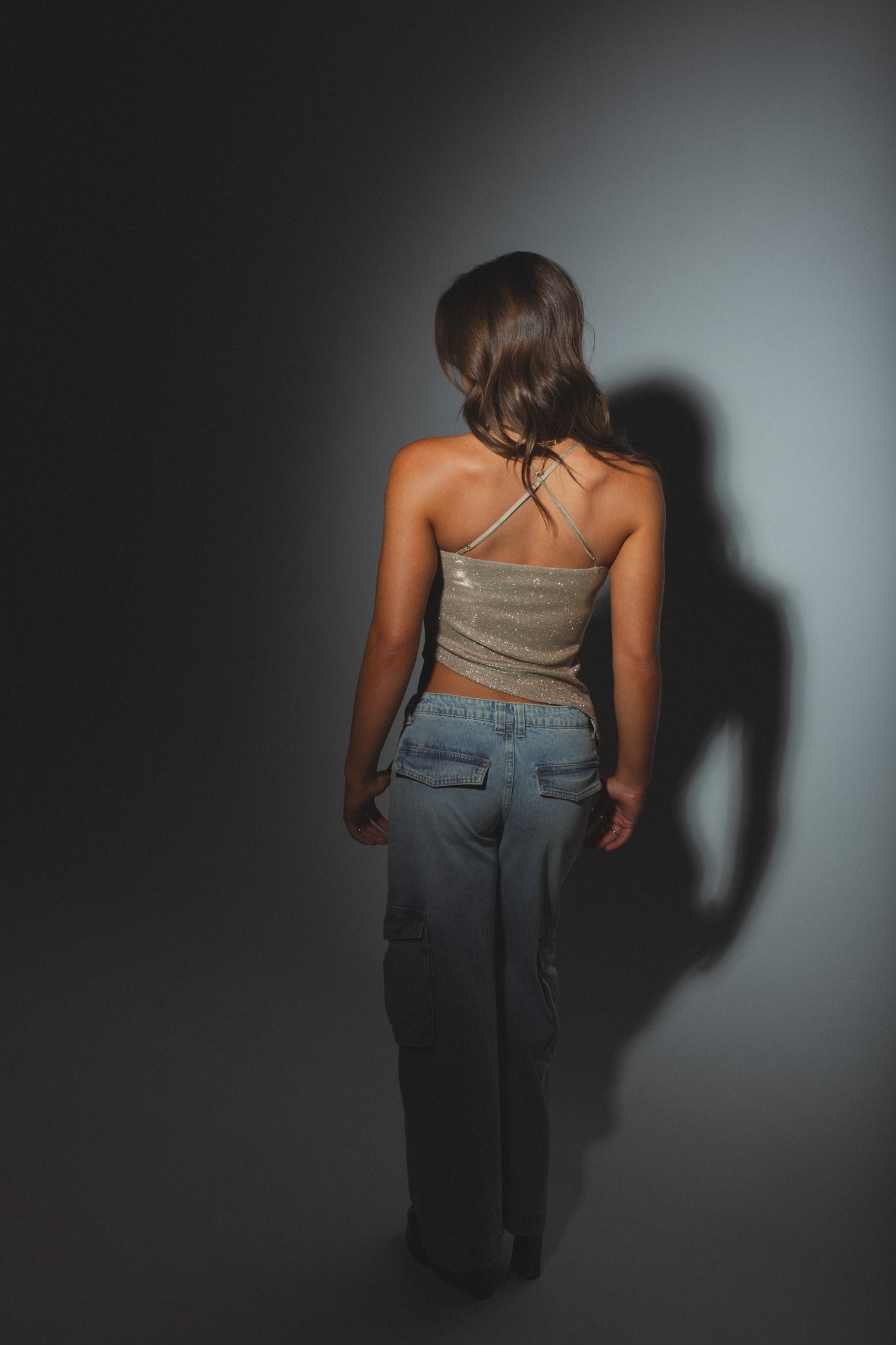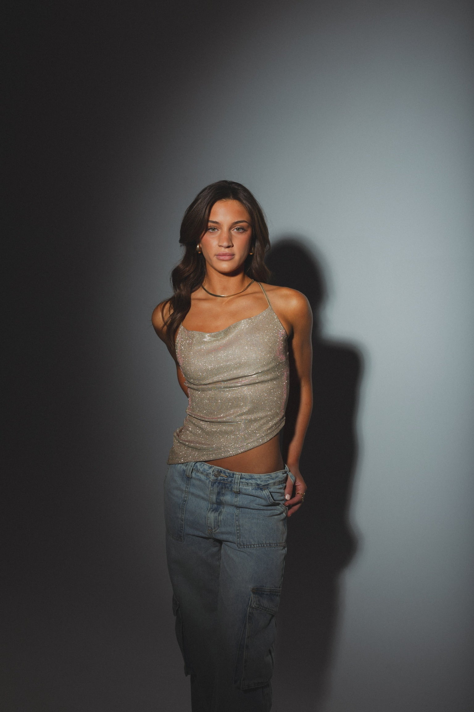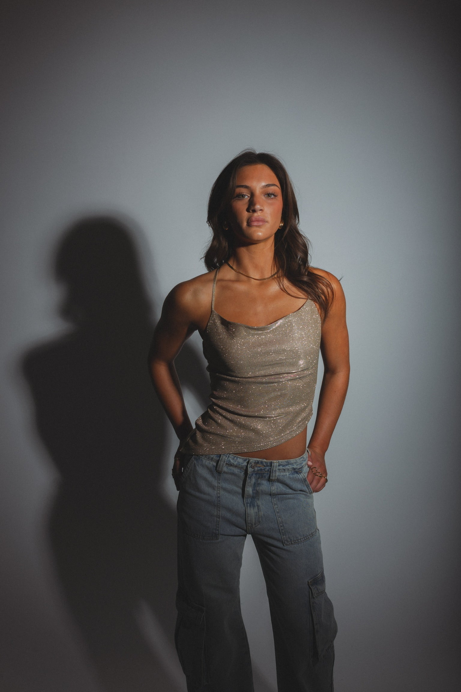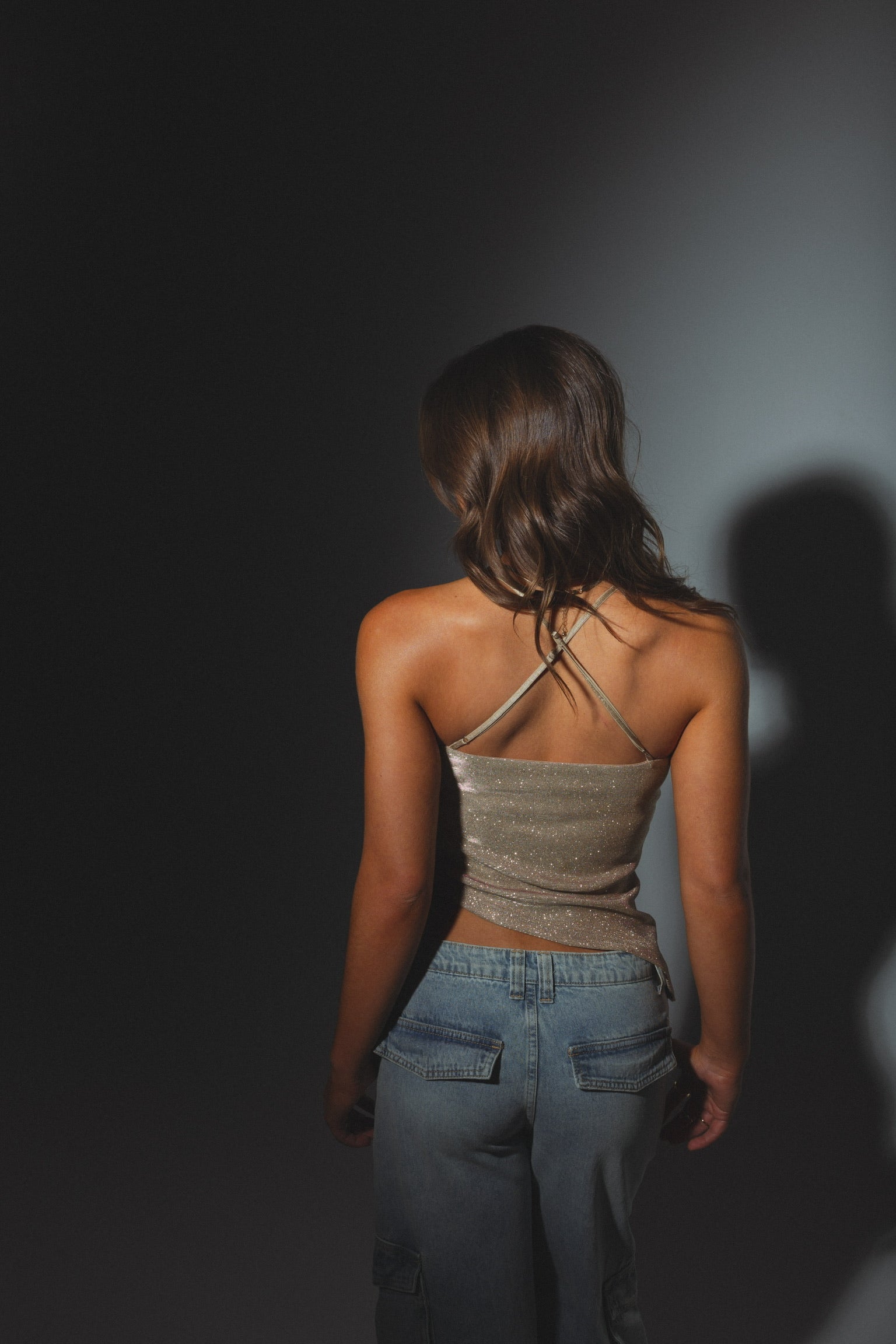 Our Cecelia Shimmer Knit Top is a golden metallic knit fabric top. This top has thin tank straps that are adjustable with an asymmetrical hemline. This top is lined and is such a flattering fit. This top has stretch and runs true to size.