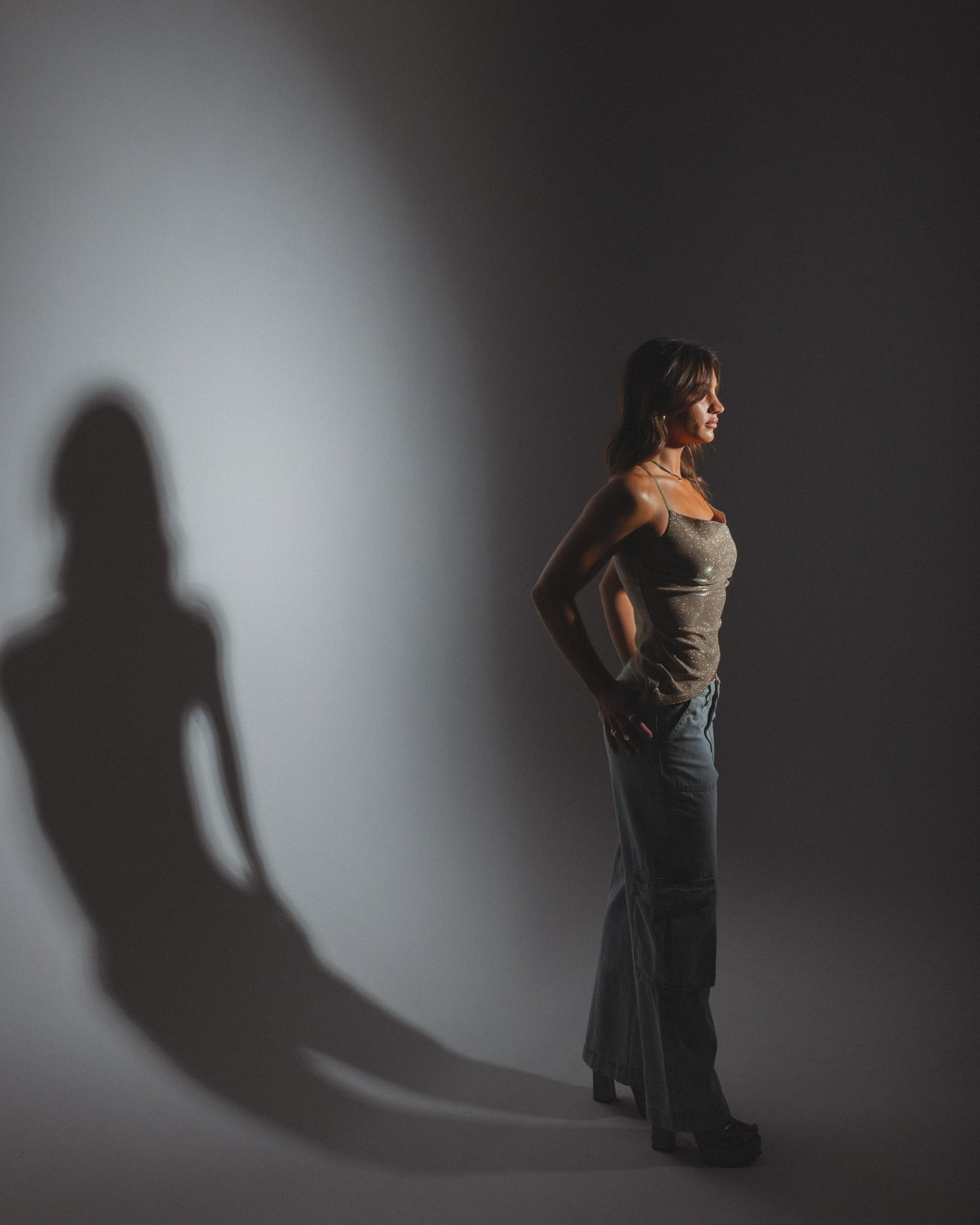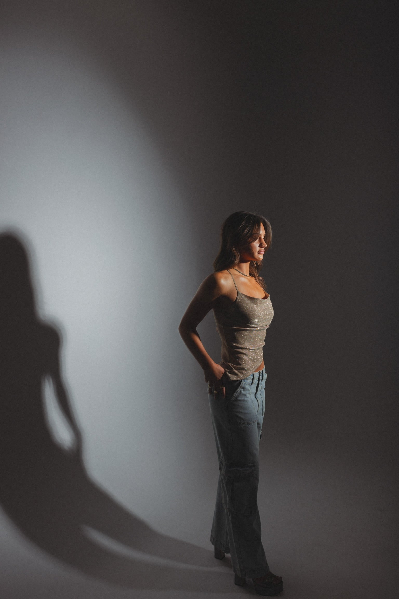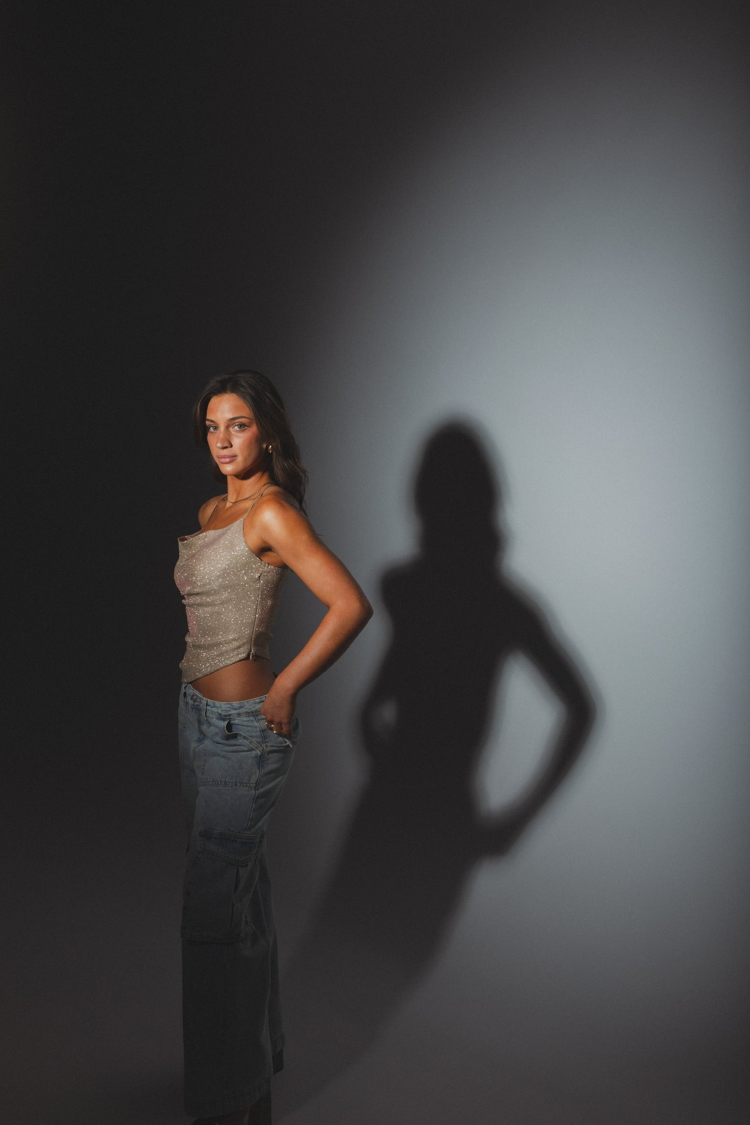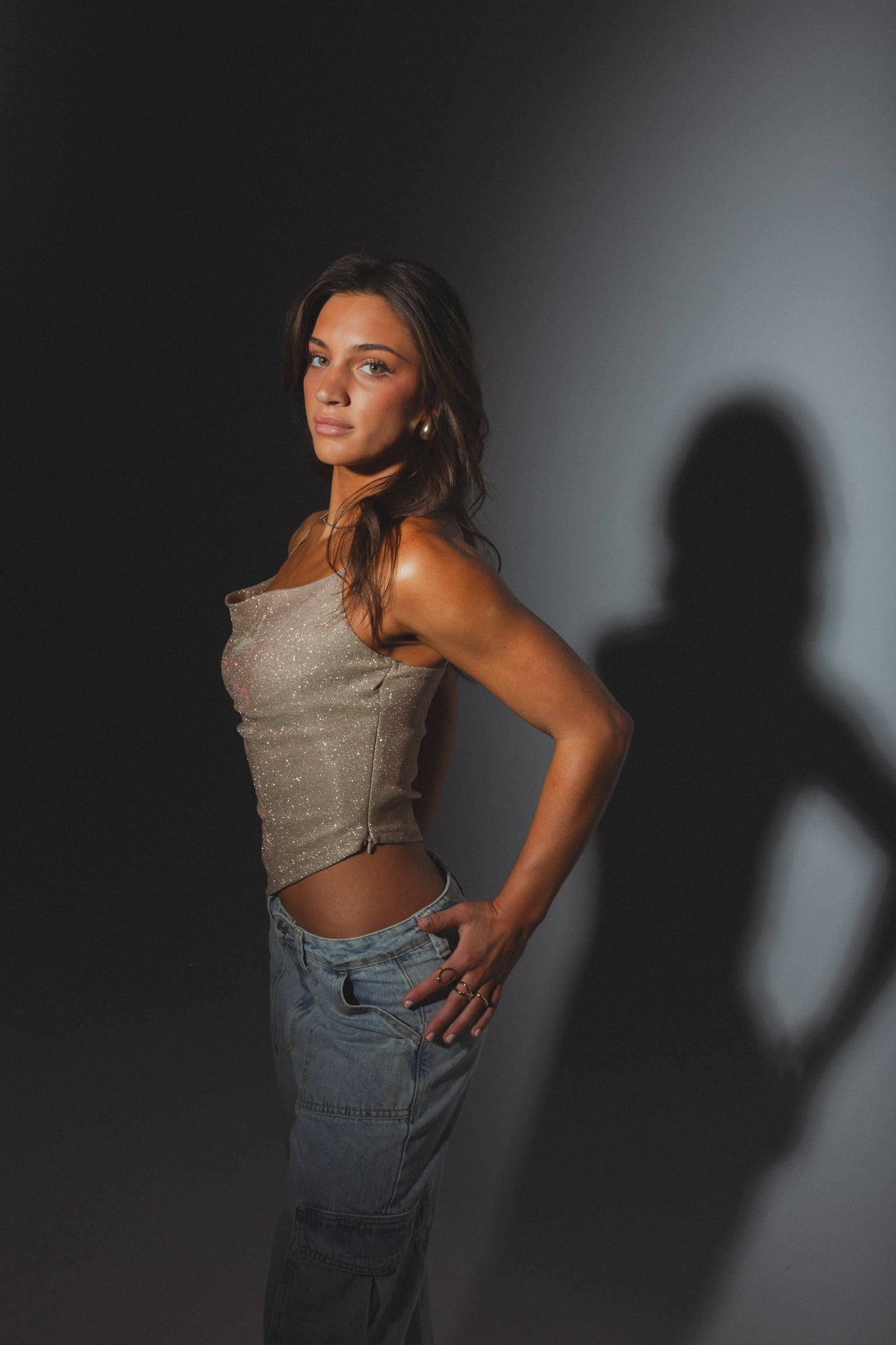 Our Cecelia Shimmer Knit Top is a golden metallic knit fabric top. This top has thin tank straps that are adjustable with an asymmetrical hemline. This top is lined and is such a flattering fit. This top has stretch and runs true to size.