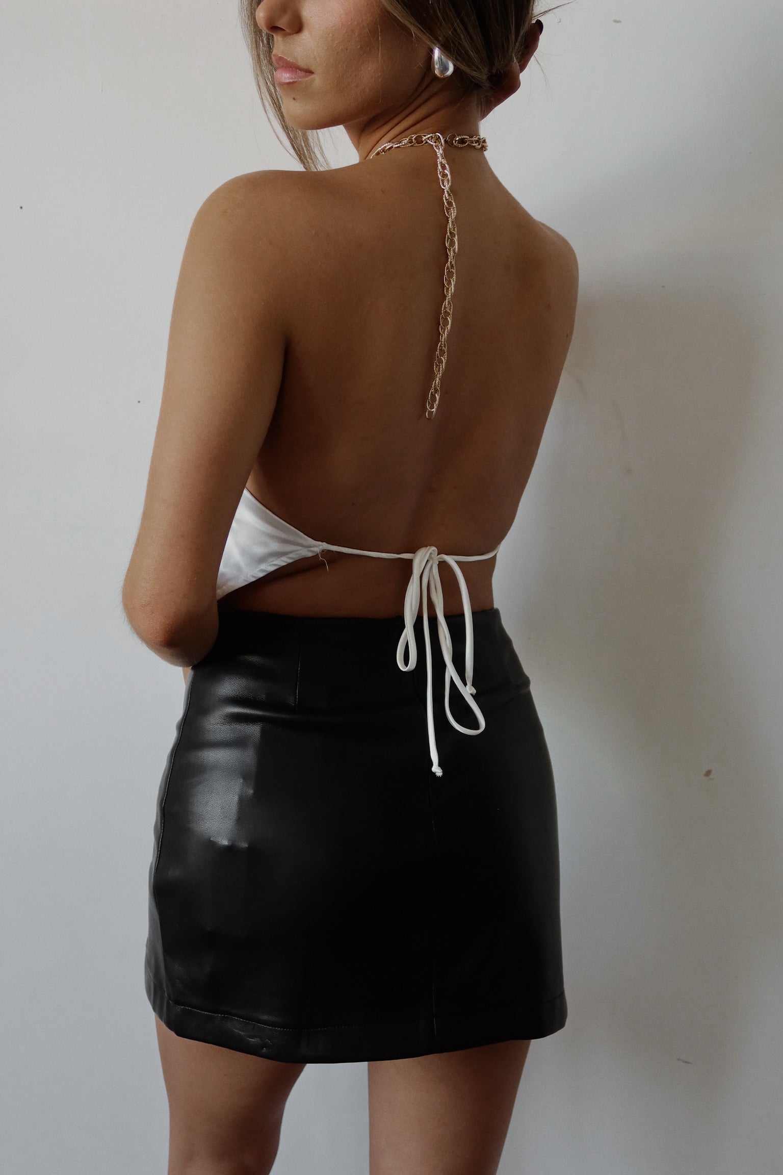 Our Charmaine Satin Bandana Top is a cropped halter top with a chain and hook closurearound the neck. The back has an open detail with two self tie string closures. The inside of this item is NOT lined. Would look super cute paired with any bottom of your choice!