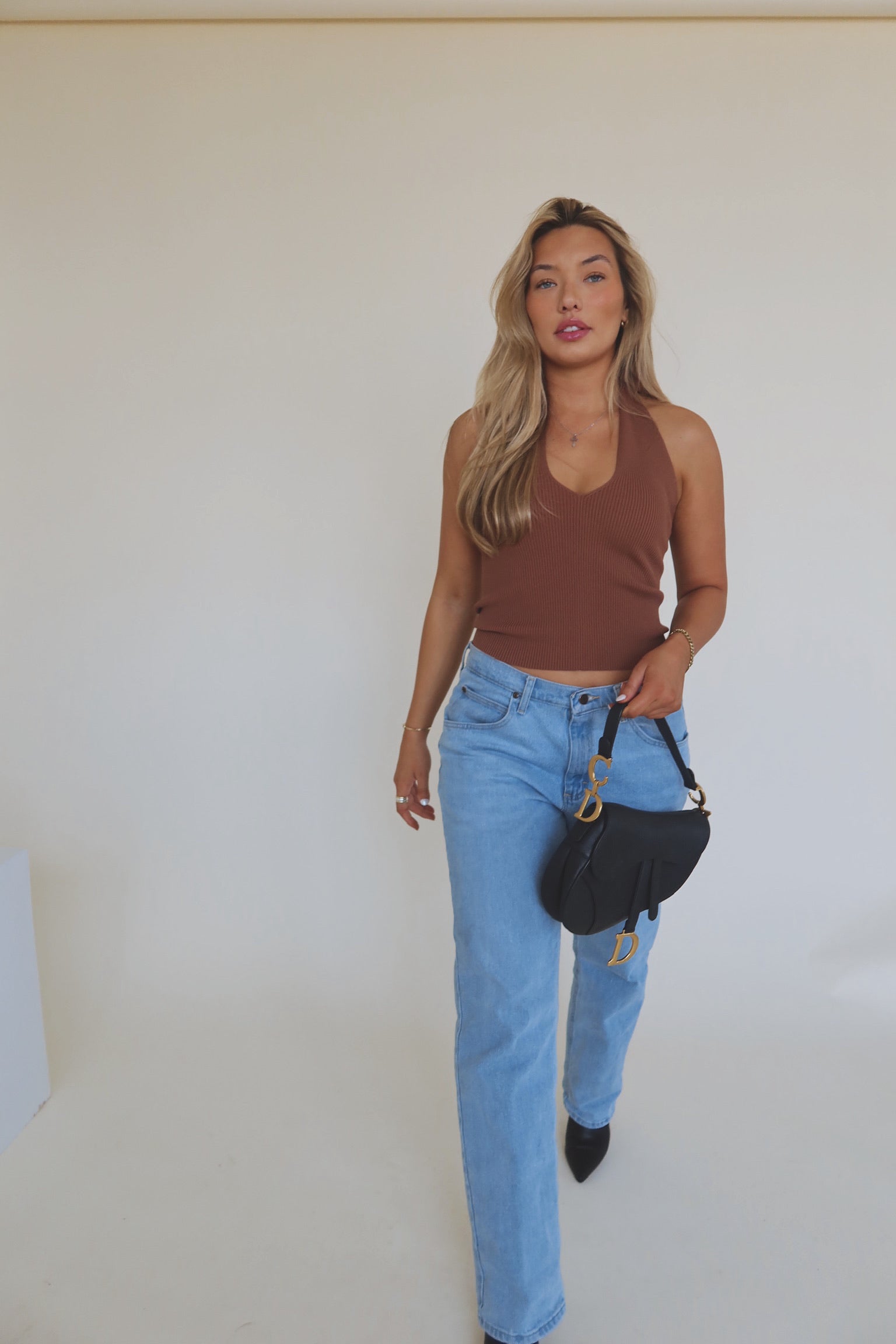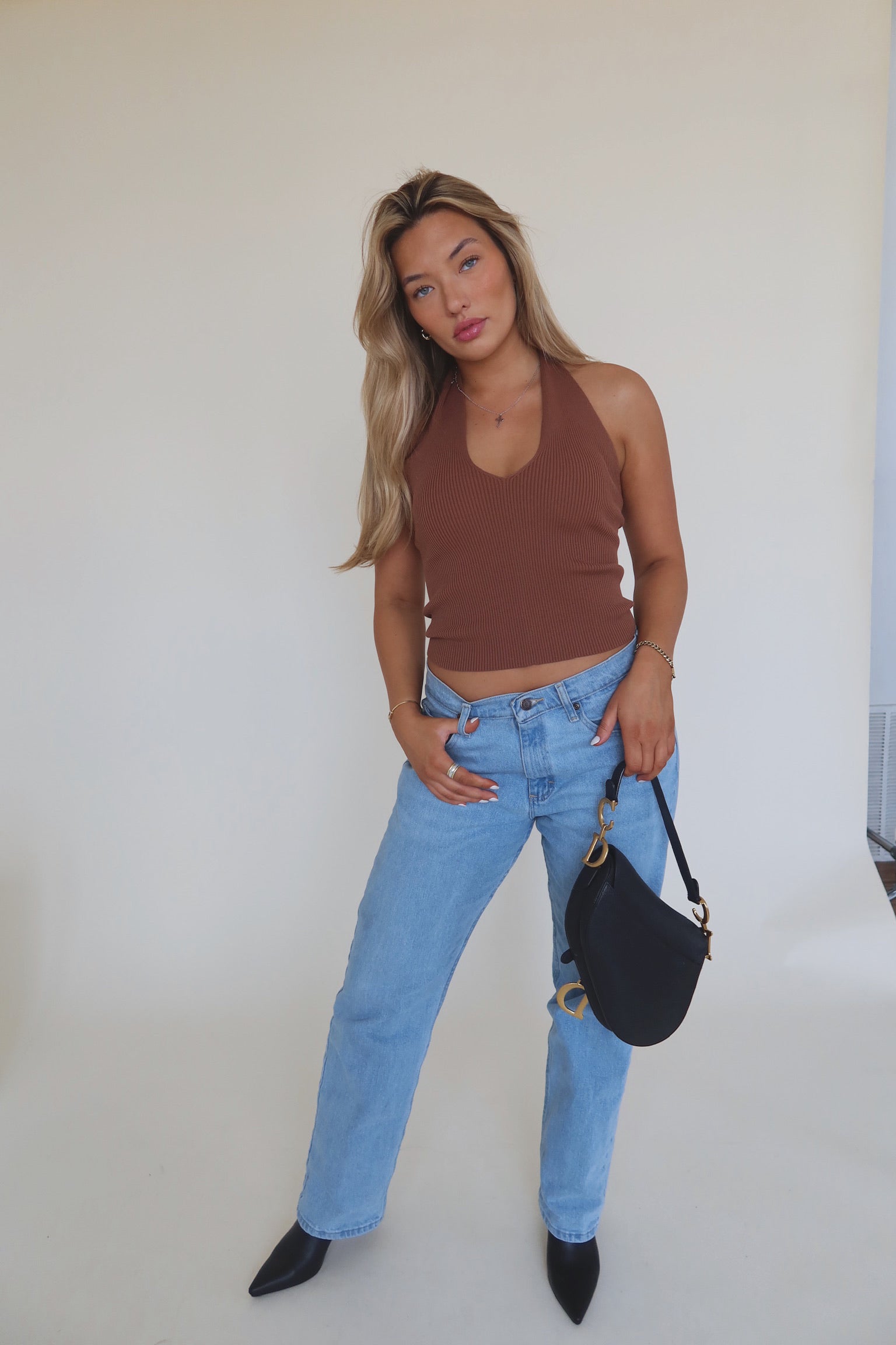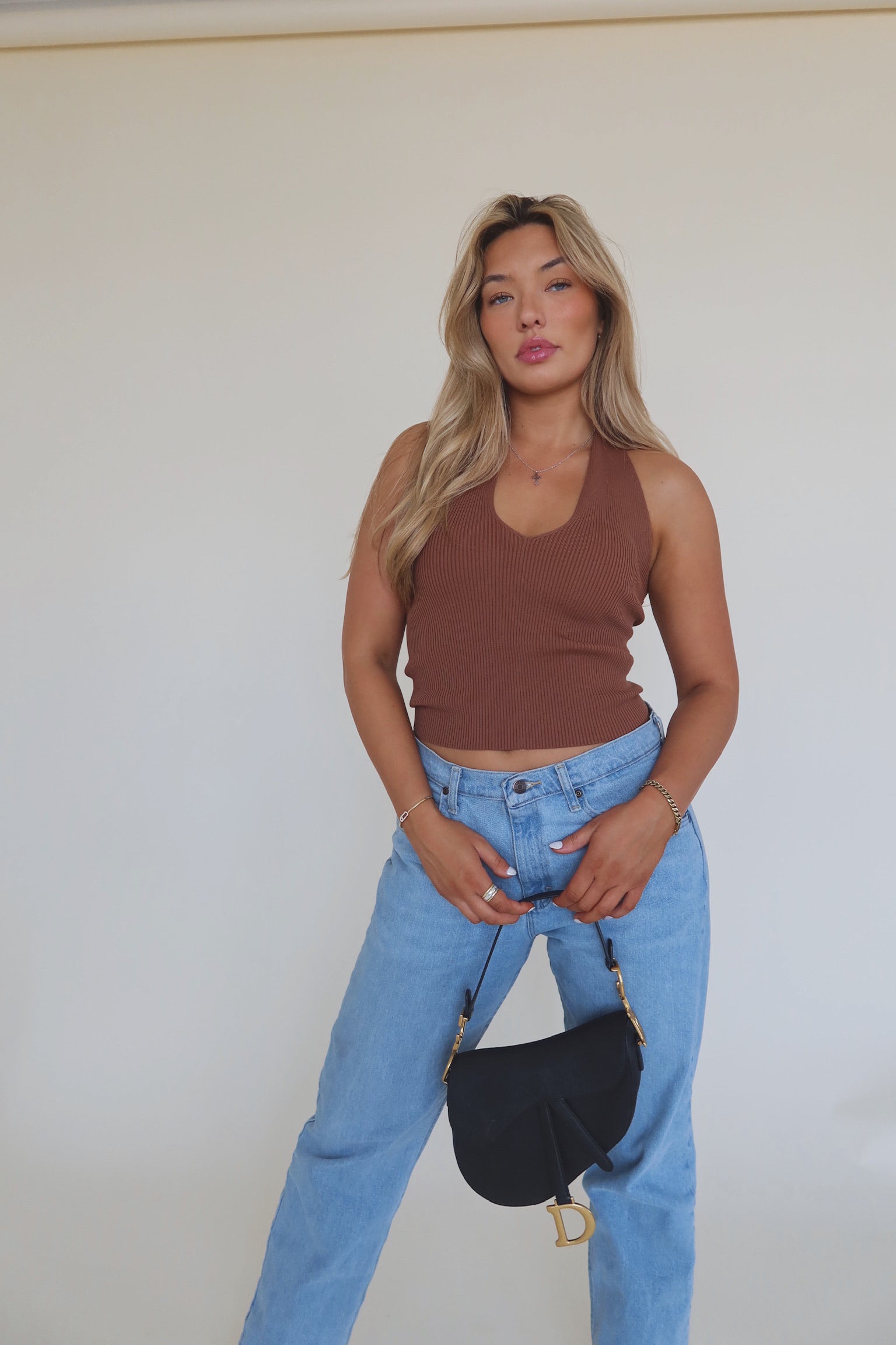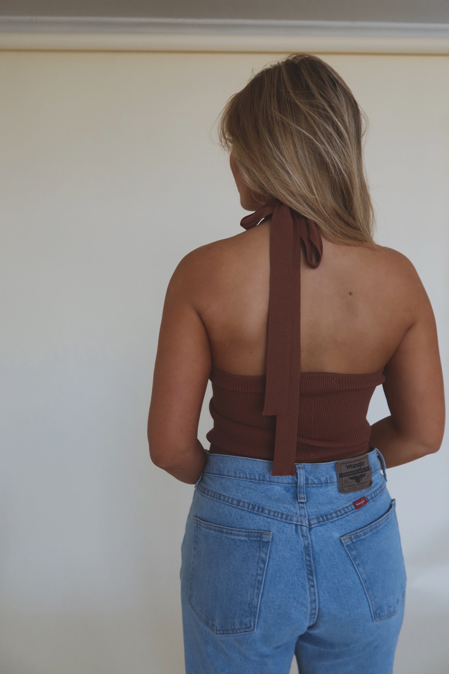 Our Rylee Halter Top is a chocolate brown ribbed top. This tops straps can be worn two ways, you can tie them back as a v-neck halter or criss cross in the front. There is plenty of stretch and runs true to size.