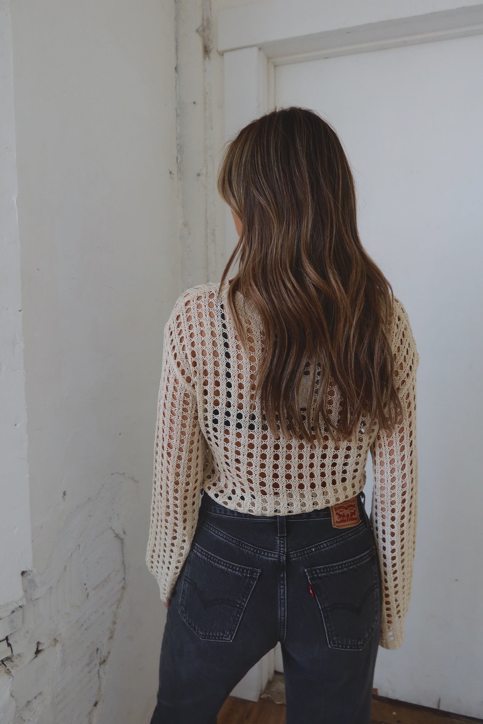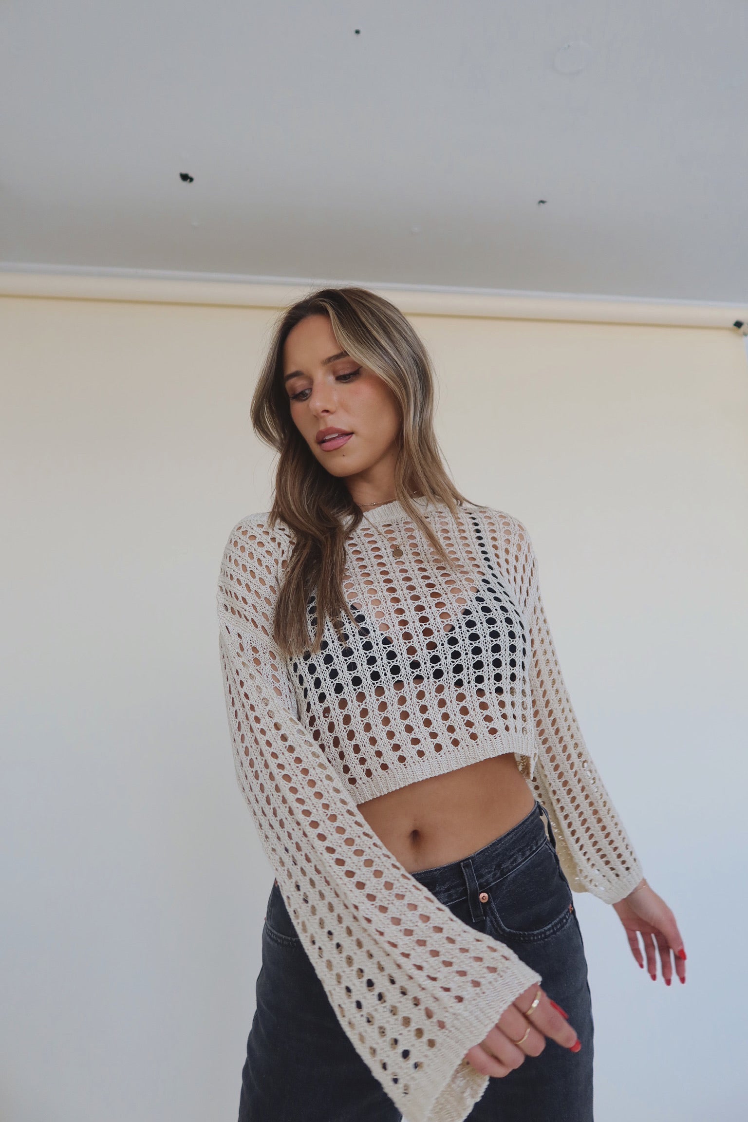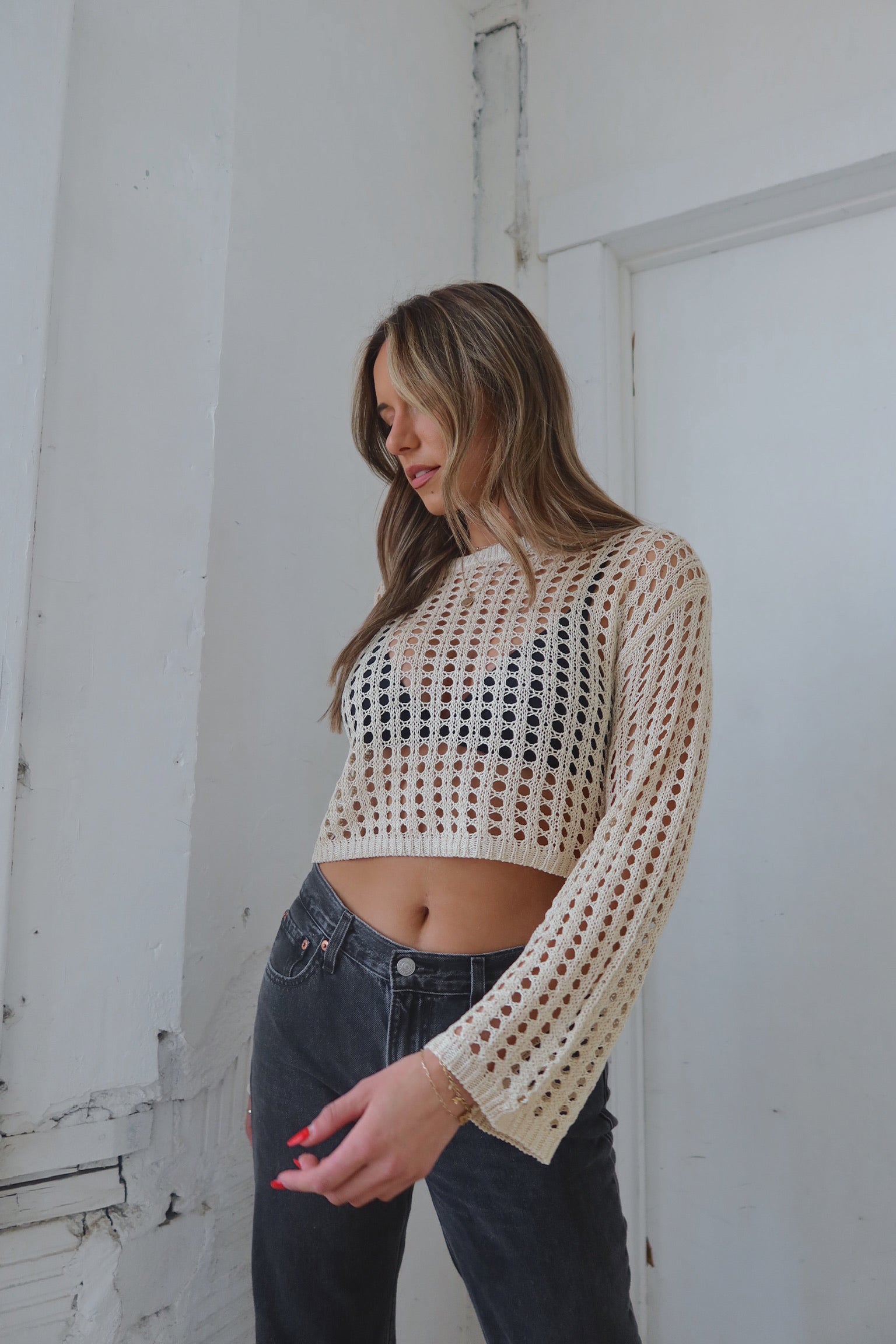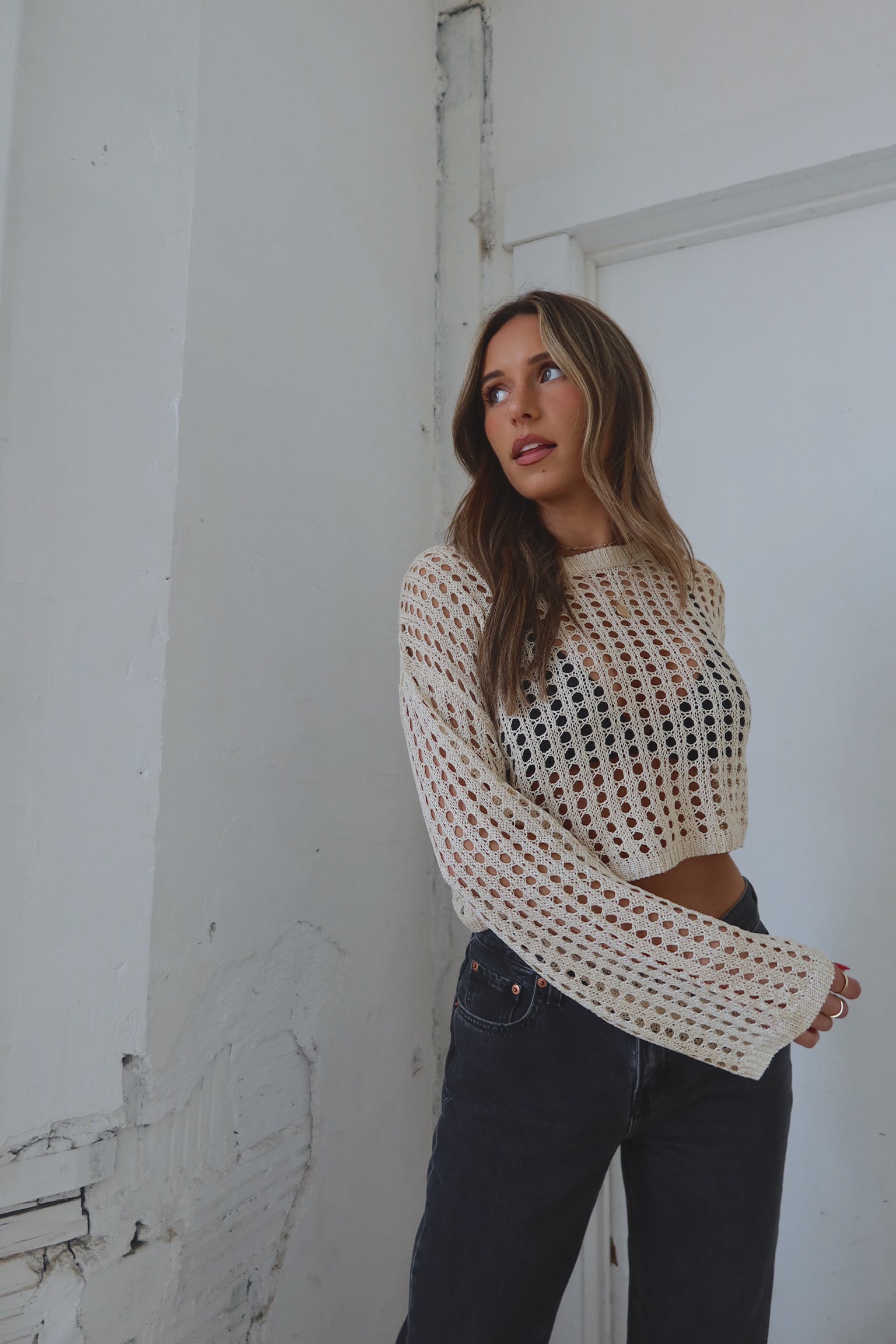Our Ellery Crochet Top s a lightweight knit longsleeve top. This adorable staple piece features delicate open crochet stitch, loose fit round neckline, and cropped fit. This top is the ultimate knit long sleeve that can be paired with a bralette and jean shorts for a night out or can make for the cutest swim cover up. This top has a relaxed fit and runs true to size.