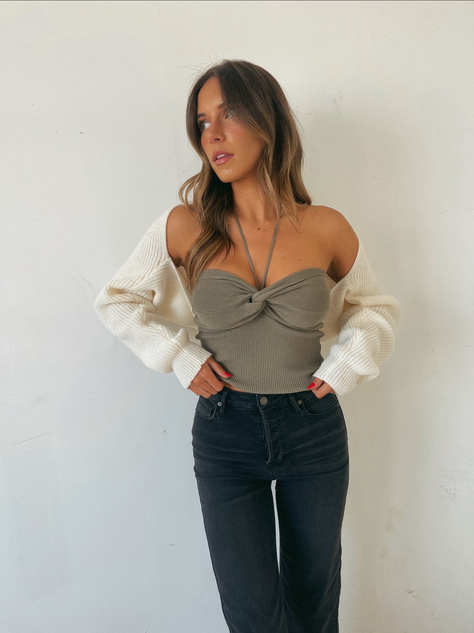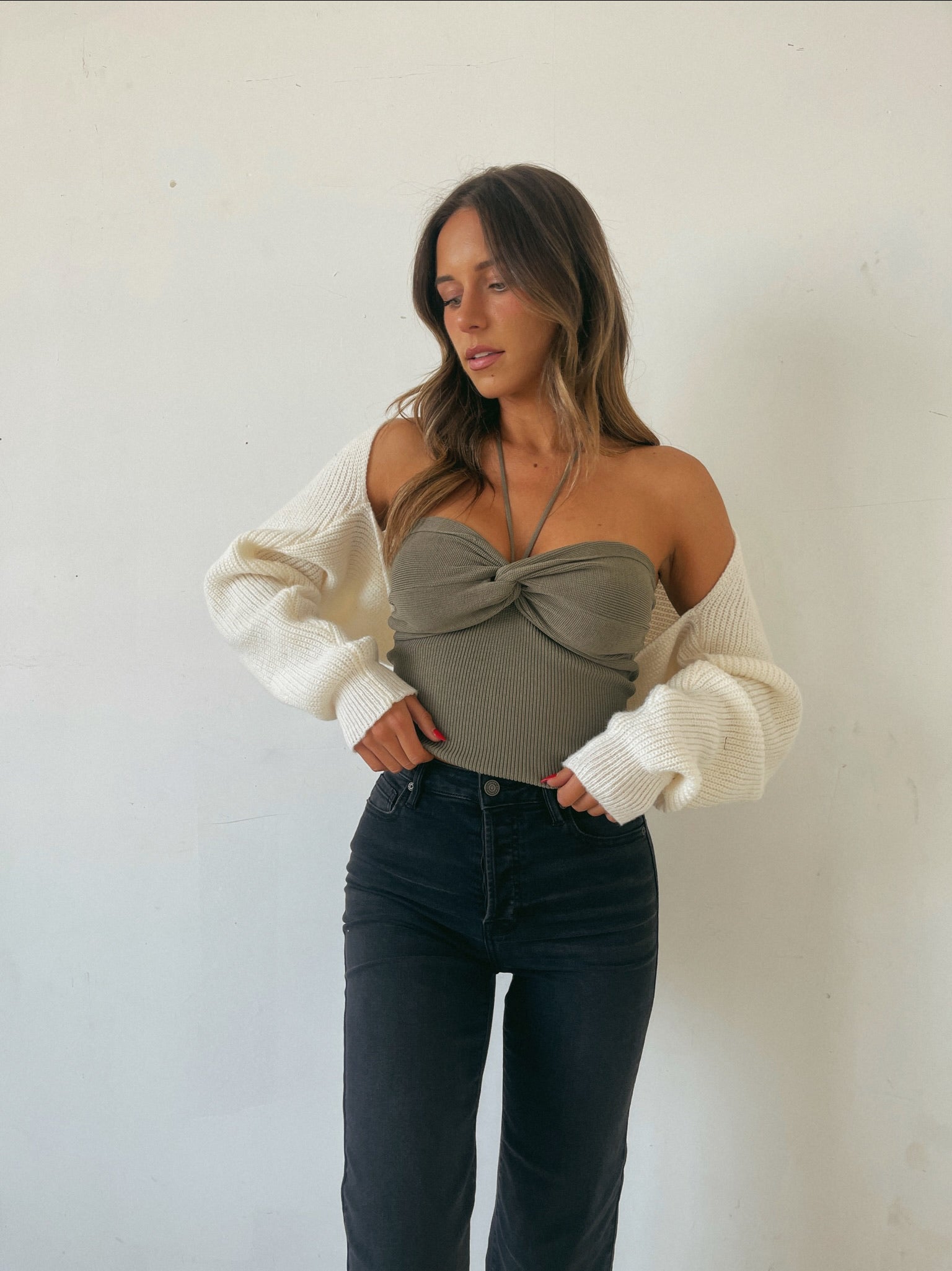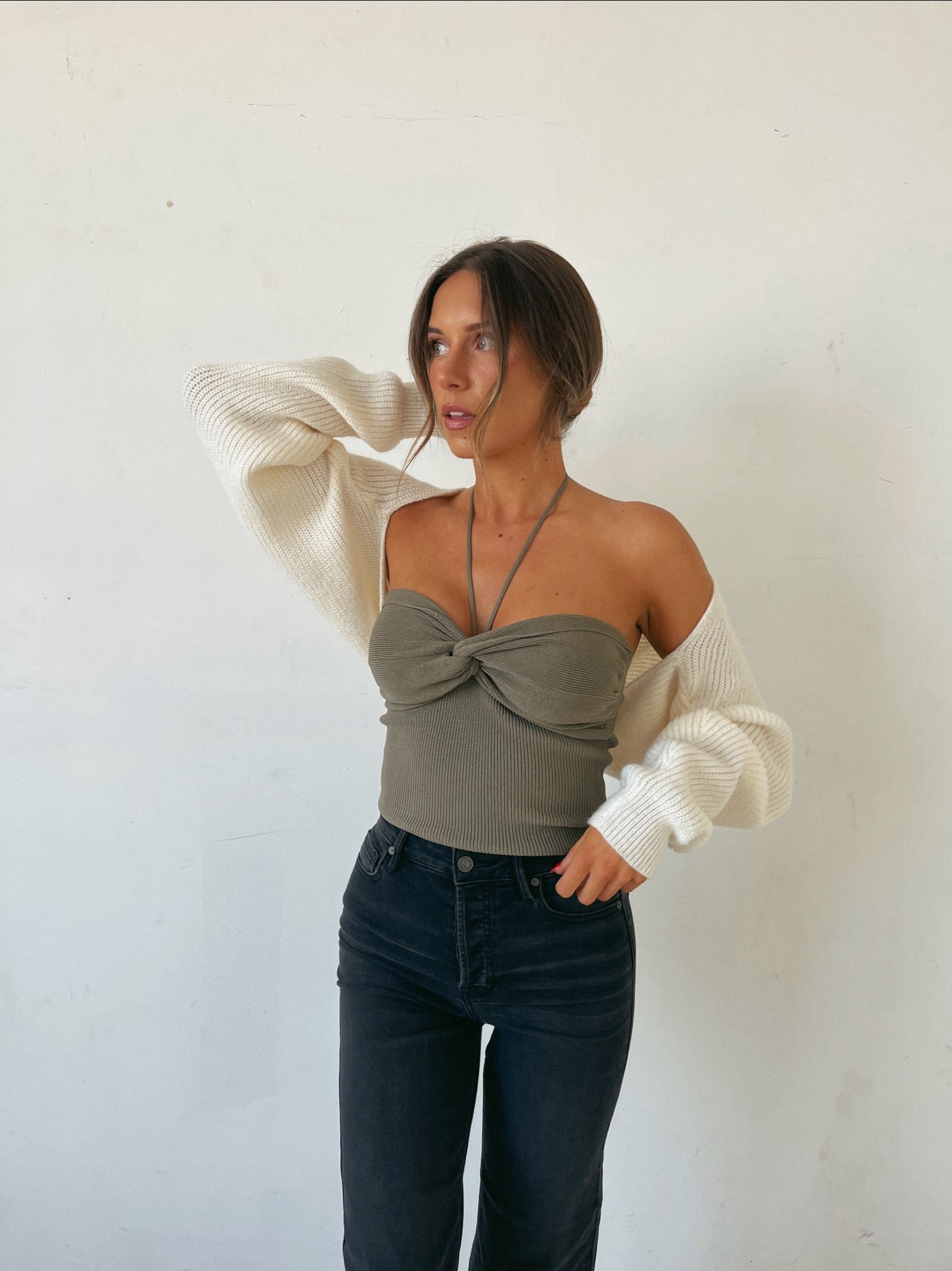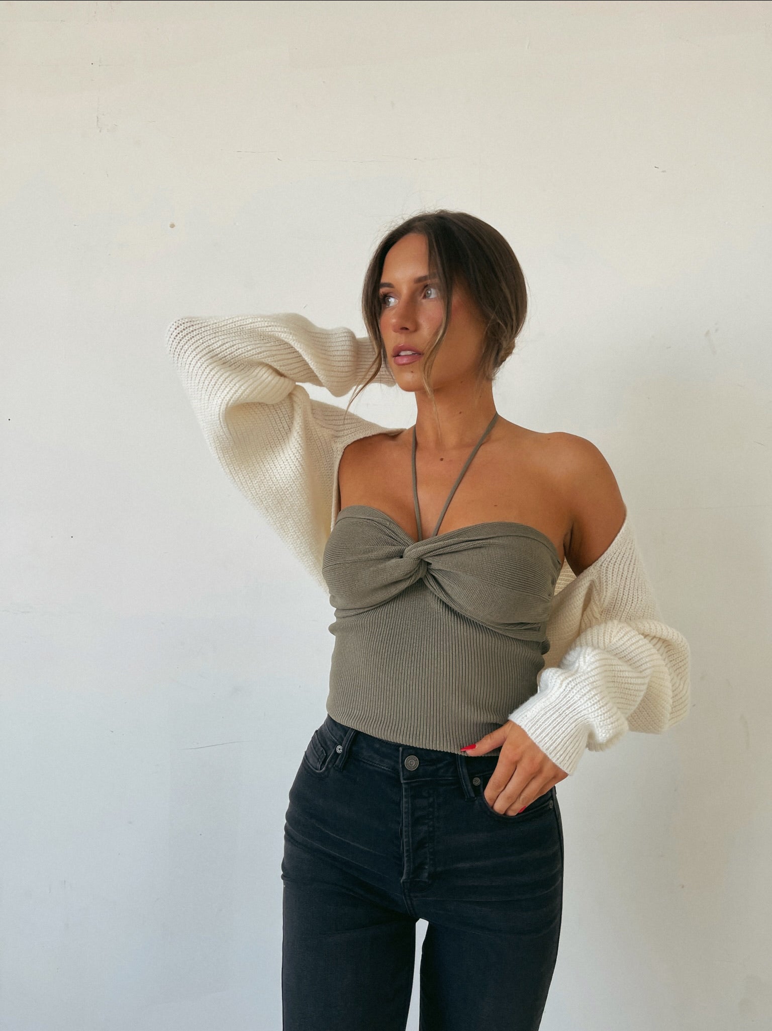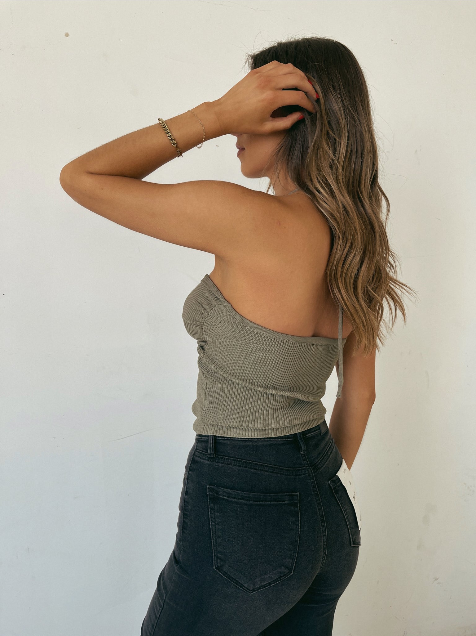 Our Remi Twist Front Halter Top is an Olive cropped tube top with a halter neckline. This top is made with soft textured knit material that has stretch to create a comforatble fit. This top features knotted detail in the bodice, pronounced bustline , and full length fit. This top features no slip grip along the neckline to keep it from slipping.